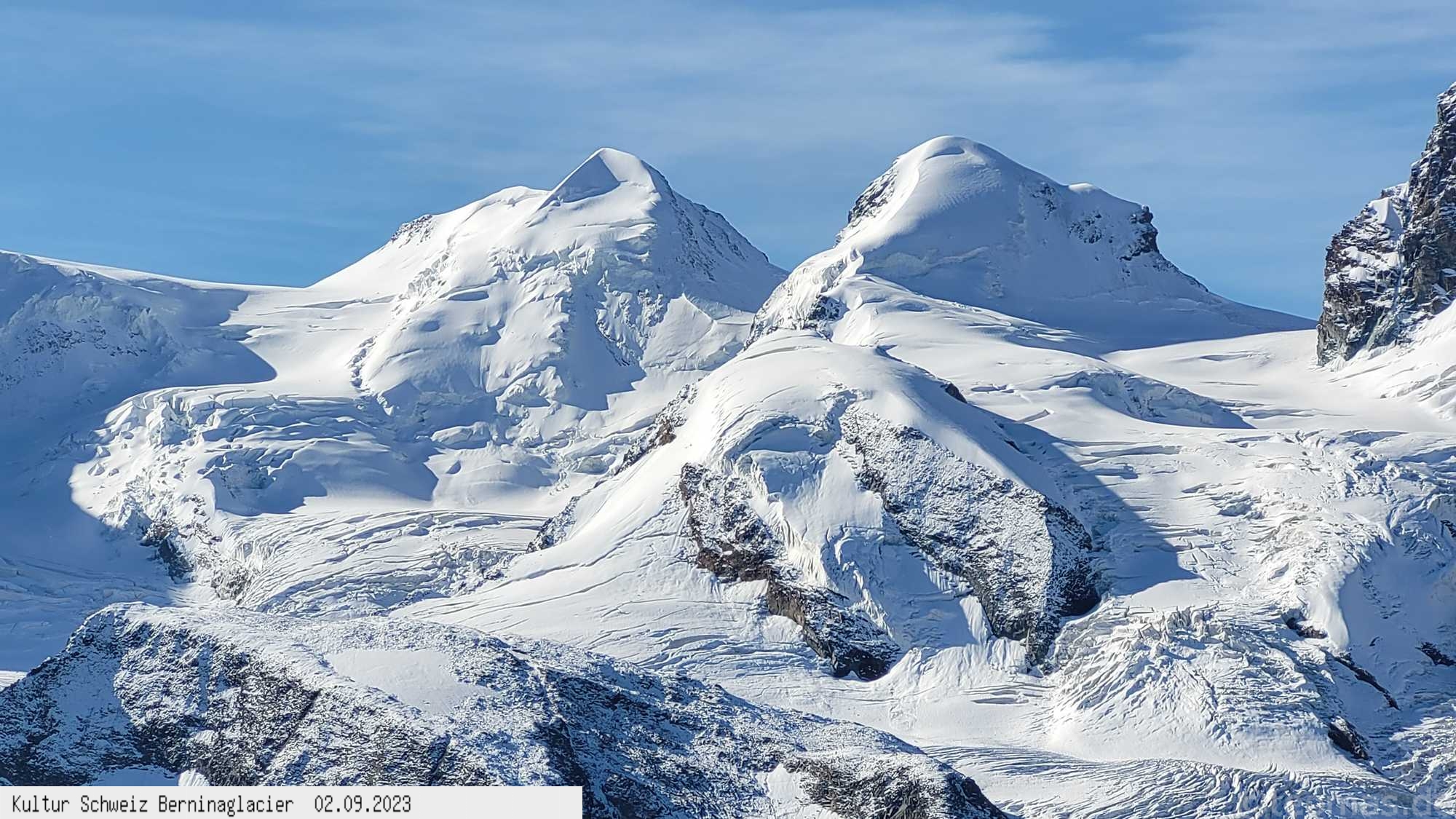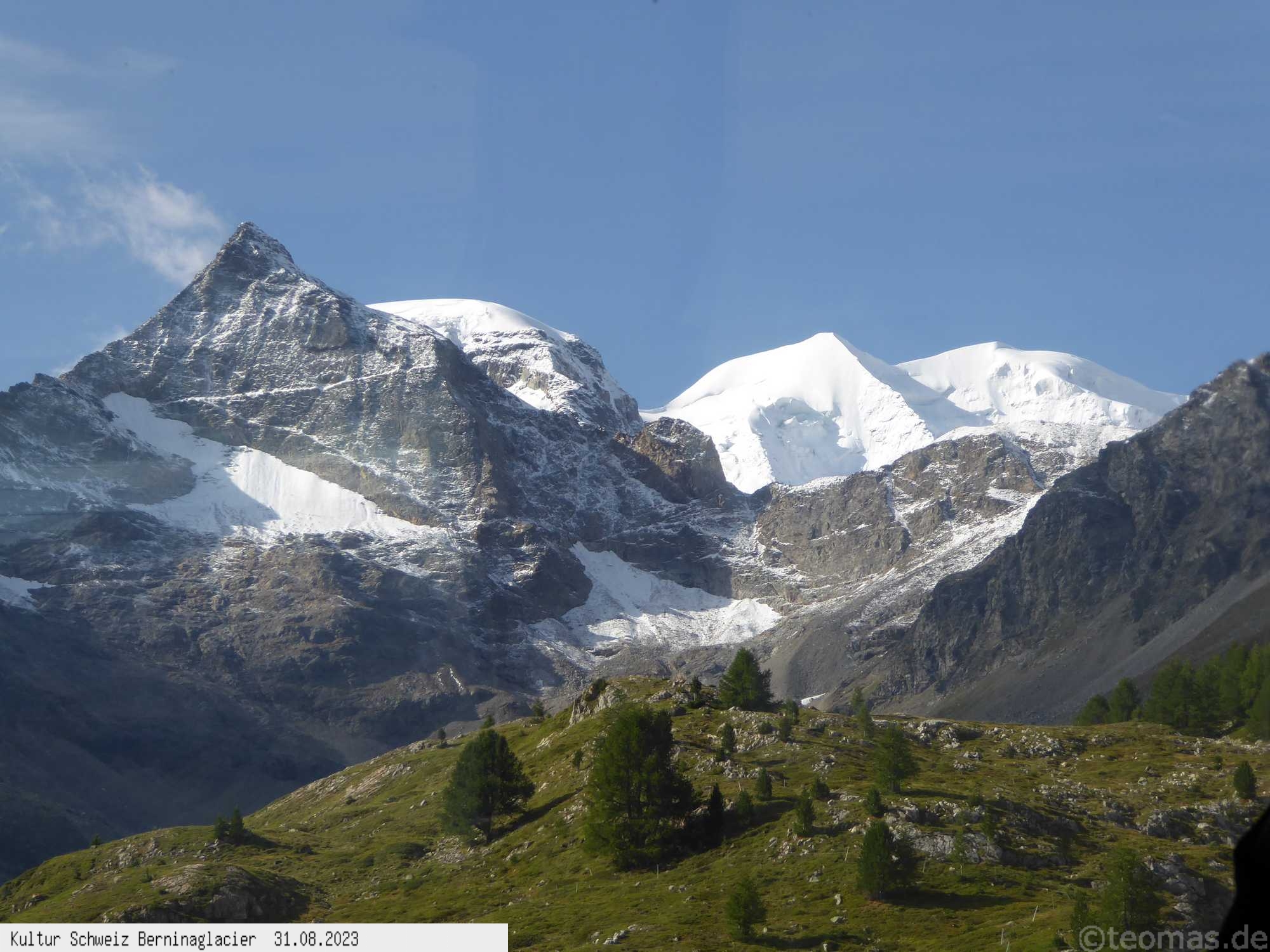 auf den Morteratsch Gletscher, den Piz Bernina. Der Zug überwindet Steigungen von bis zu 7% ohne Zahnstangen Antrieb.