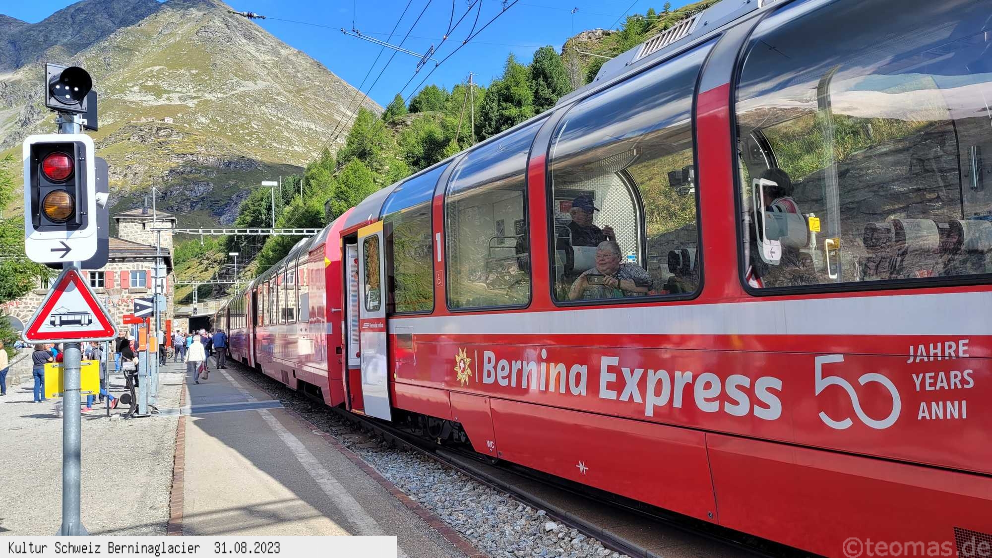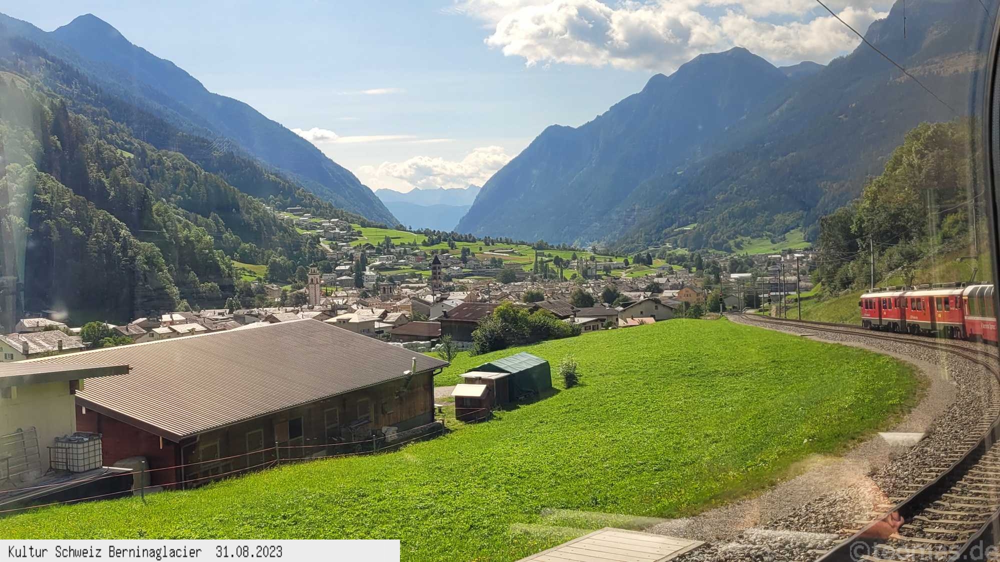 und dem Bernina Paß bis nach Poschiavo, Brusio und Tirano in Italien. Die 2,5h stündige Zugfahrt im Panoramawagen sehr kurzweilig mit Top Ausblicken