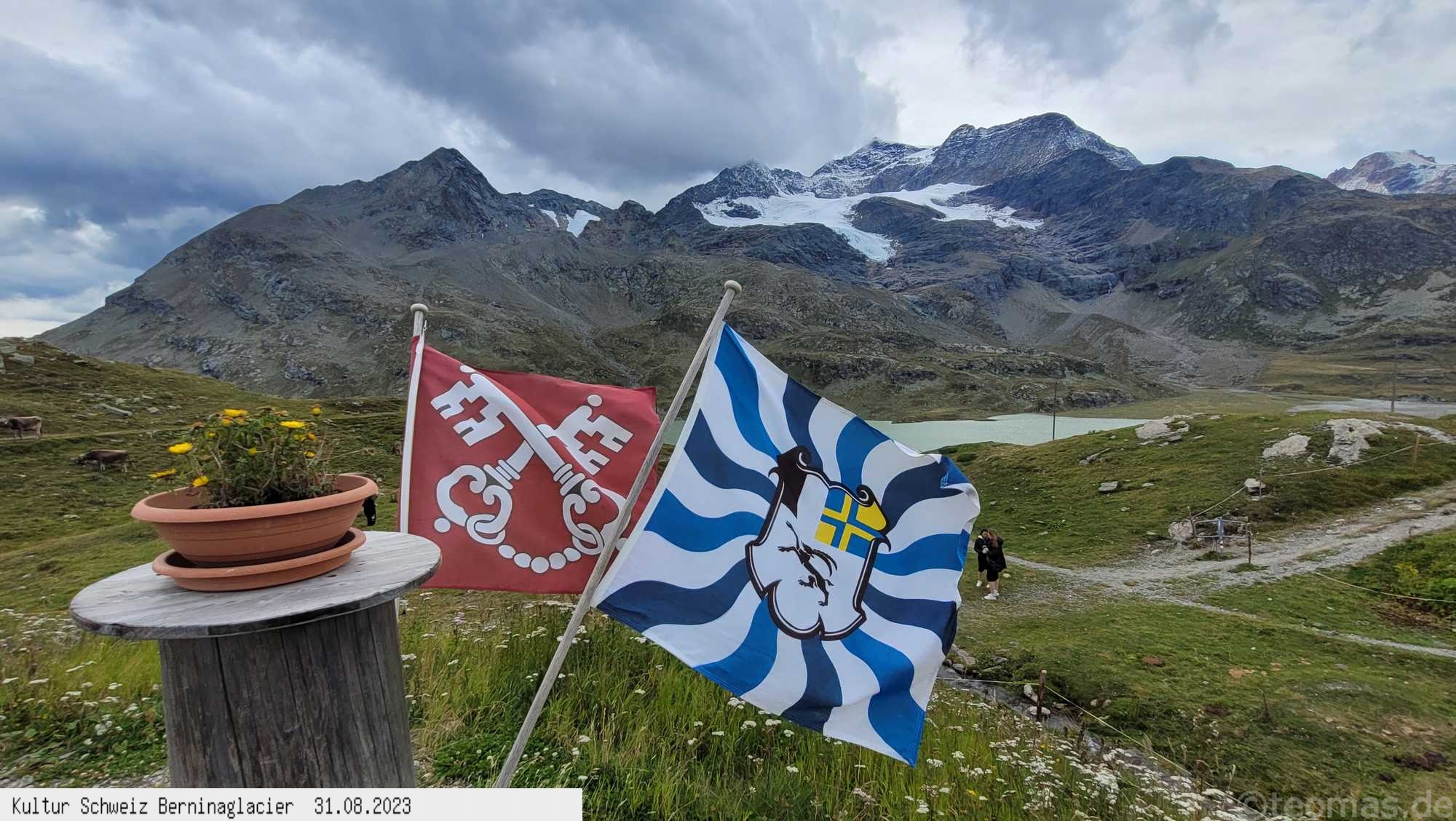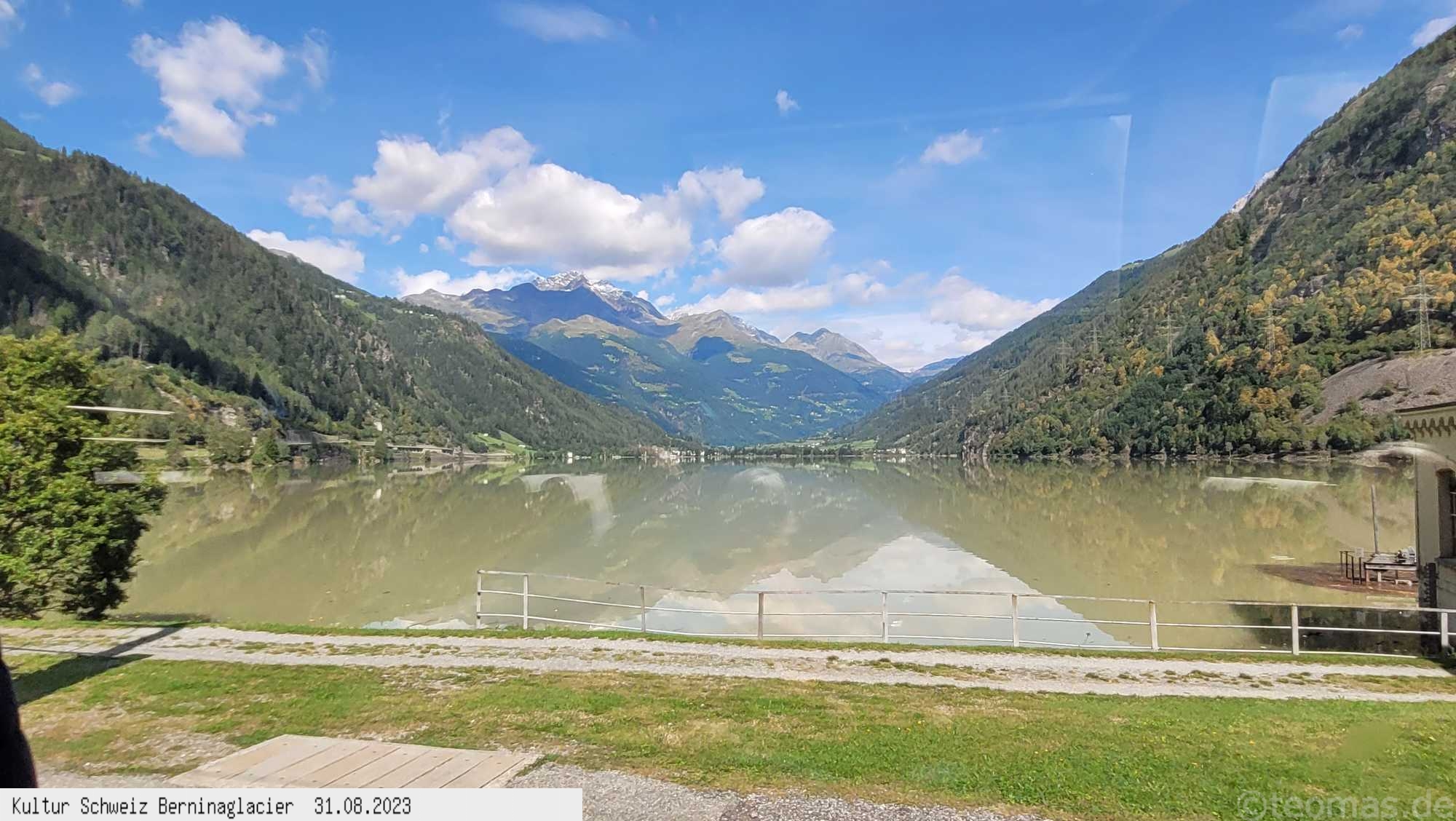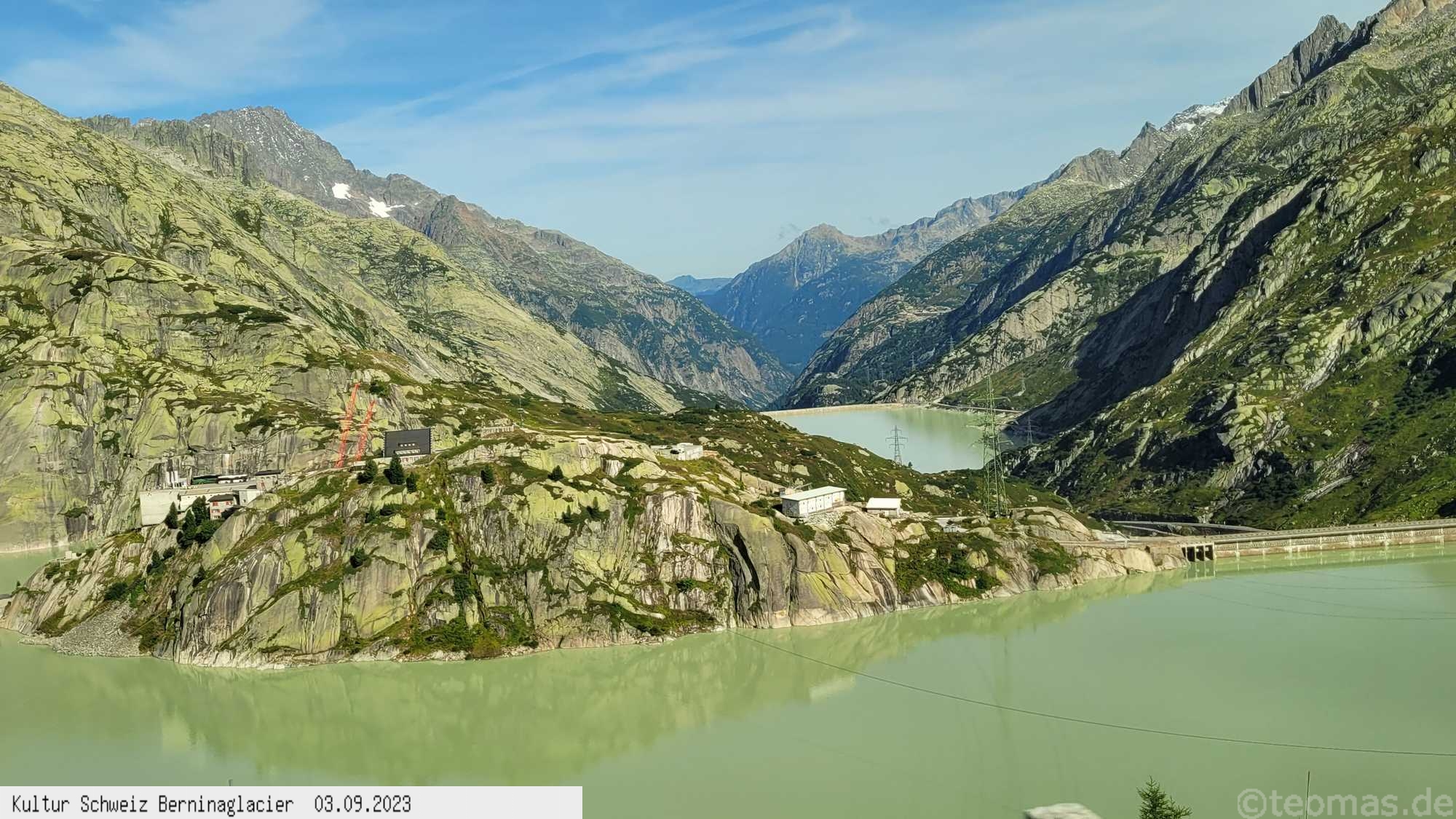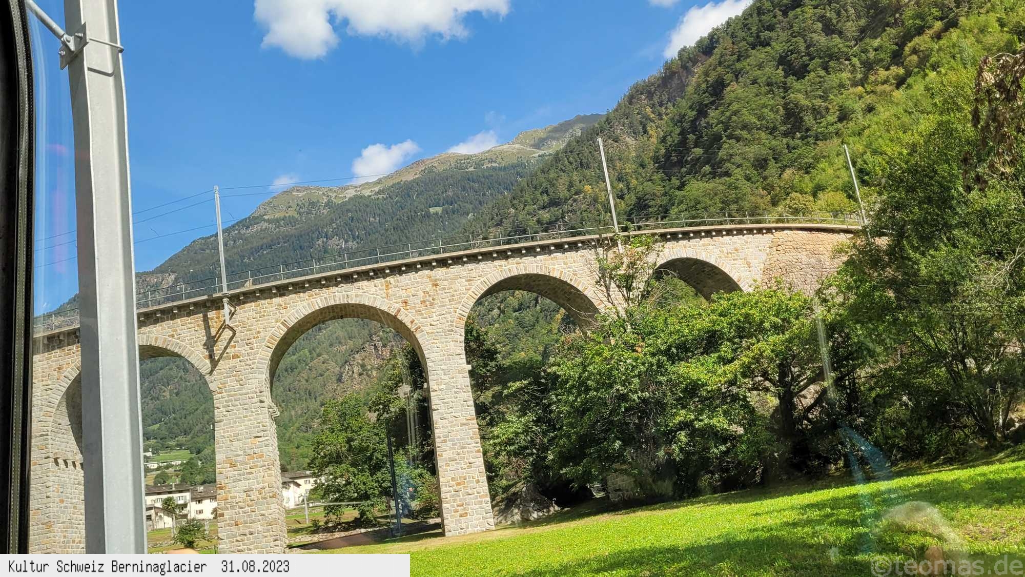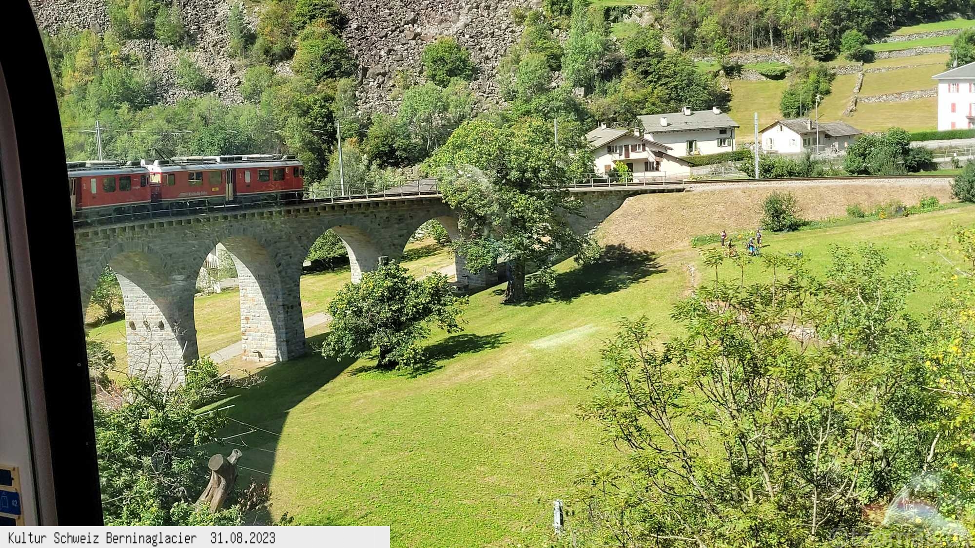 dem Palü-Gletscher mit dem Palü-See. Bei Brusio der berühmte Kreisviadukt. Im Viertelkreis angelegter Viadukt auf kleinstem Raum, damit der Zug den