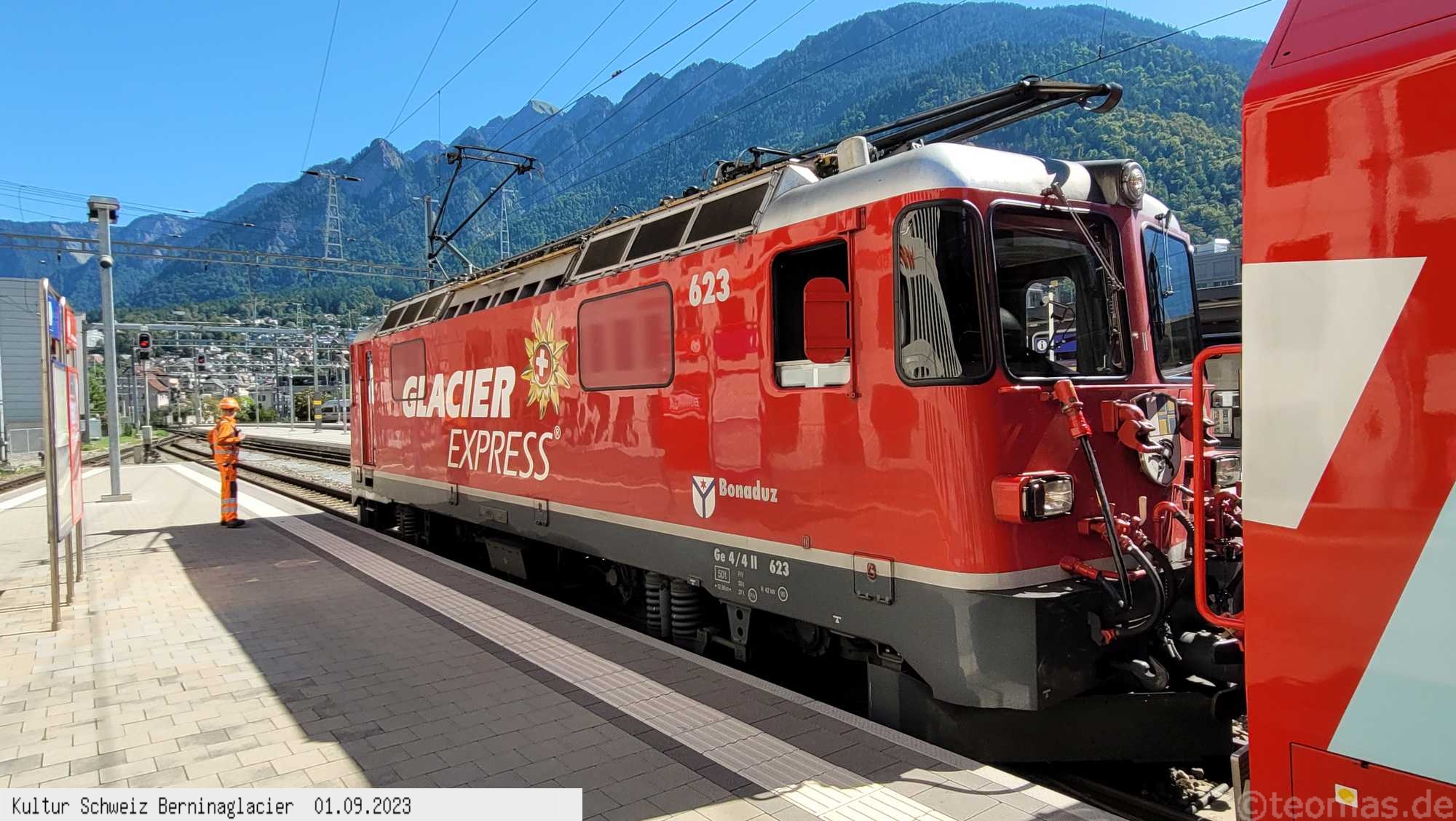 Jeweils ab St. Moritz die Zugfahrt mit dem Bernina Express über den Bernina Paß bis Tirano, sowie mit dem Glacier Express über Albula bis Chur