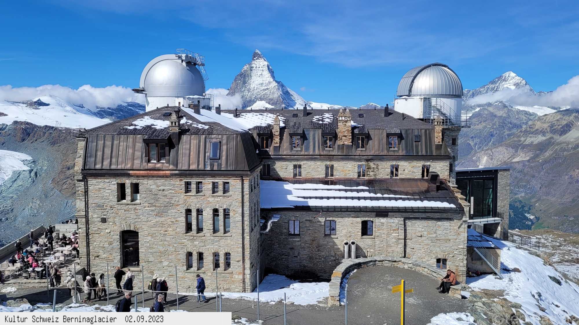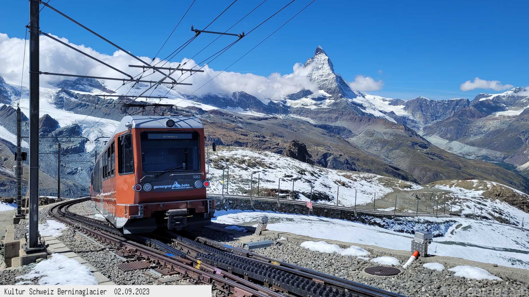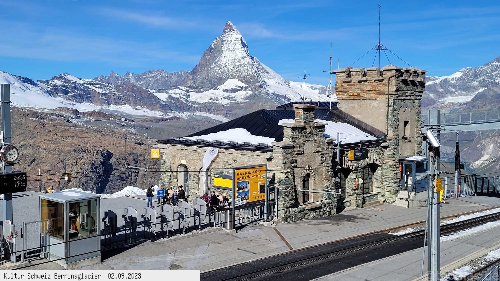 Unterwegs immer wieder spektakuläre Ausblicke auf das Matterhorn im Sonnenlicht, und bei der Ankunft gegen 09:30 Uhr am Gornergrat