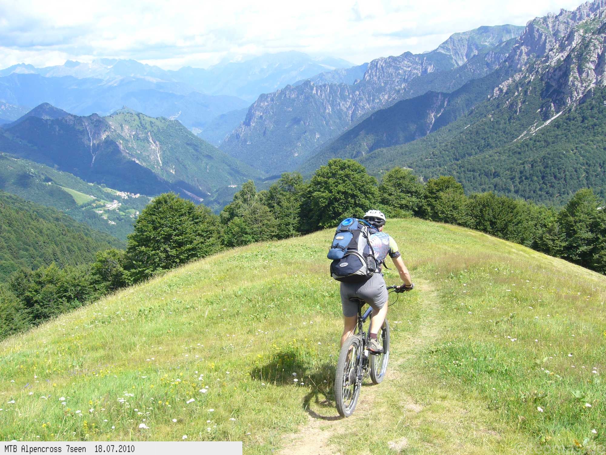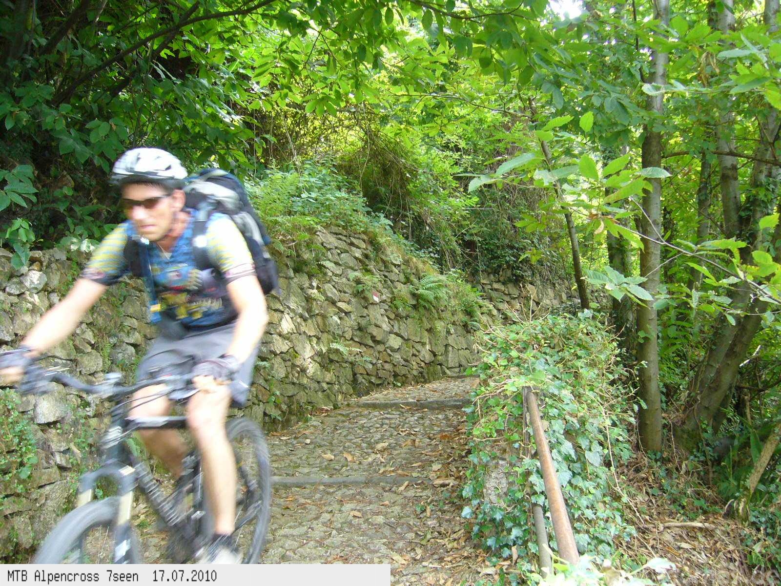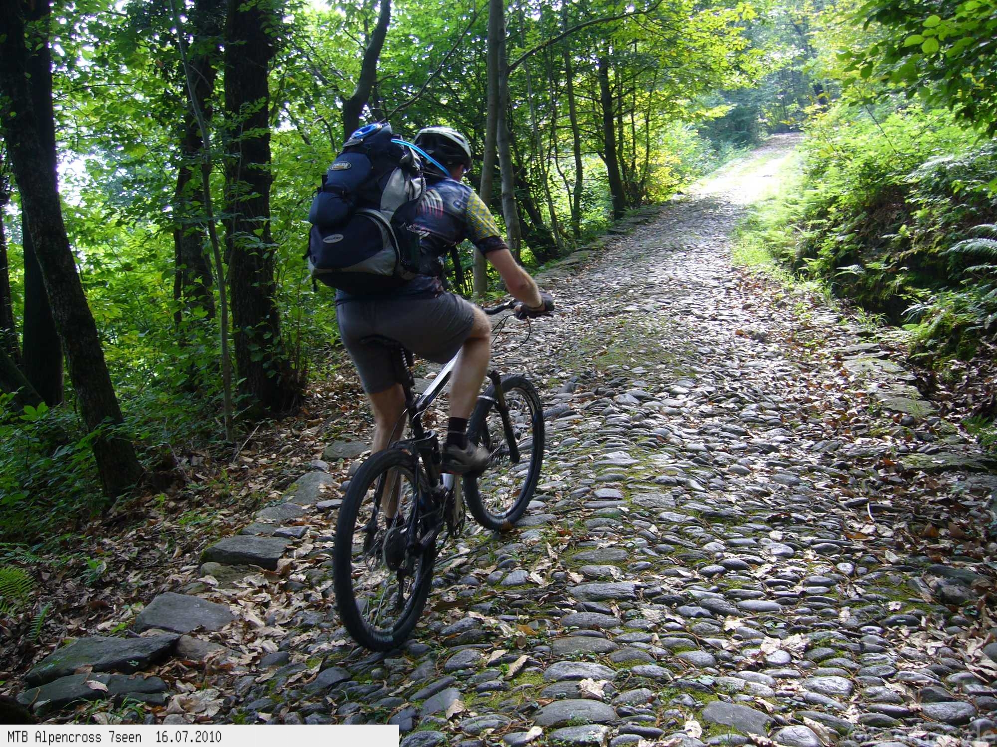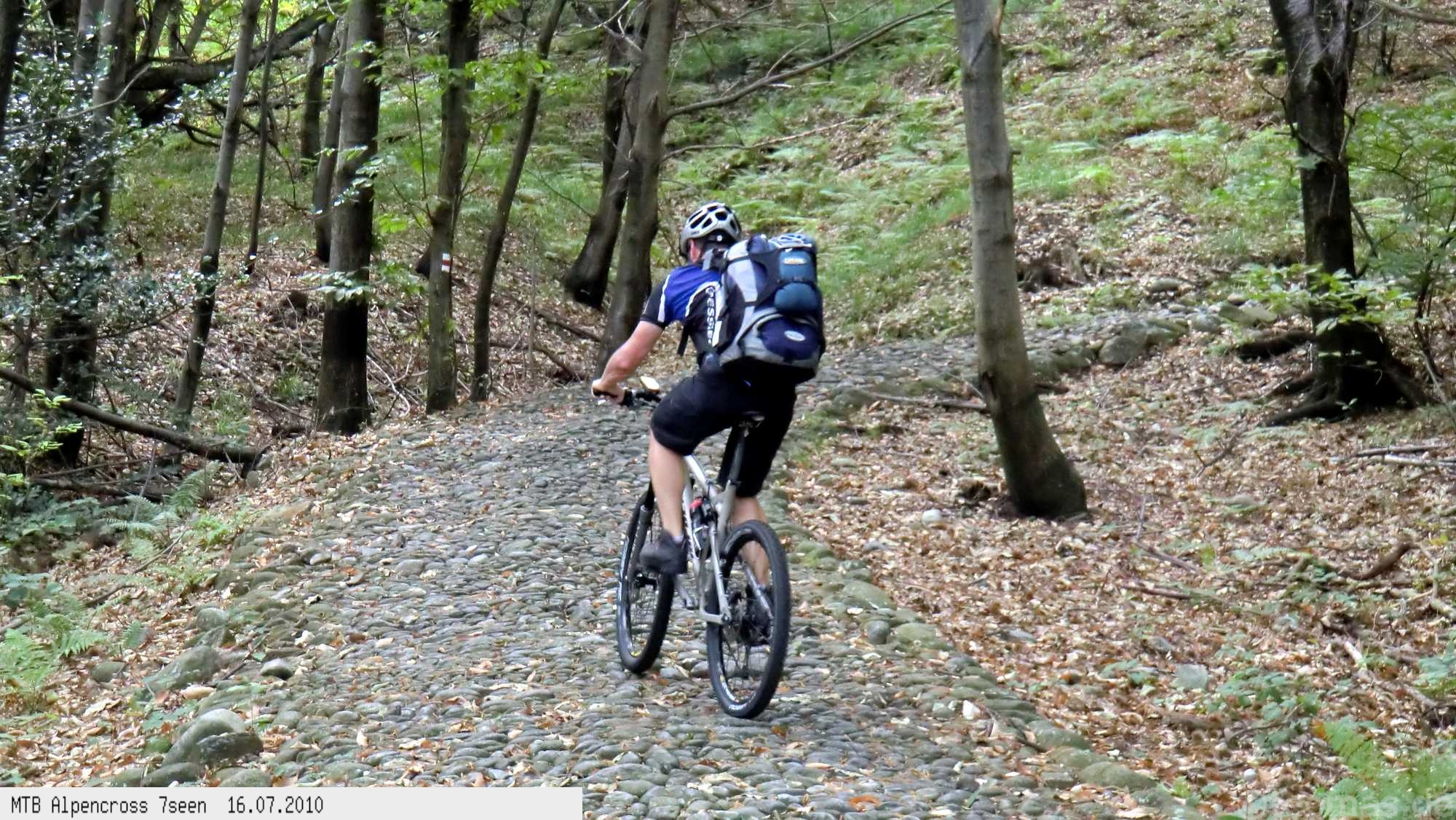 Von West nach Ost auf der Alpensüdseite vom Lago Maggiore zum Gardasee. Auf ehemaligen Militärstraßen und alten Handelswegen an sieben Seen vorbei. Die Infrastruktur auf dieser bisher schwierigsten Alpendurchquerung ist schwach ausgebaut. Man gelangt durch teils einsame und stille Gegenden, in denen längere Abschnitte ohne Versorgung zu bewältigen sind. Hitze um die 40°C und ein Bruch der Sattelstütze am ersten Tag haben die Bedingungen zusätzlich verschärft. Die Anstiege sind durchwegs sehr steil, oft unfahrbar. Die Wegfindung erfordert Erfahrung und ausreichend Geduld im Kartenlesen an kritischen Weggabelungen. Belohnt wird man durch ein abenteuerliches Gelände auf nicht ausgetretenen Pfaden. Um die Tour logistisch zu meistern sind wir mit dem Auto von Nürnberg nach Ticino/Locarno zum Tourstart gefahren. Für den Rückweg vom Gardasee haben wir uns ein Leihauto bis zur italienisch/schweizerischen Grenze nach Belinzano genommen. Von dort dann weiter mit der S−Bahn nach Locarno zum Ausgangspunkt.