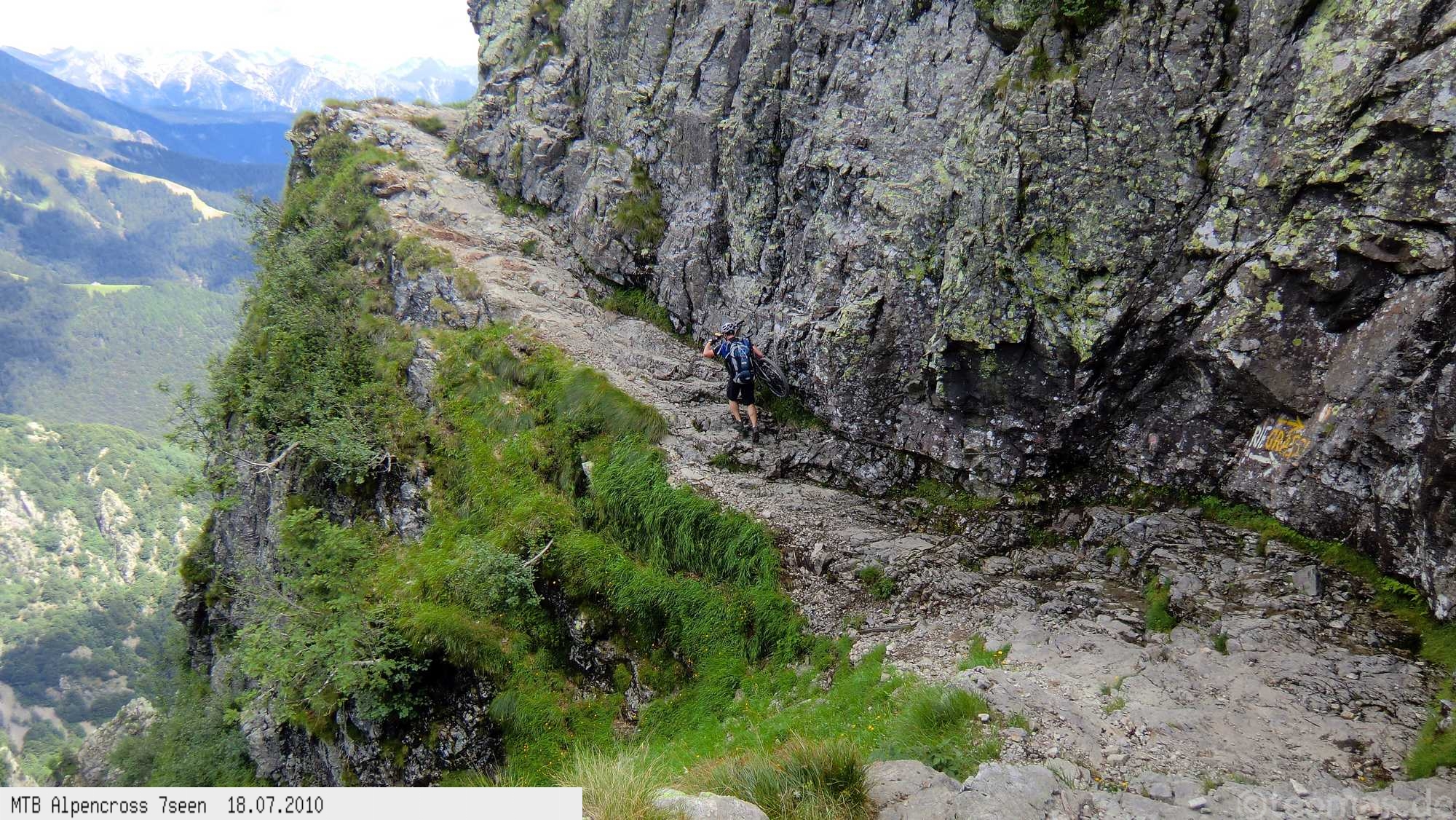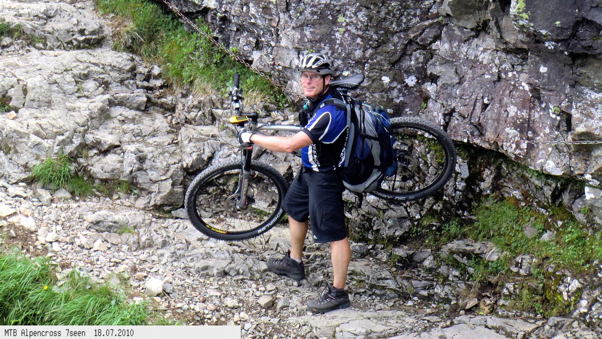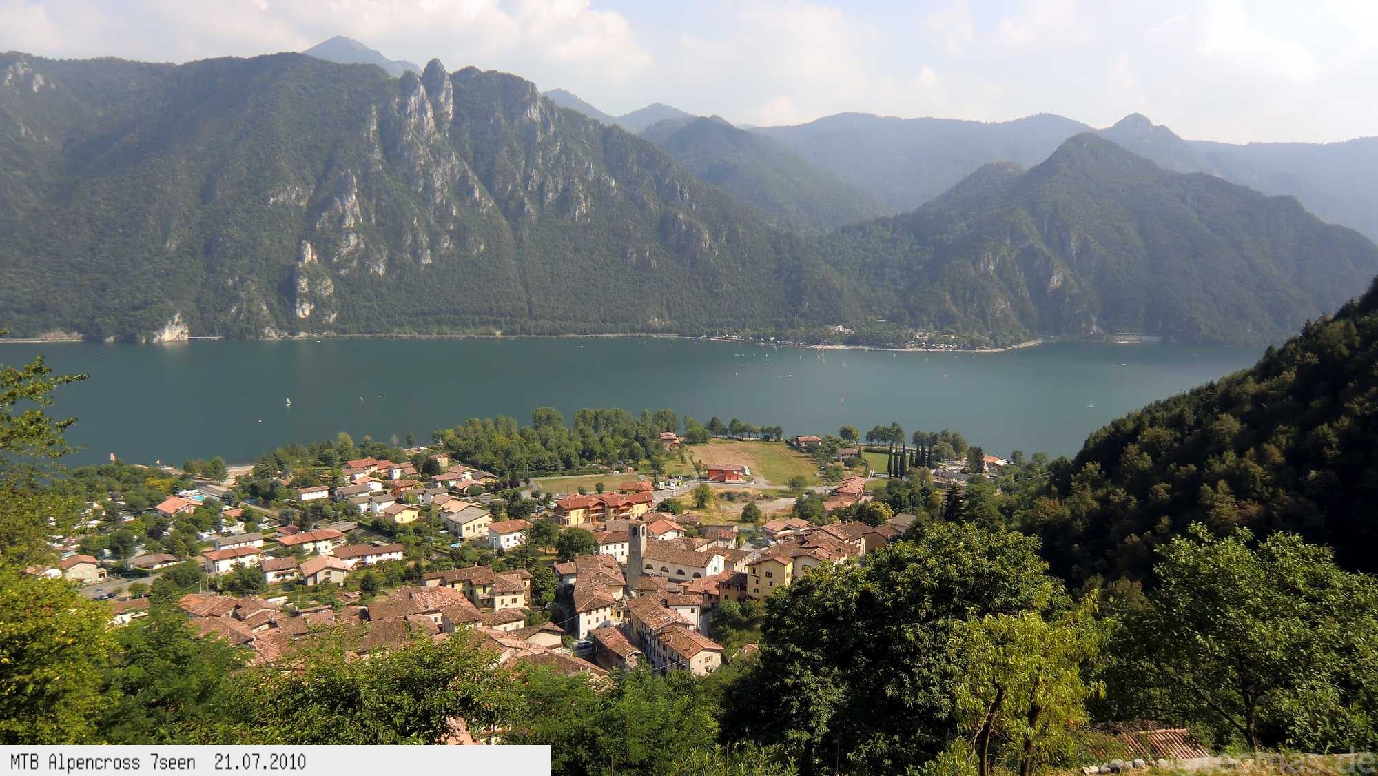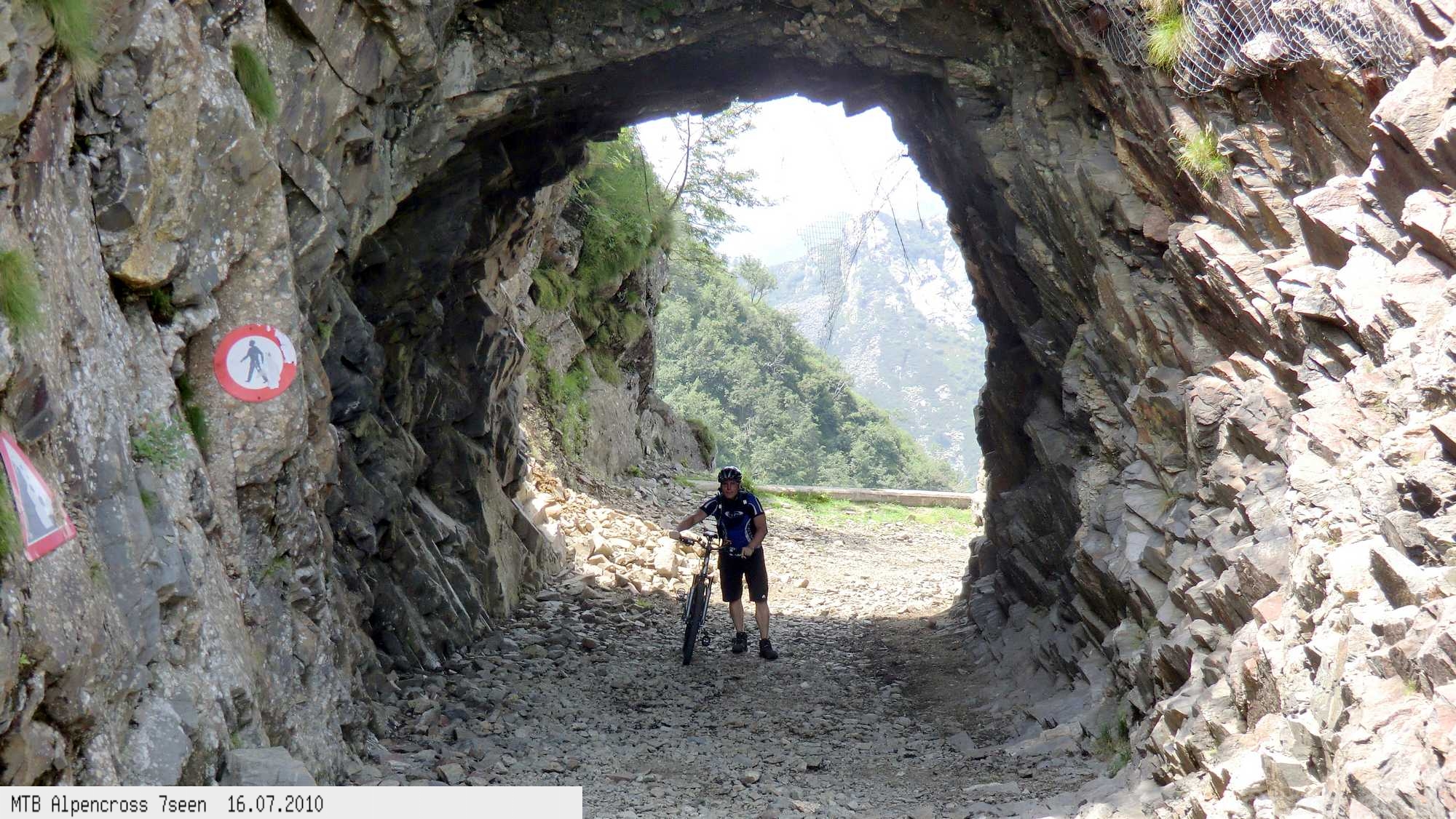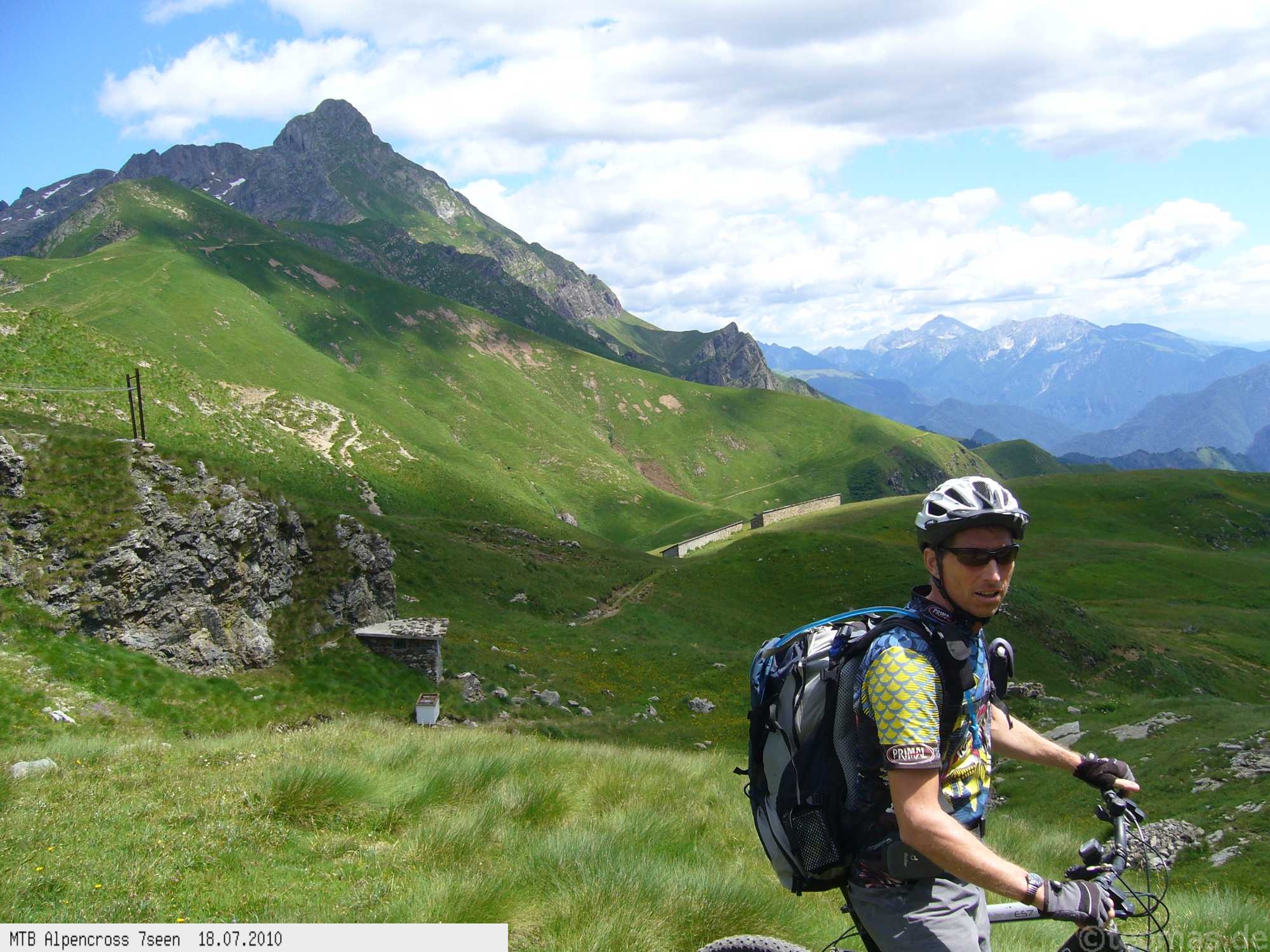 Von West nach Ost auf der Alpensüdseite vom Lago Maggiore zum Gardasee. Auf ehemaligen Militärstraßen und alten Handelswegen an sieben Seen vorbei. Die Infrastruktur auf dieser bisher schwierigsten Alpendurchquerung ist schwach ausgebaut. Man gelangt durch teils einsame und stille Gegenden, in denen längere Abschnitte ohne Versorgung zu bewältigen sind. Hitze um die 40°C und ein Bruch der Sattelstütze am ersten Tag haben die Bedingungen zusätzlich verschärft. Die Anstiege sind durchwegs sehr steil, oft unfahrbar. Die Wegfindung erfordert Erfahrung und ausreichend Geduld im Kartenlesen an kritischen Weggabelungen. Belohnt wird man durch ein abenteuerliches Gelände auf nicht ausgetretenen Pfaden. Um die Tour logistisch zu meistern sind wir mit dem Auto von Nürnberg nach Ticino/Locarno zum Tourstart gefahren. Für den Rückweg vom Gardasee haben wir uns ein Leihauto bis zur italienisch/schweizerischen Grenze nach Belinzano genommen. Von dort dann weiter mit der S−Bahn nach Locarno zum Ausgangspunkt.