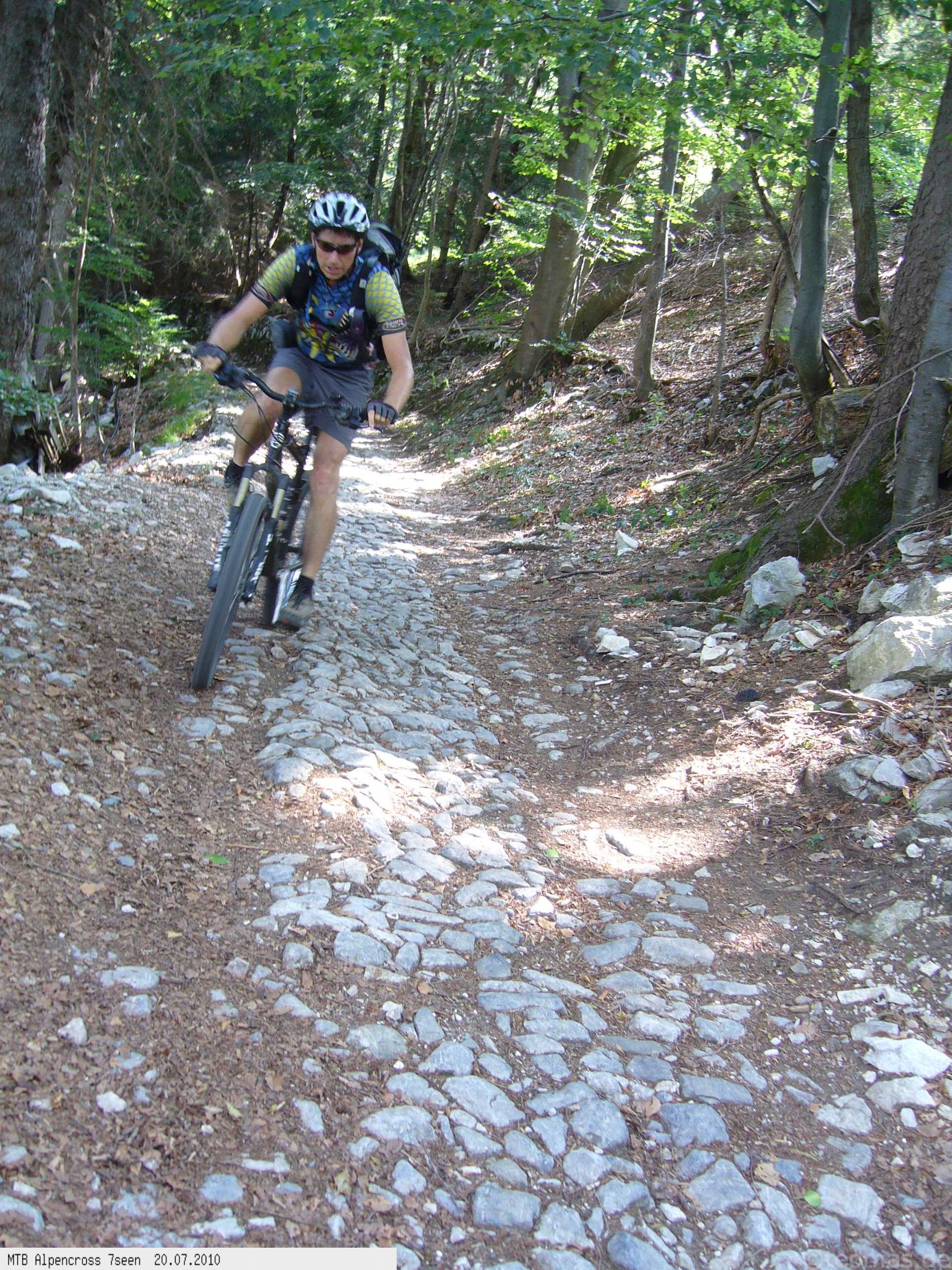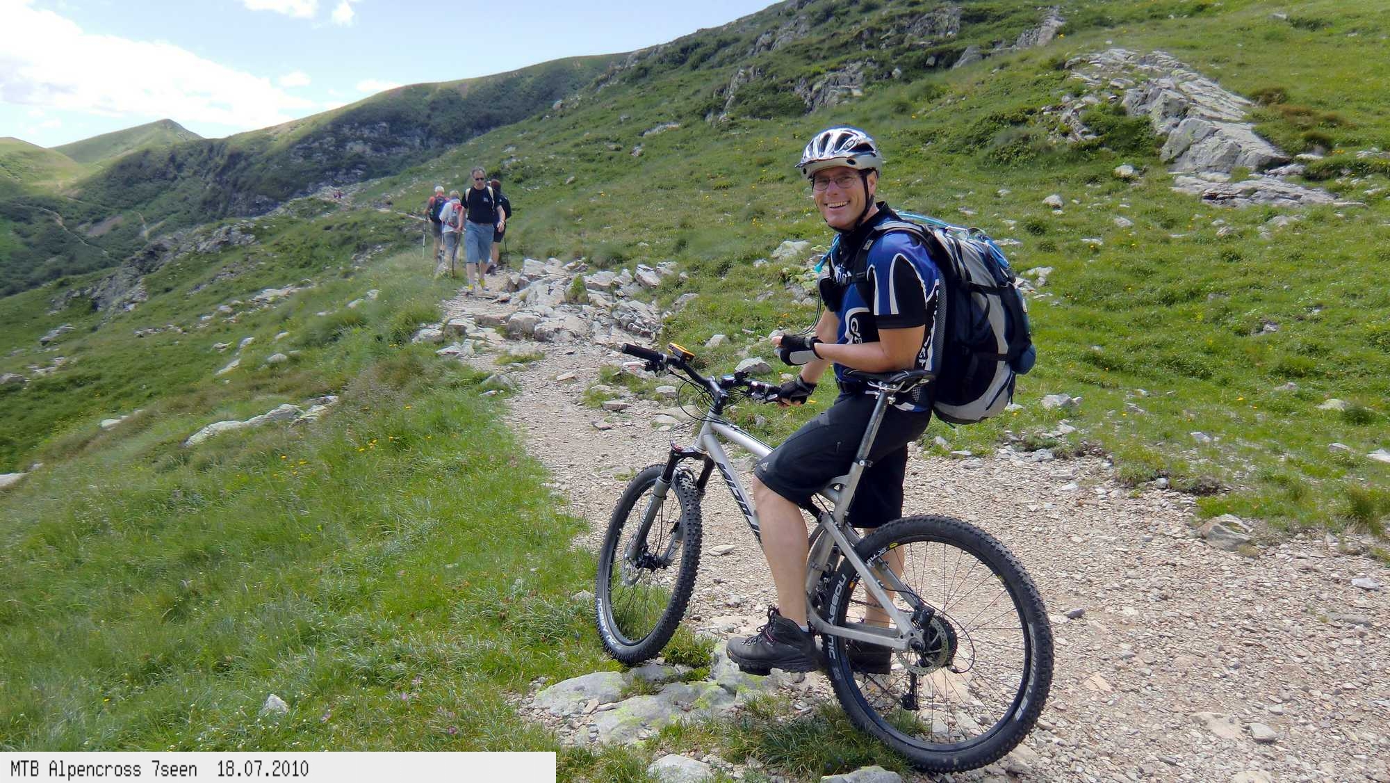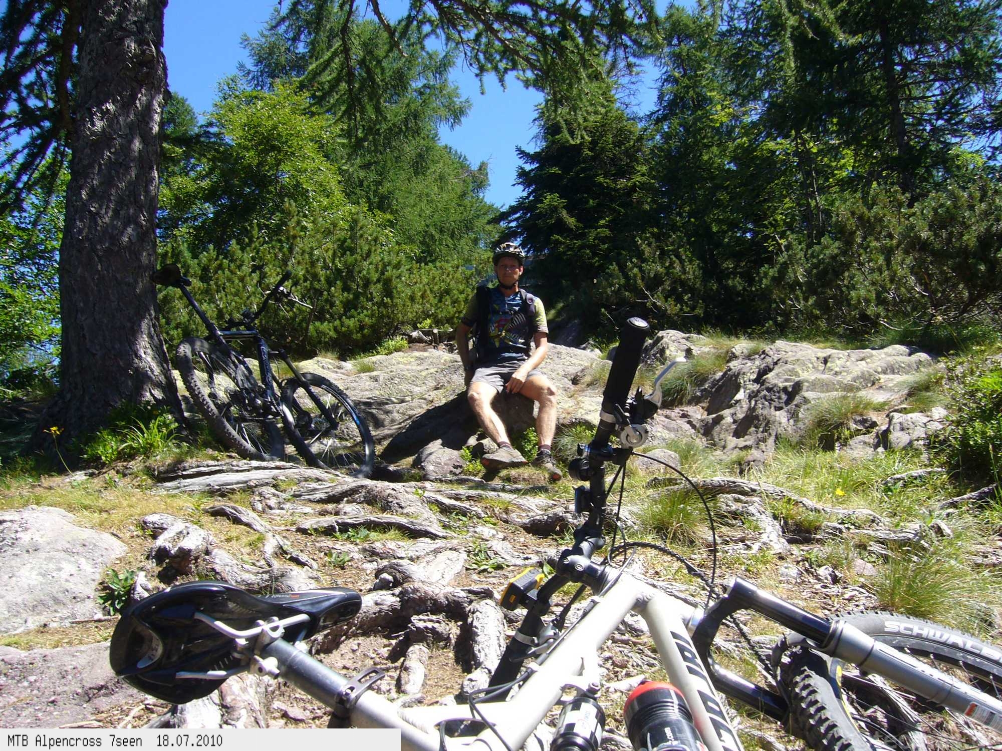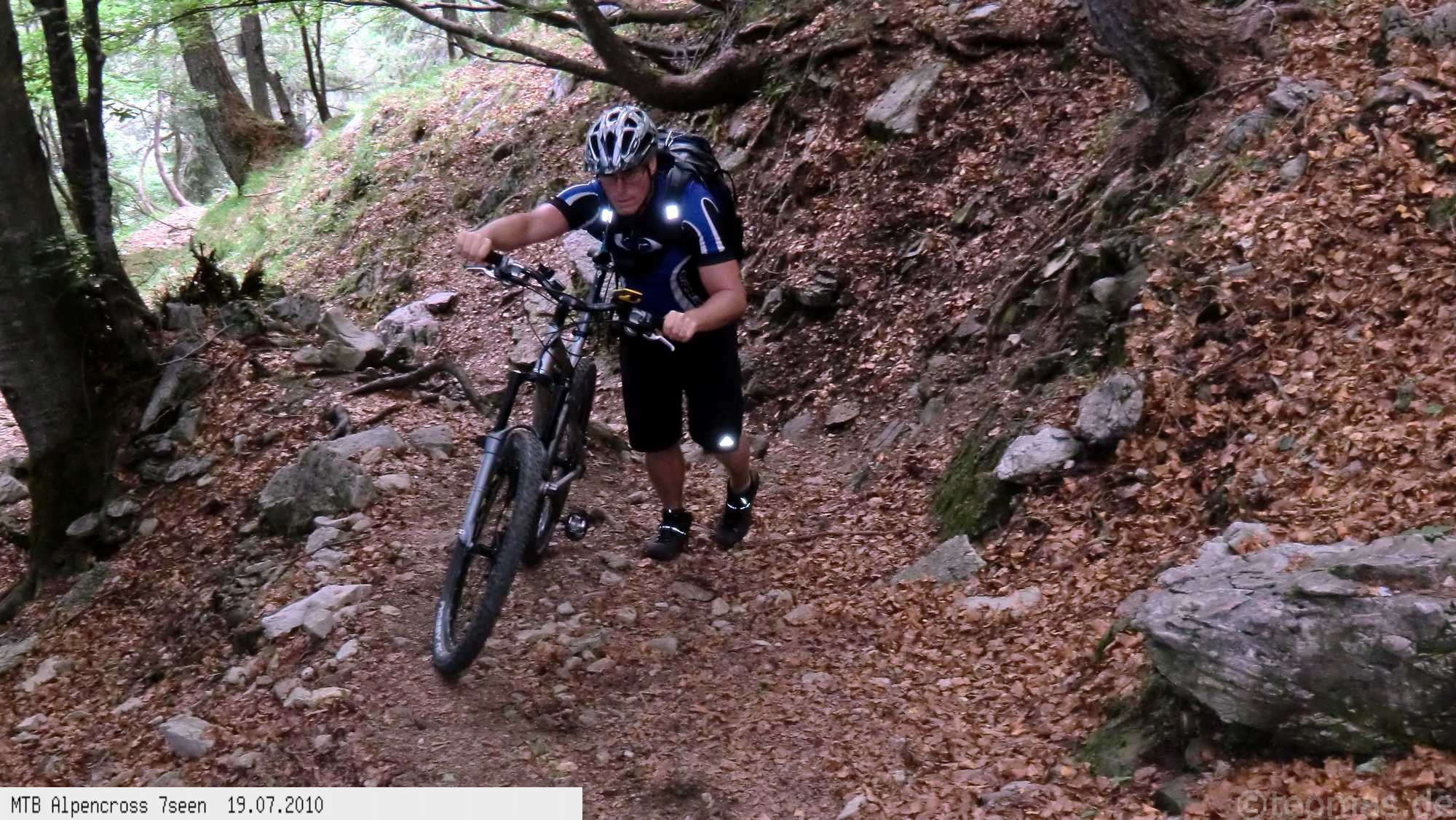 Von West nach Ost auf der Alpensüdseite vom Lago Maggiore zum Gardasee. Auf ehemaligen Militärstraßen und alten Handelswegen an sieben Seen vorbei. Die Infrastruktur auf dieser bisher schwierigsten Alpendurchquerung ist schwach ausgebaut. Man gelangt durch teils einsame und stille Gegenden, in denen längere Abschnitte ohne Versorgung zu bewältigen sind. Hitze um die 40°C und ein Bruch der Sattelstütze am ersten Tag haben die Bedingungen zusätzlich verschärft. Die Anstiege sind durchwegs sehr steil, oft unfahrbar. Die Wegfindung erfordert Erfahrung und ausreichend Geduld im Kartenlesen an kritischen Weggabelungen. Belohnt wird man durch ein abenteuerliches Gelände auf nicht ausgetretenen Pfaden. Um die Tour logistisch zu meistern sind wir mit dem Auto von Nürnberg nach Ticino/Locarno zum Tourstart gefahren. Für den Rückweg vom Gardasee haben wir uns ein Leihauto bis zur italienisch/schweizerischen Grenze nach Belinzano genommen. Von dort dann weiter mit der S−Bahn nach Locarno zum Ausgangspunkt.