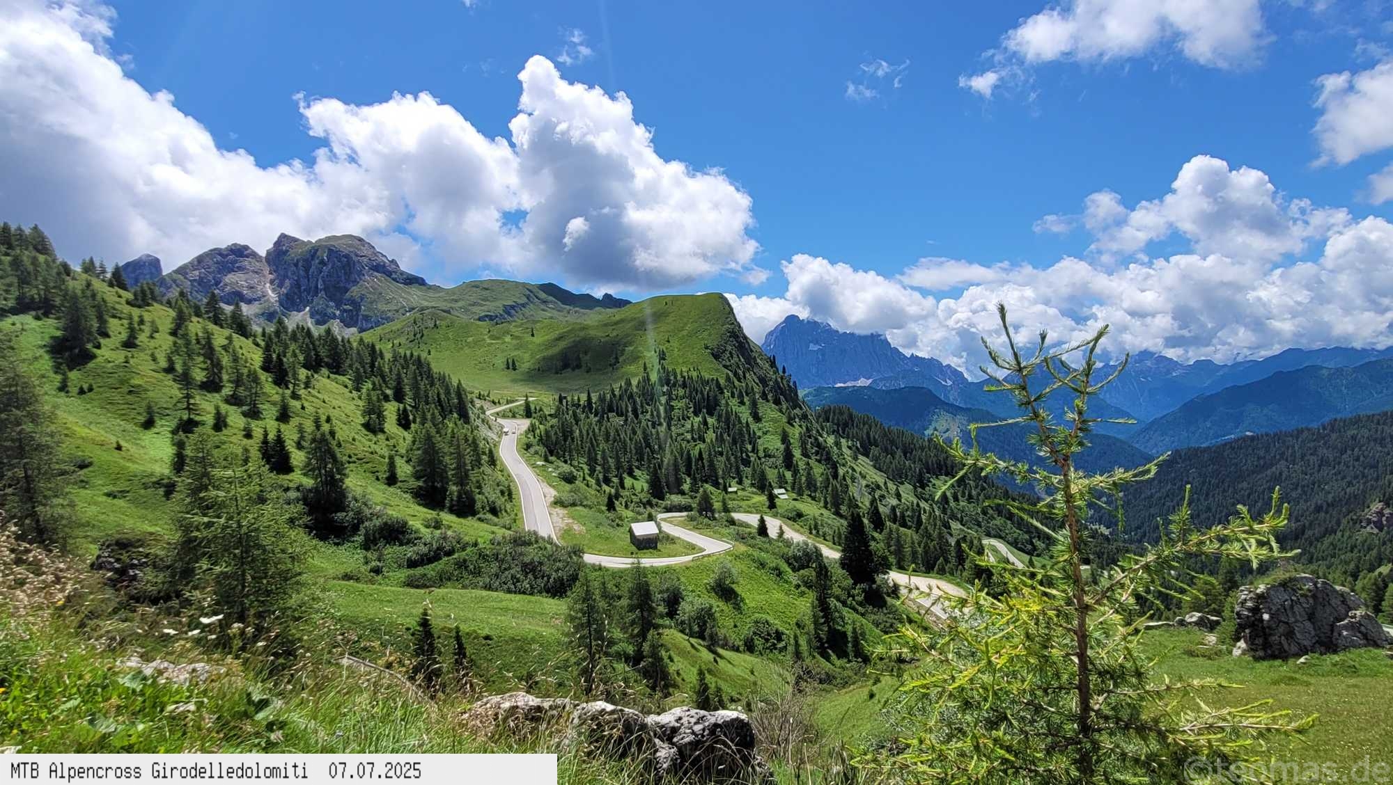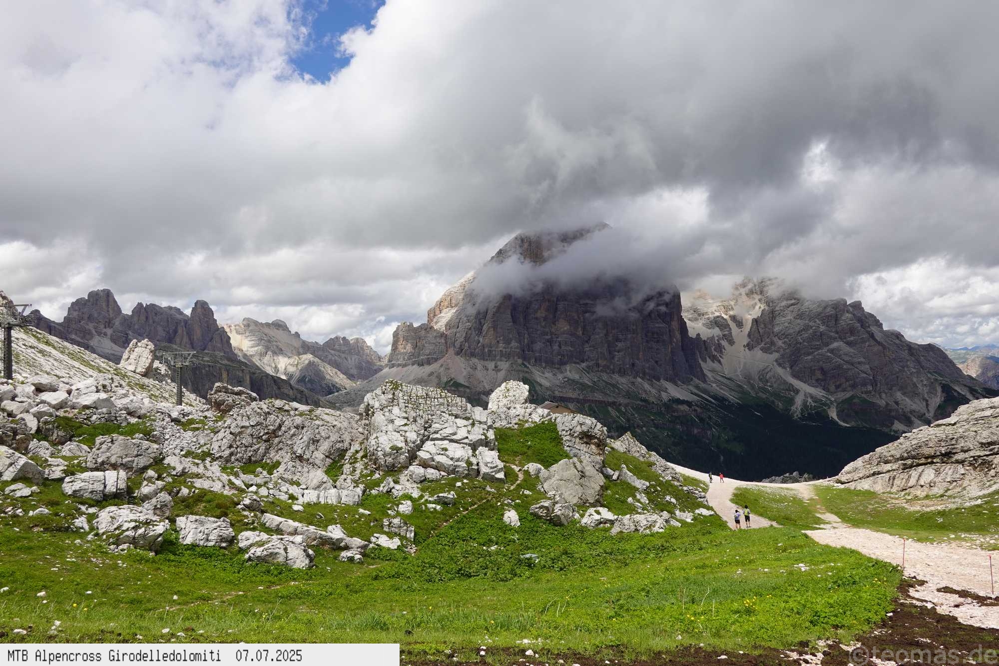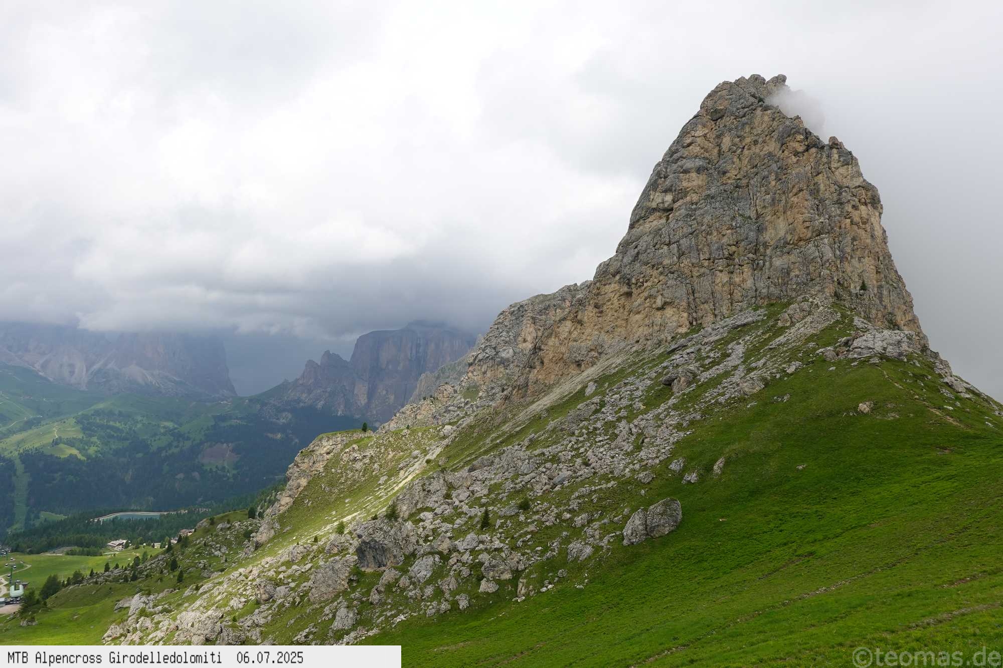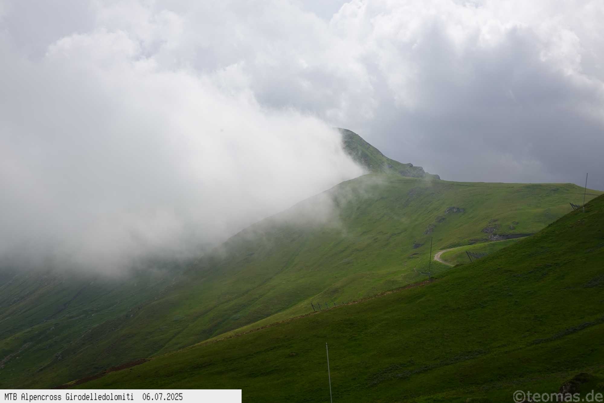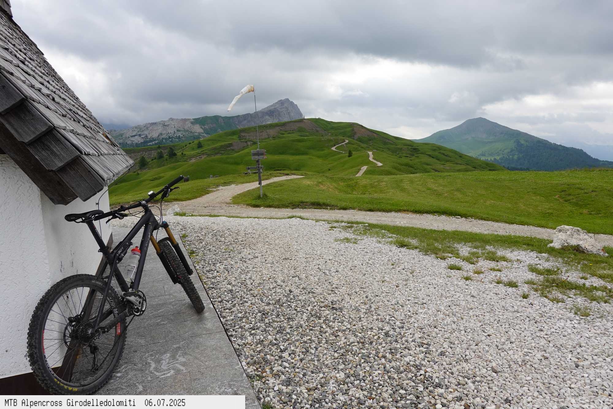 Gipfel. Anschließender Downhill erst auf Schotter, dann auf angelegtem Trail bis Passo Campolongo, wo hunderte Rennradler zum Paß hochstrampelten.
