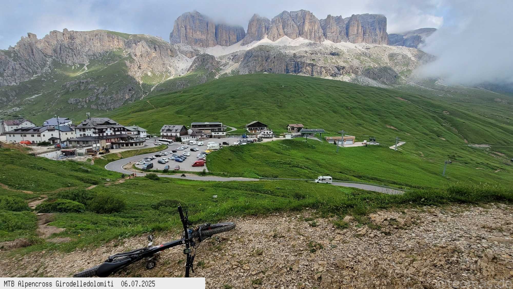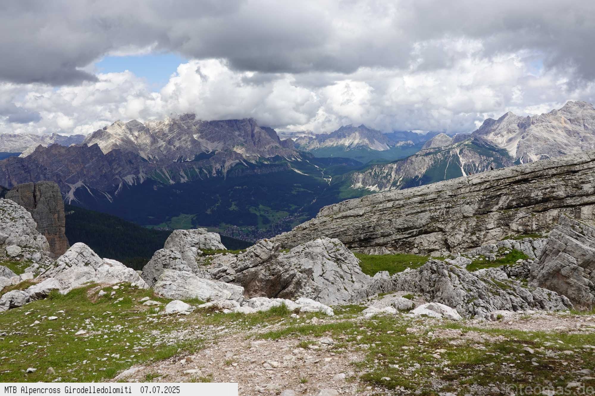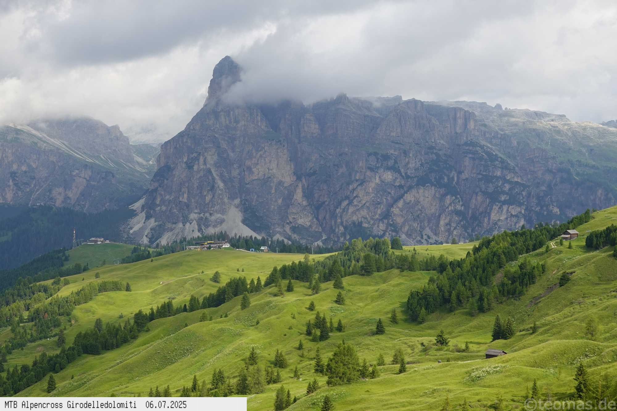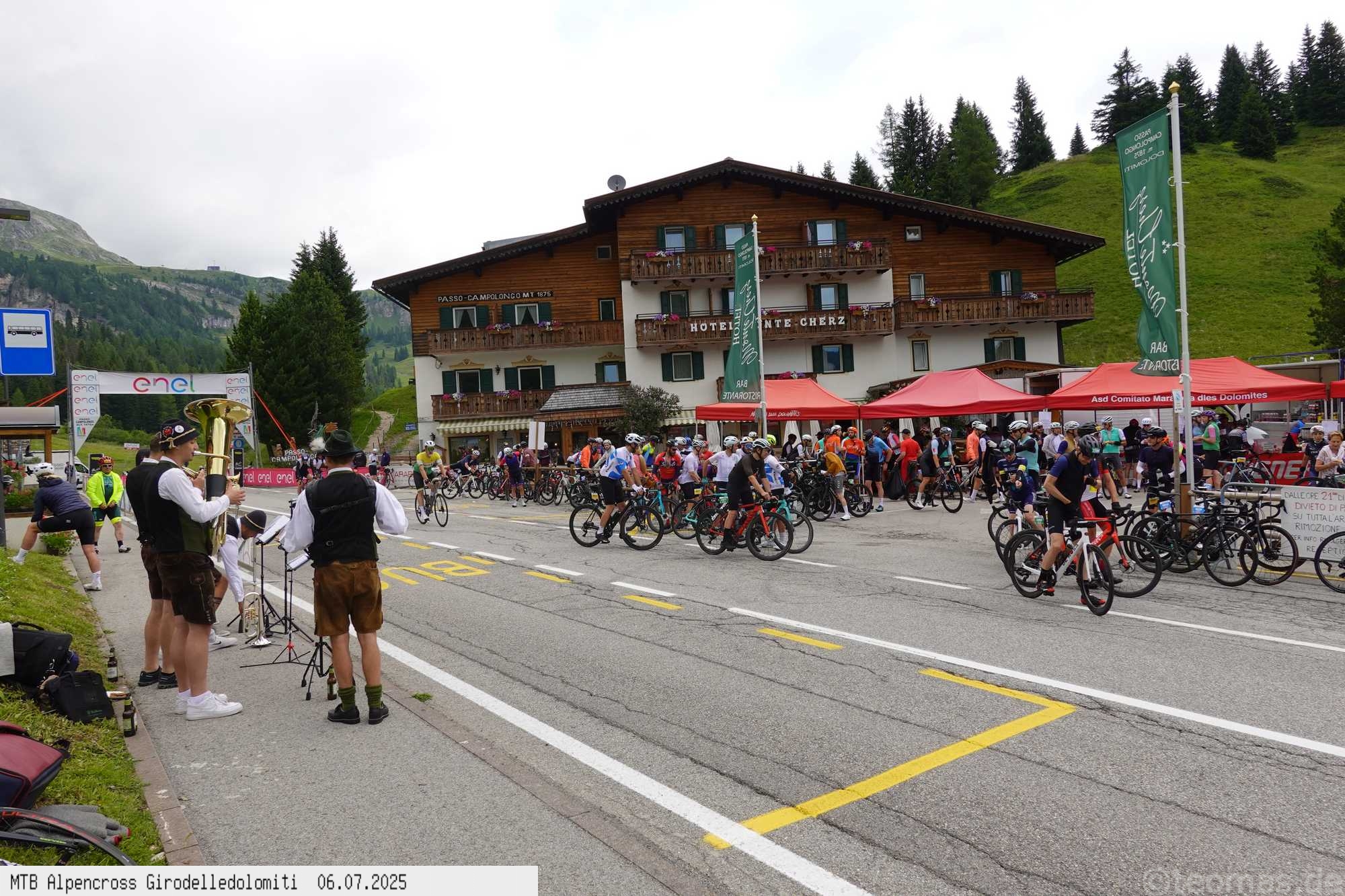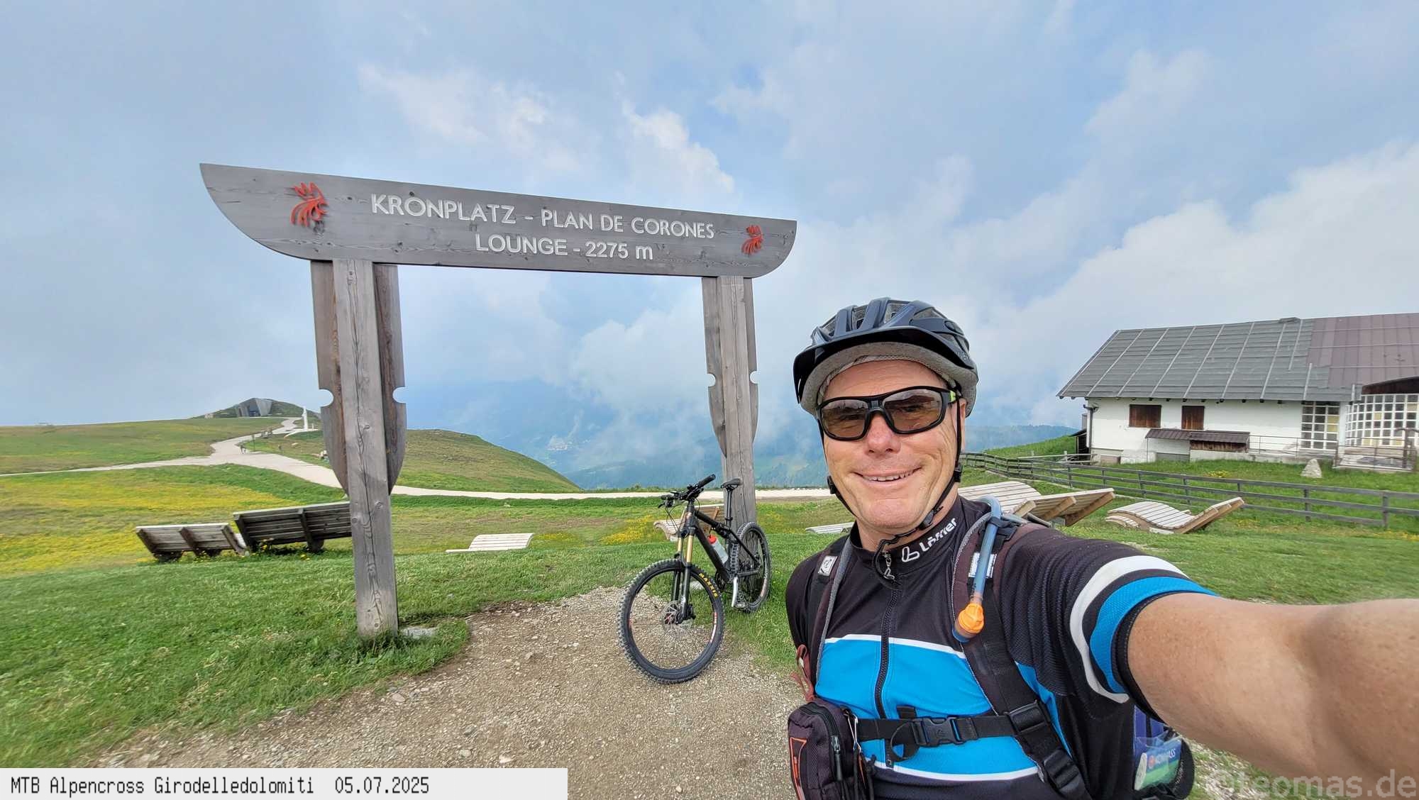 Gipfel. Anschließender Downhill erst auf Schotter, dann auf angelegtem Trail bis Passo Campolongo, wo hunderte Rennradler zum Paß hochstrampelten.