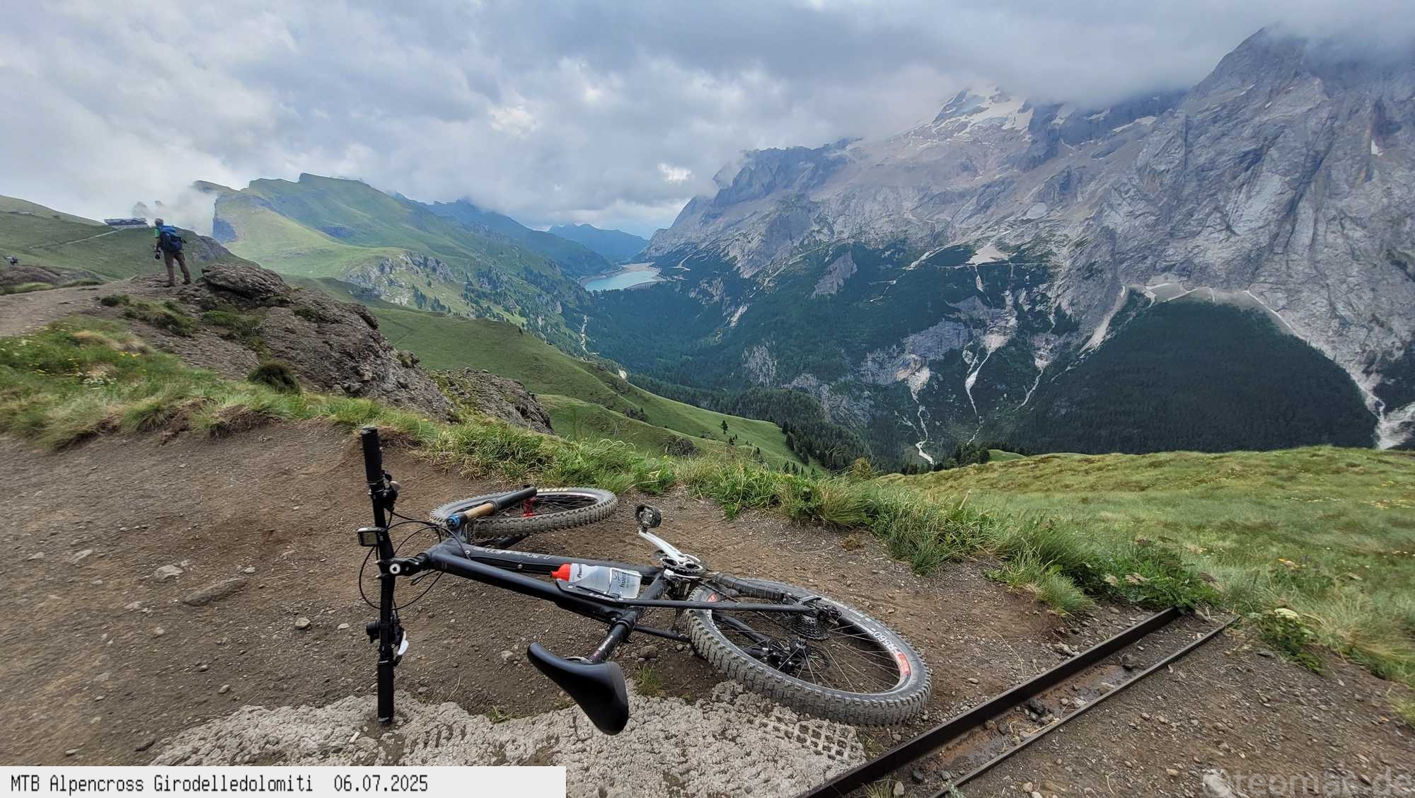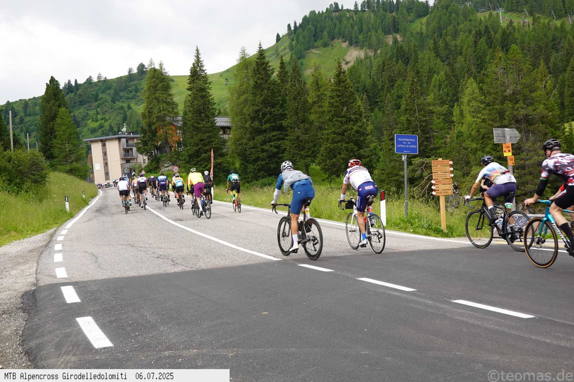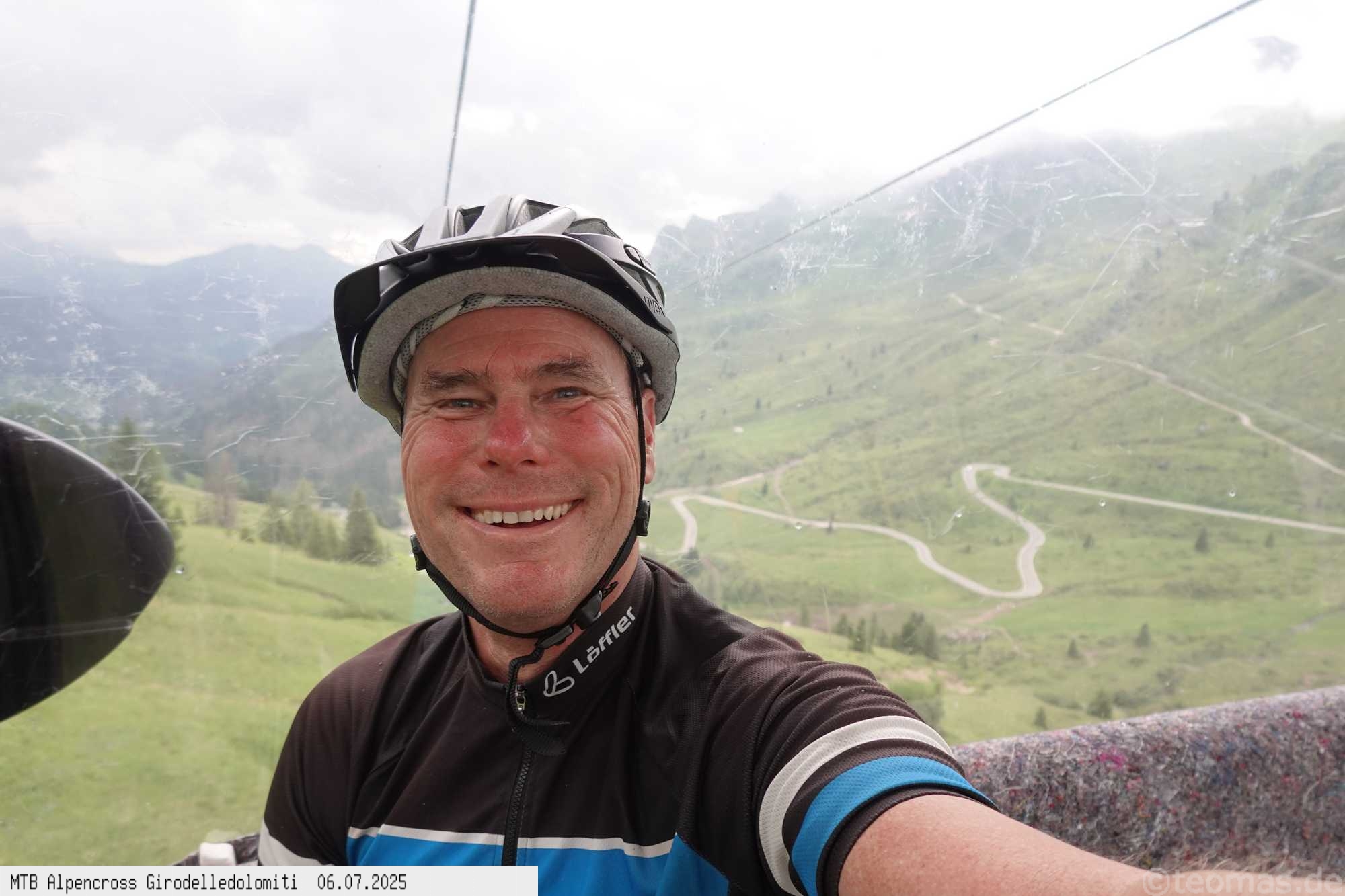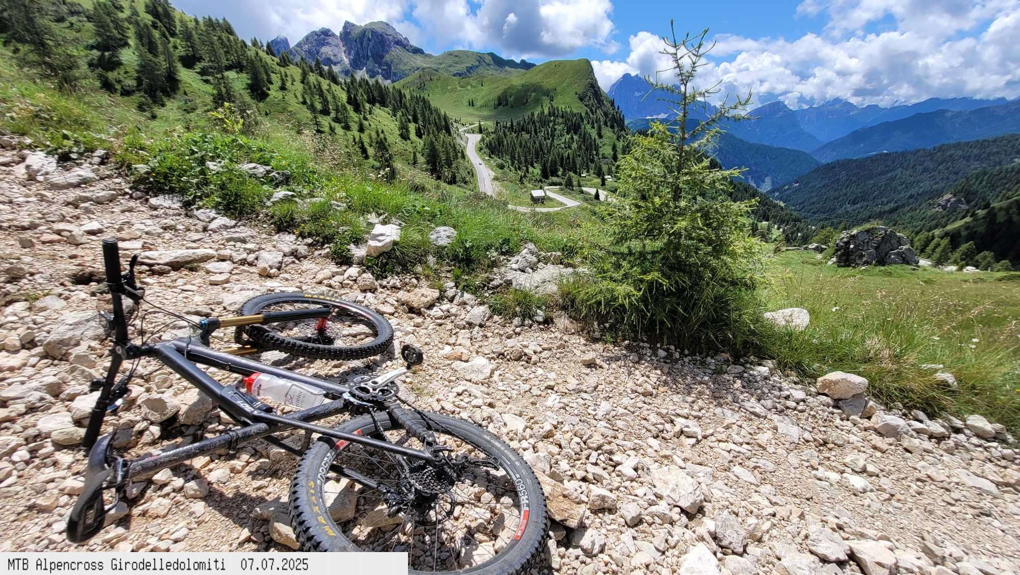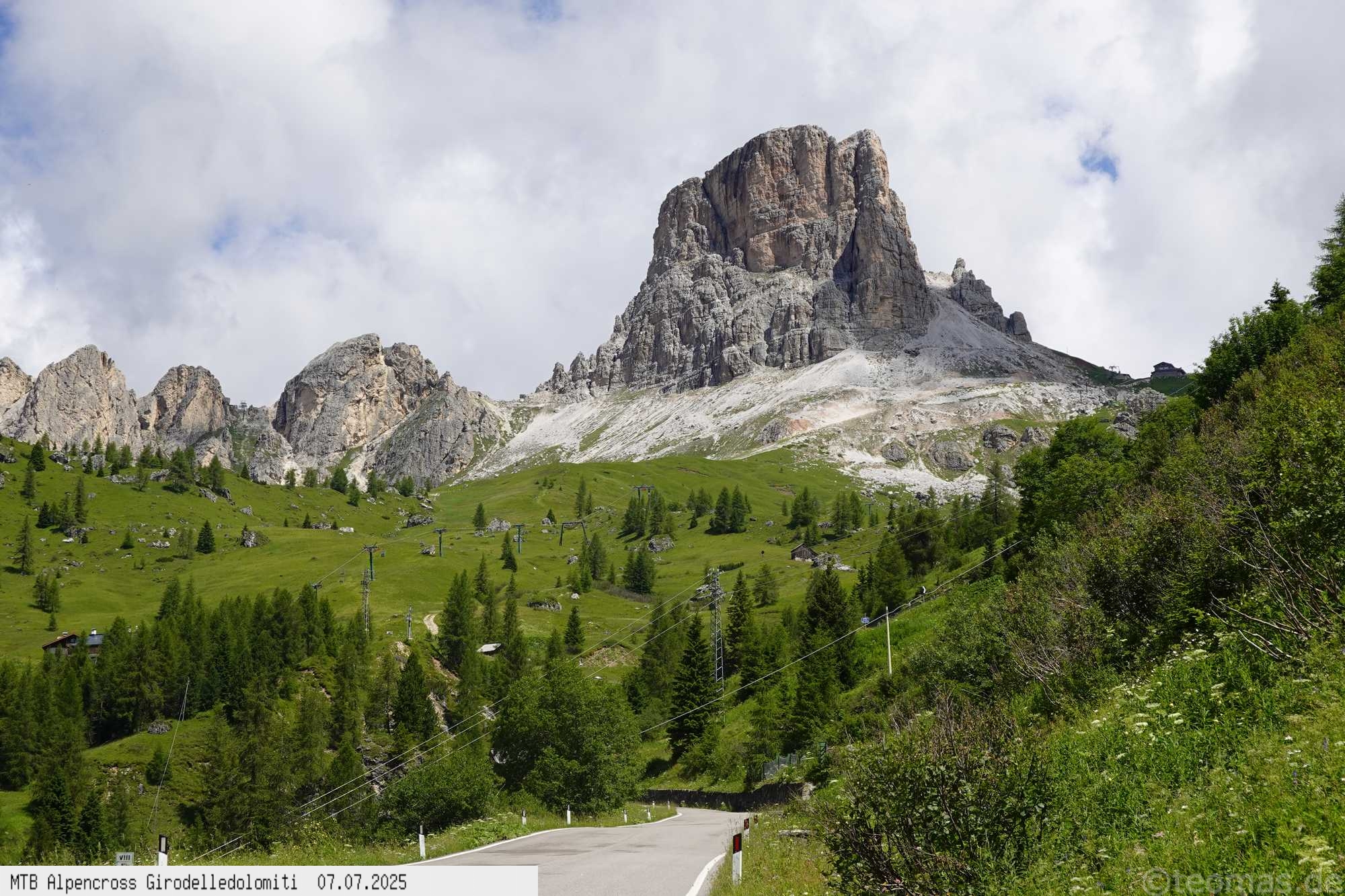 Gipfel. Anschließender Downhill erst auf Schotter, dann auf angelegtem Trail bis Passo Campolongo, wo hunderte Rennradler zum Paß hochstrampelten.
