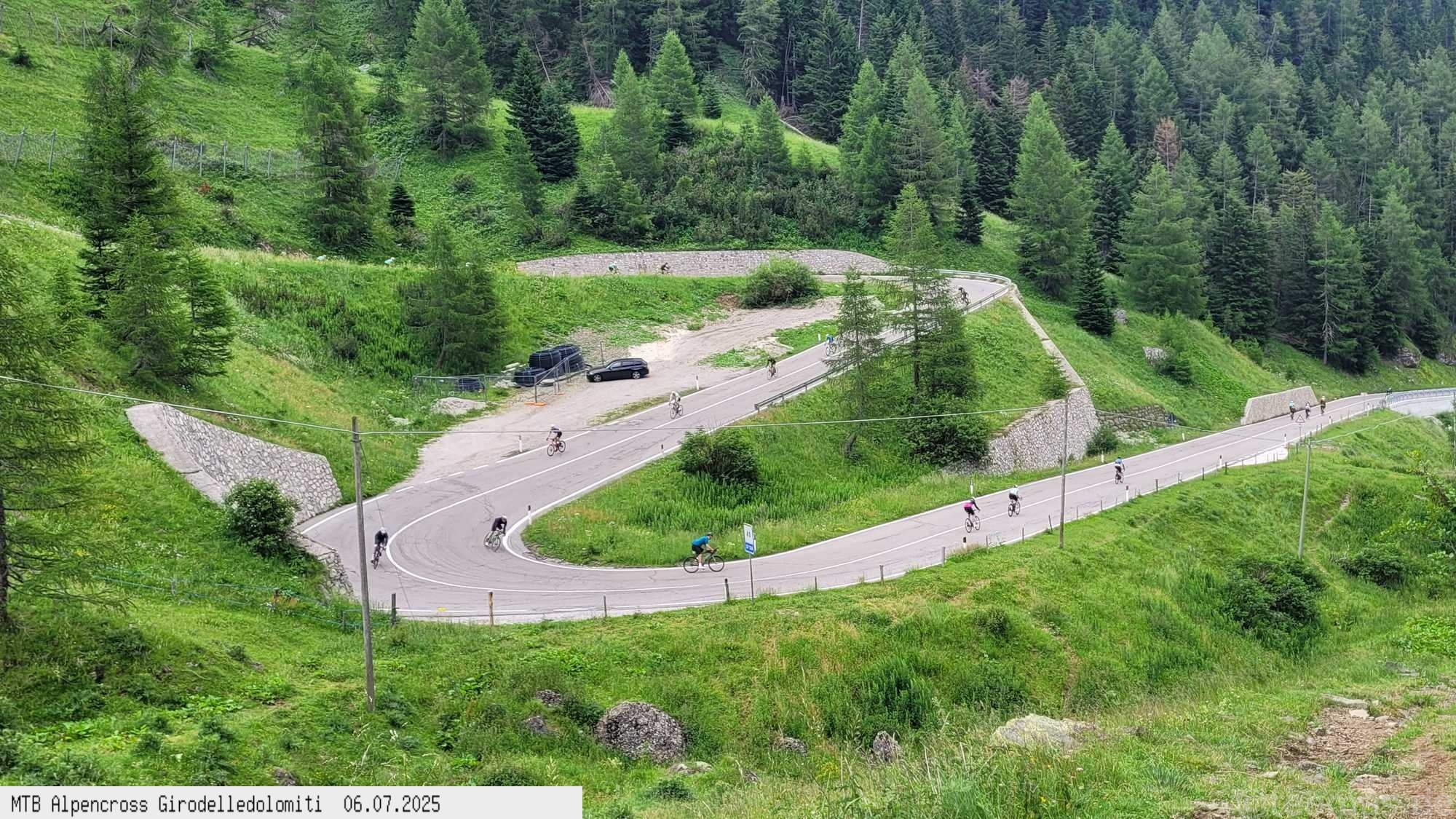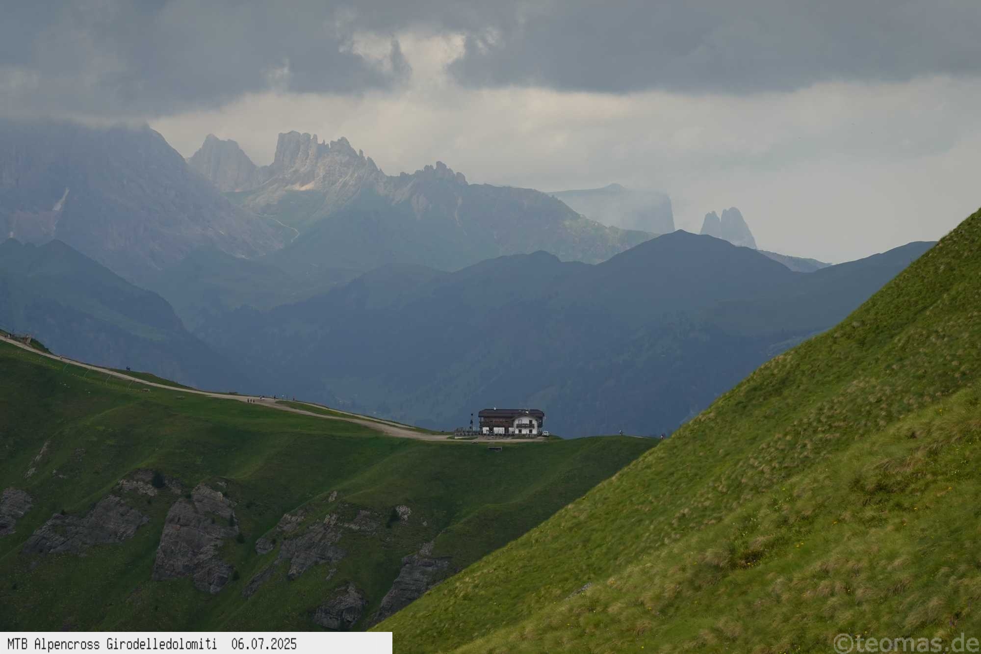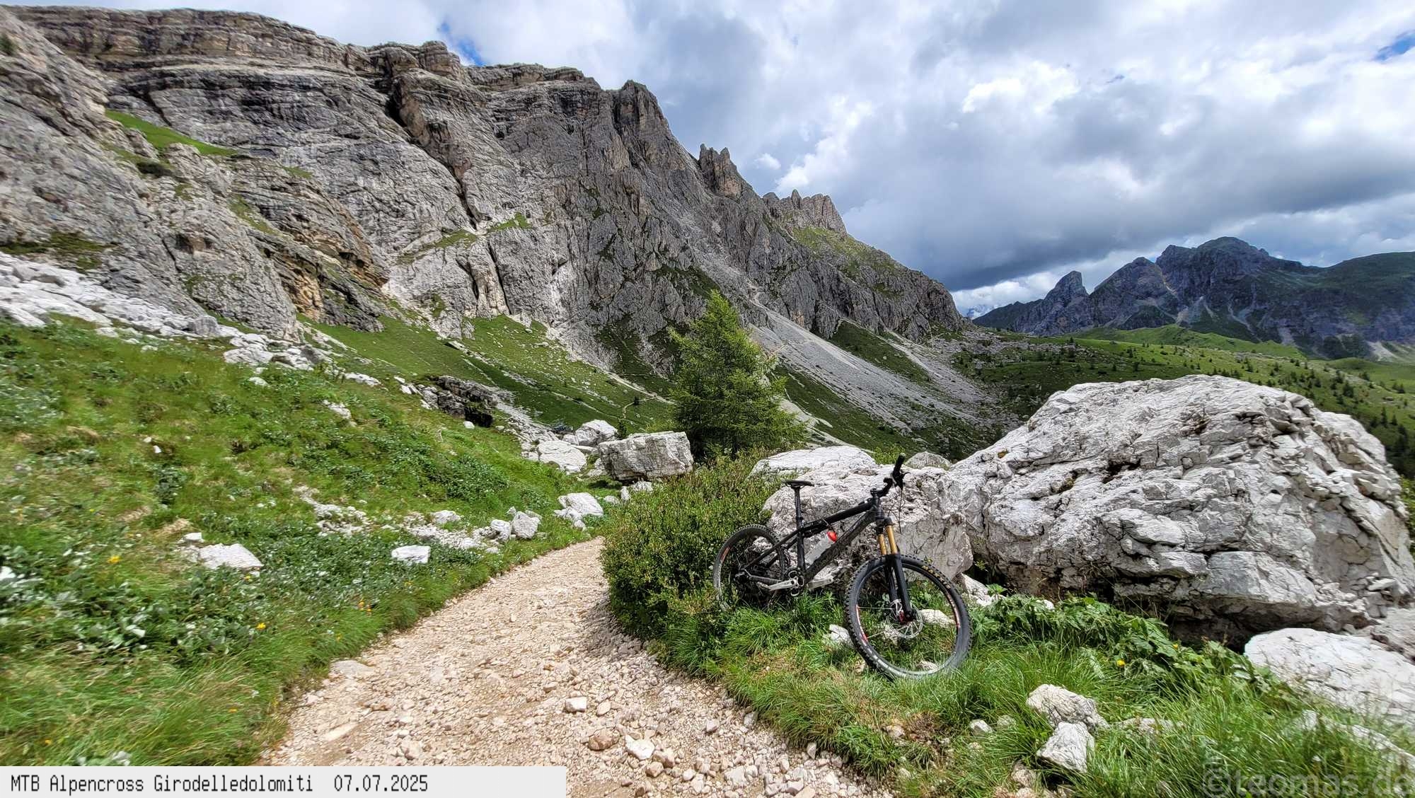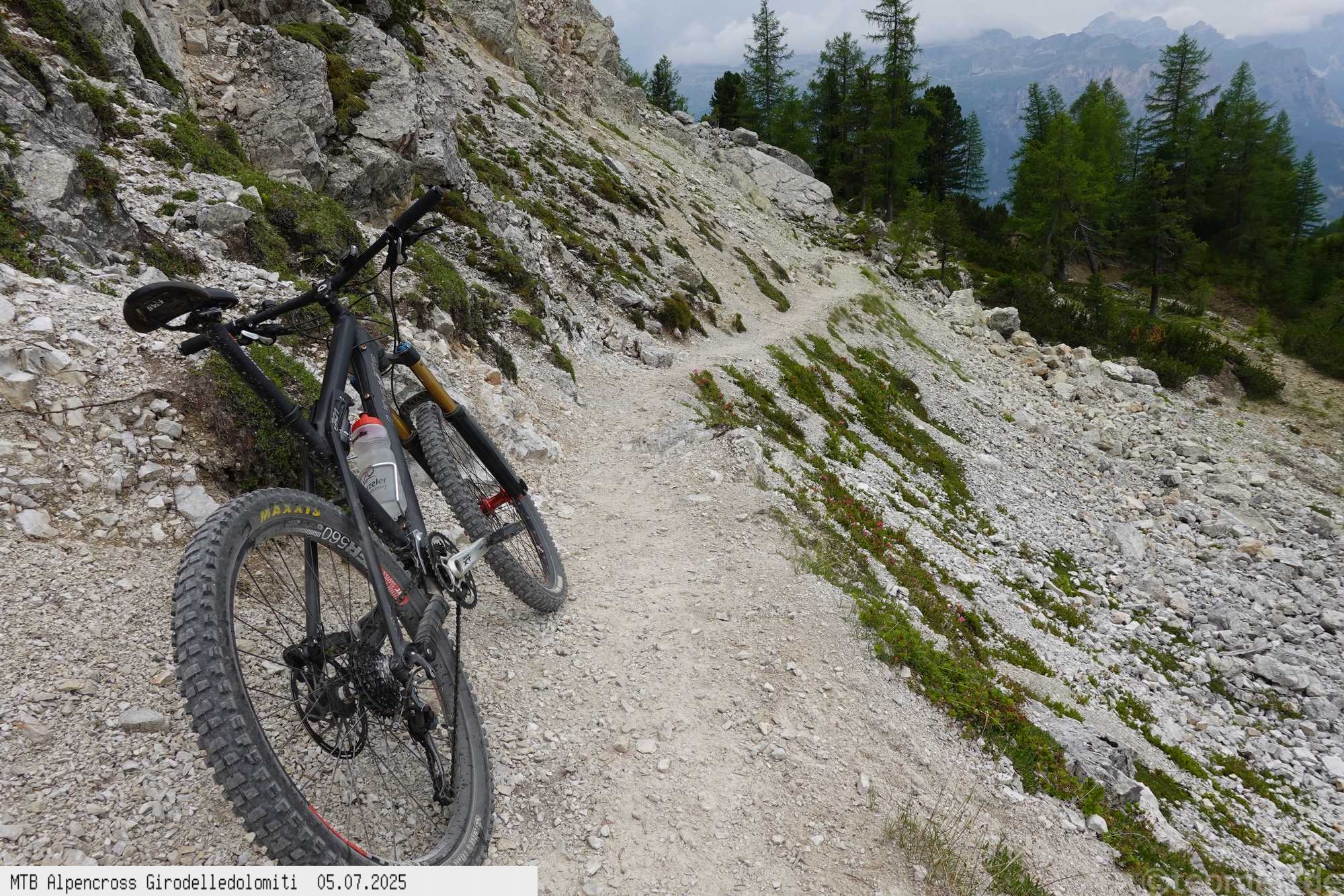 Gipfel. Anschließender Downhill erst auf Schotter, dann auf angelegtem Trail bis Passo Campolongo, wo hunderte Rennradler zum Paß hochstrampelten.