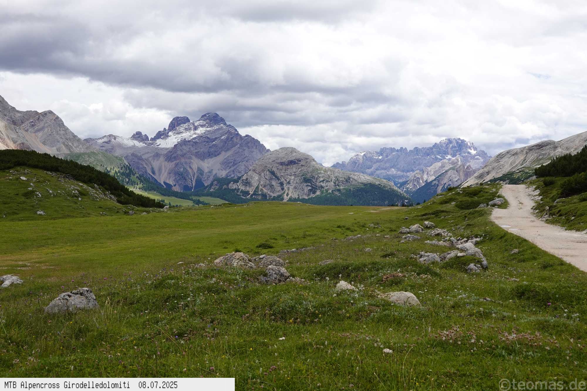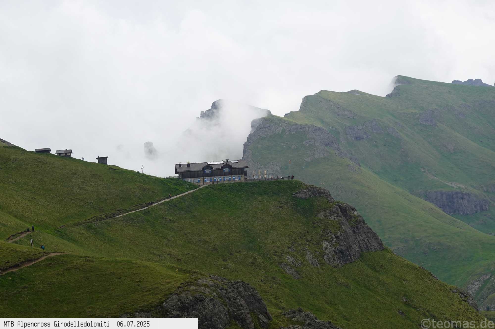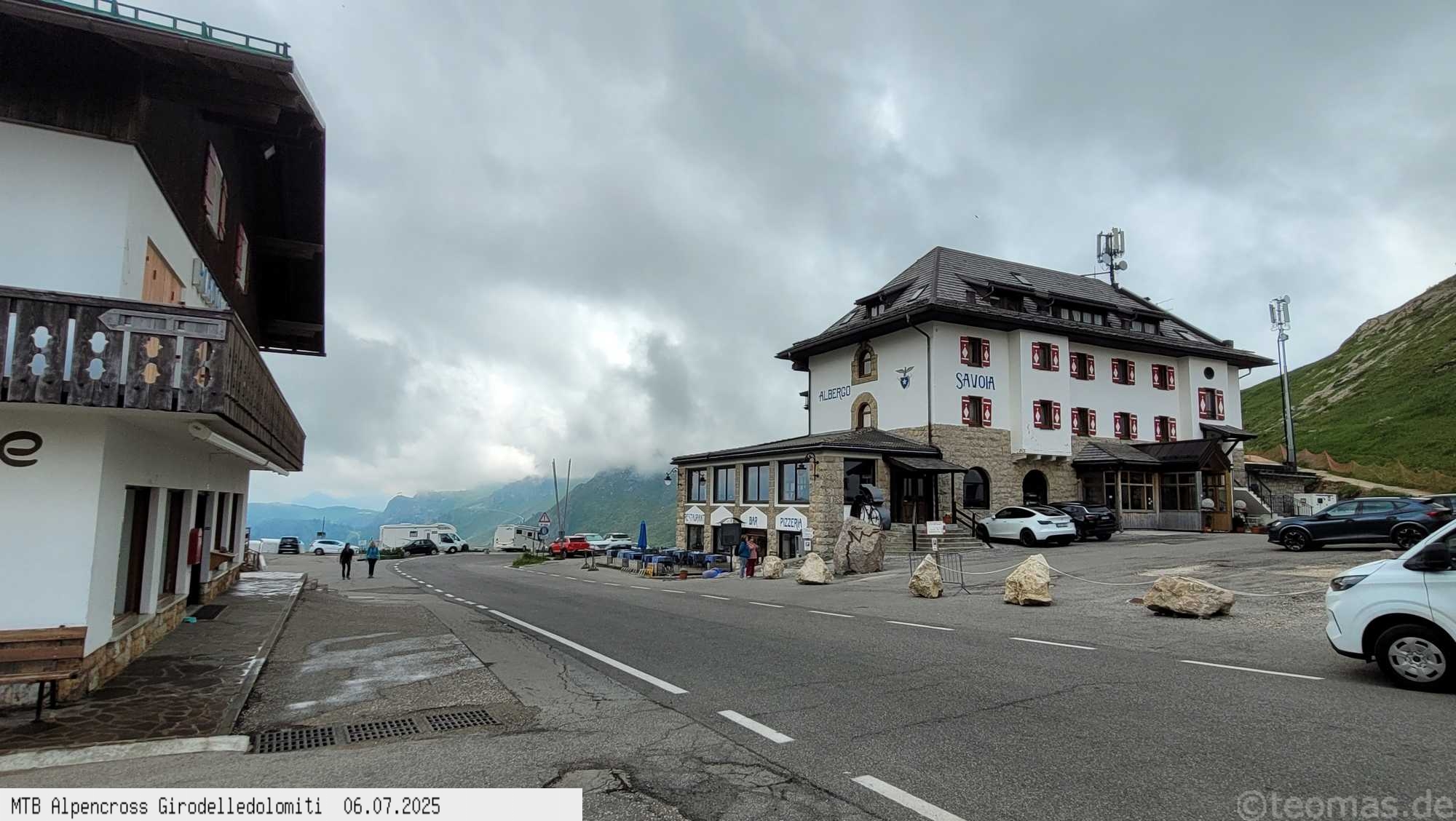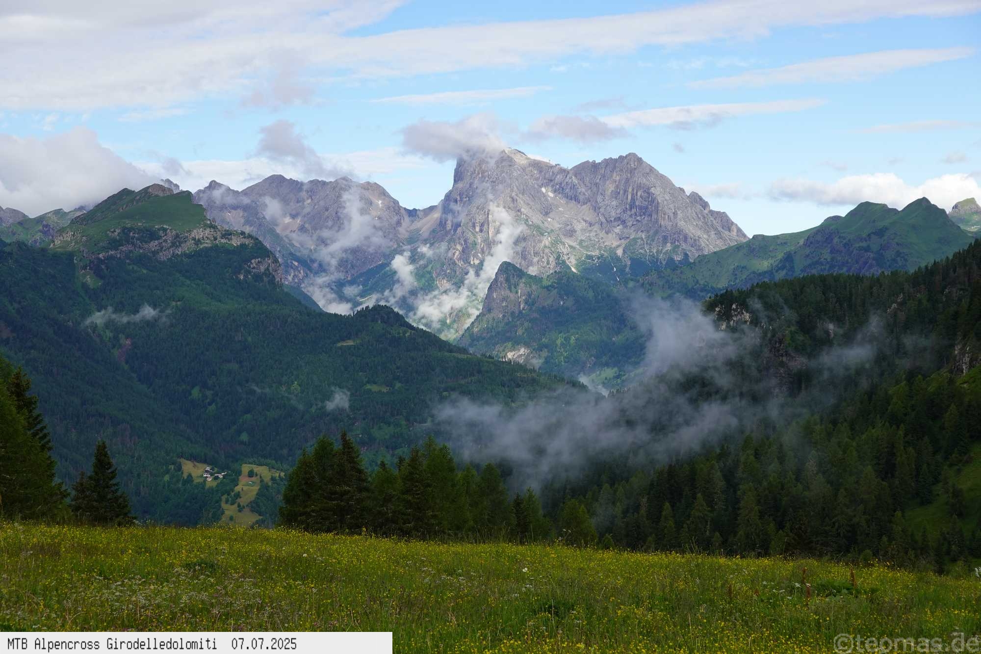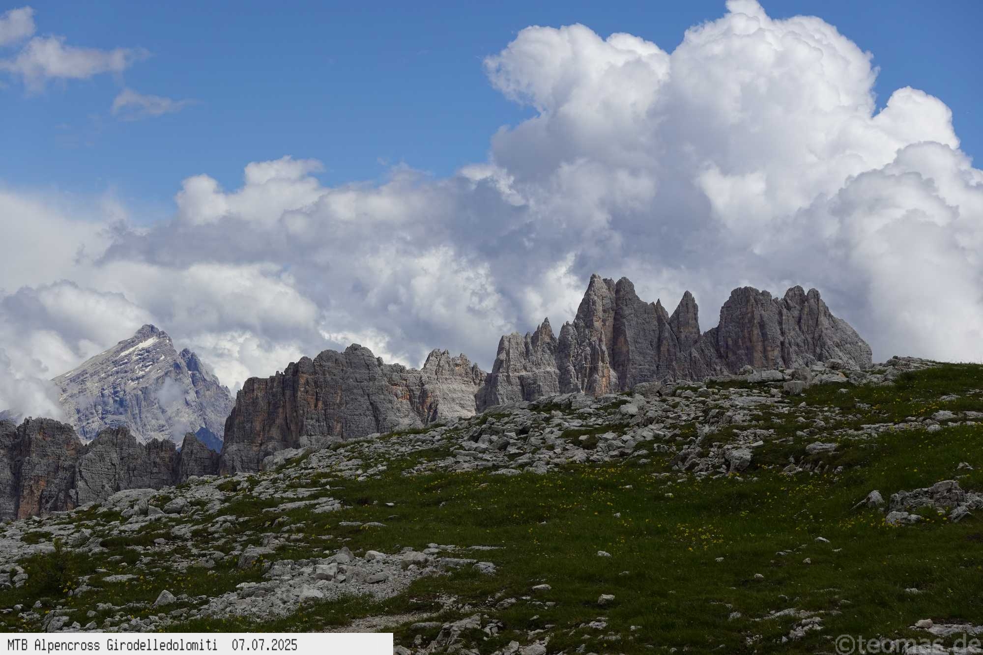 Gipfel. Anschließender Downhill erst auf Schotter, dann auf angelegtem Trail bis Passo Campolongo, wo hunderte Rennradler zum Paß hochstrampelten.