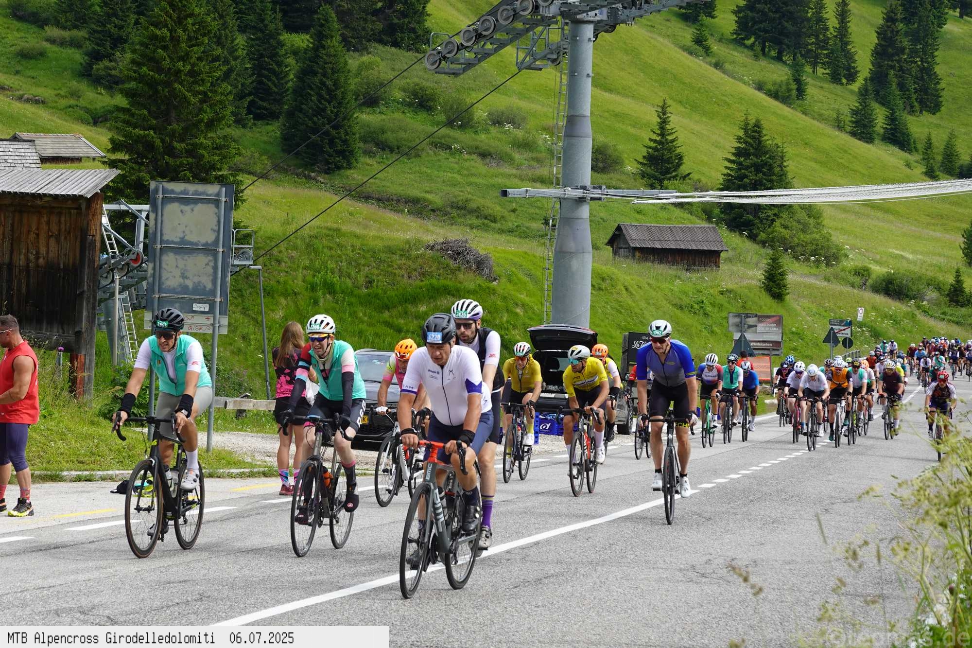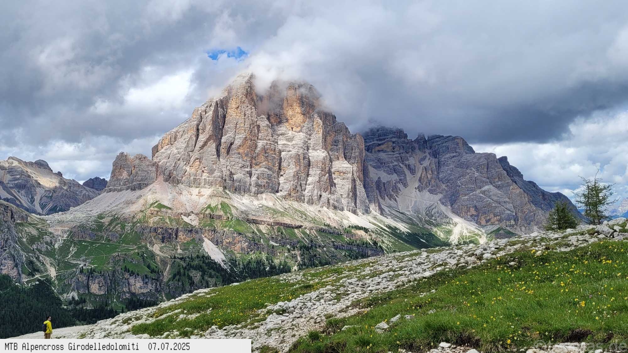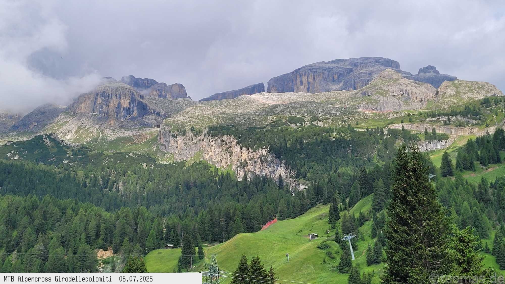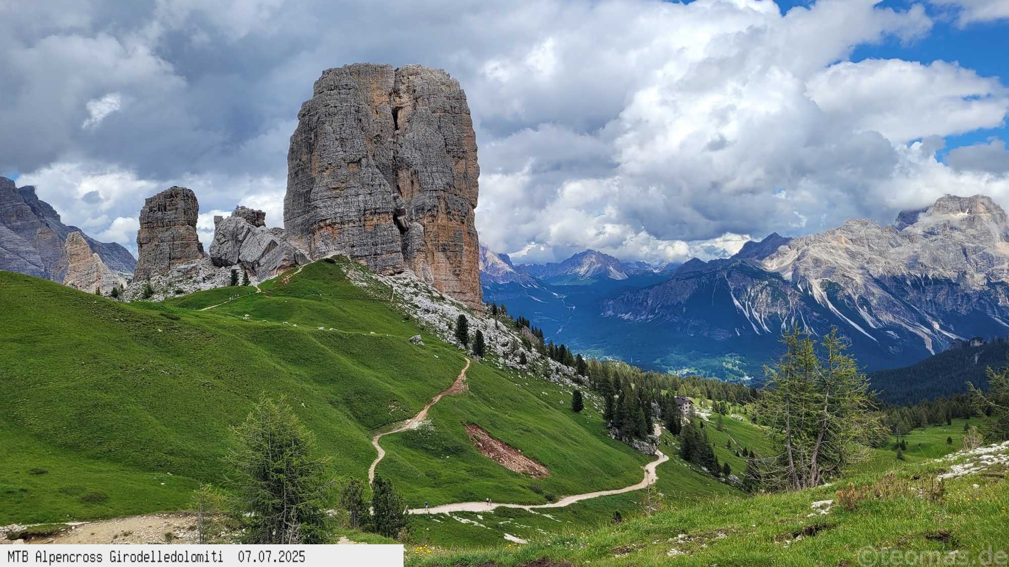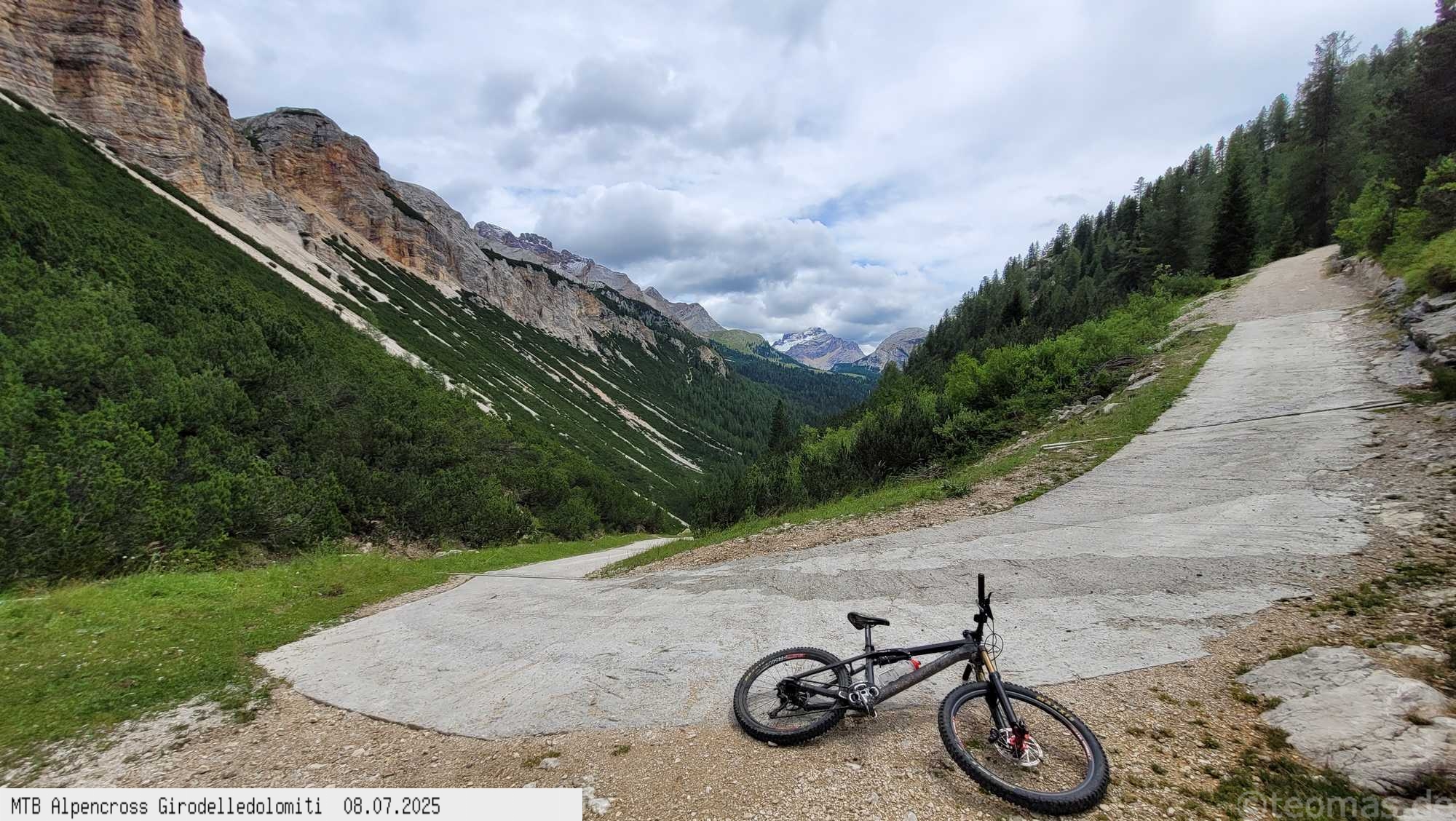Gipfel. Anschließender Downhill erst auf Schotter, dann auf angelegtem Trail bis Passo Campolongo, wo hunderte Rennradler zum Paß hochstrampelten.