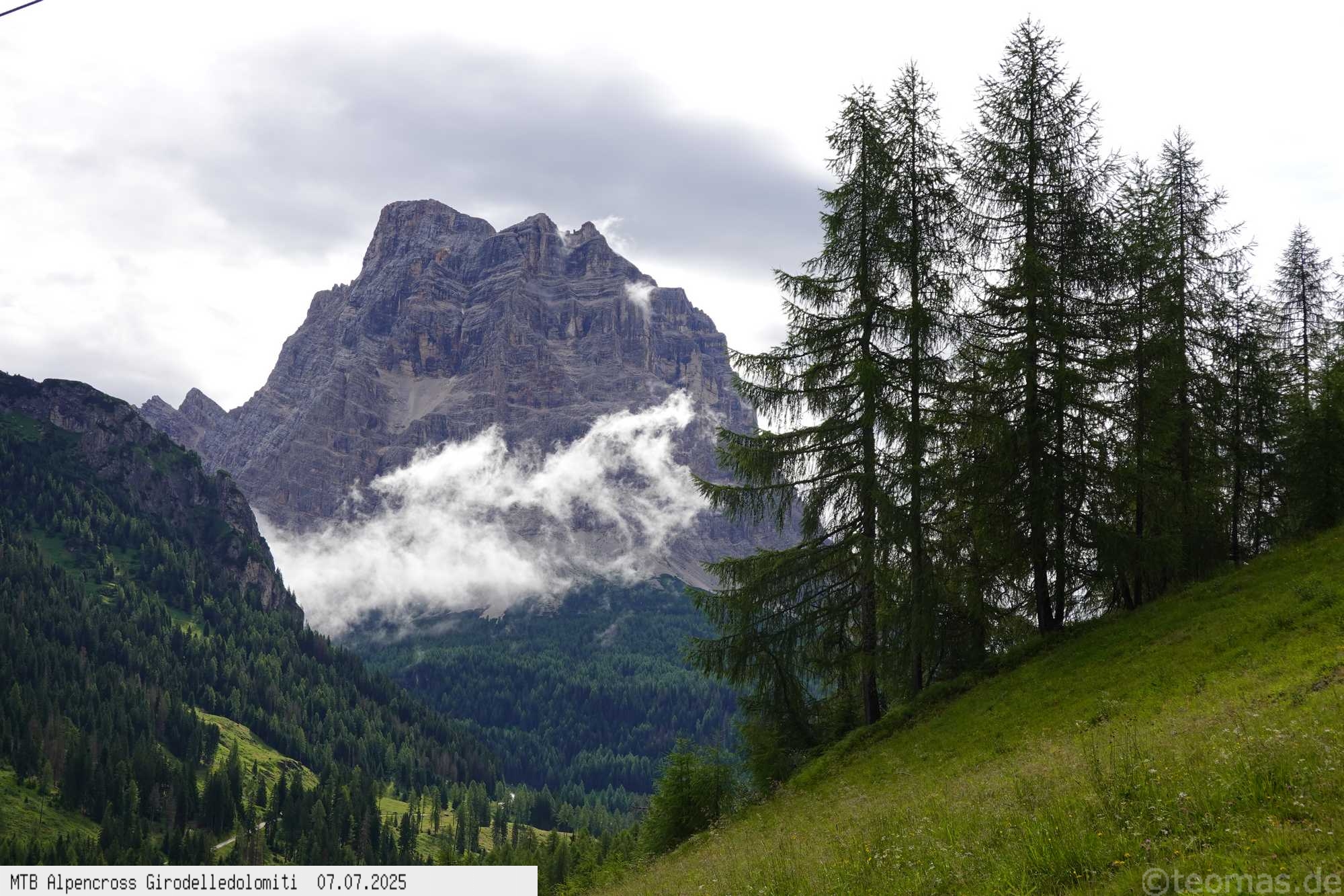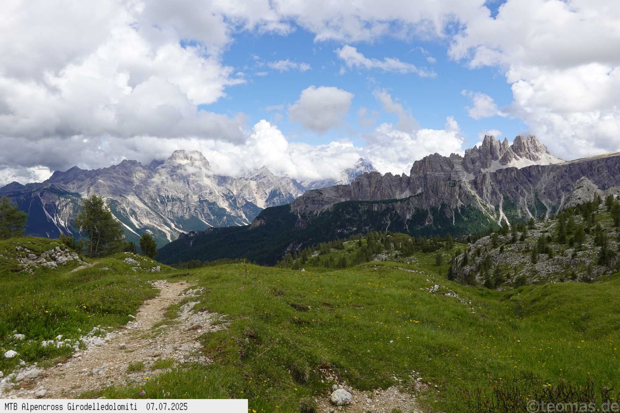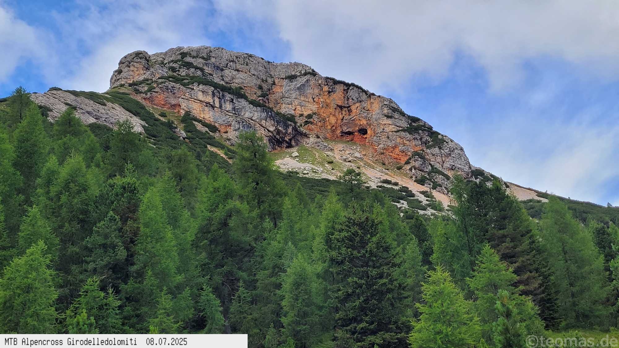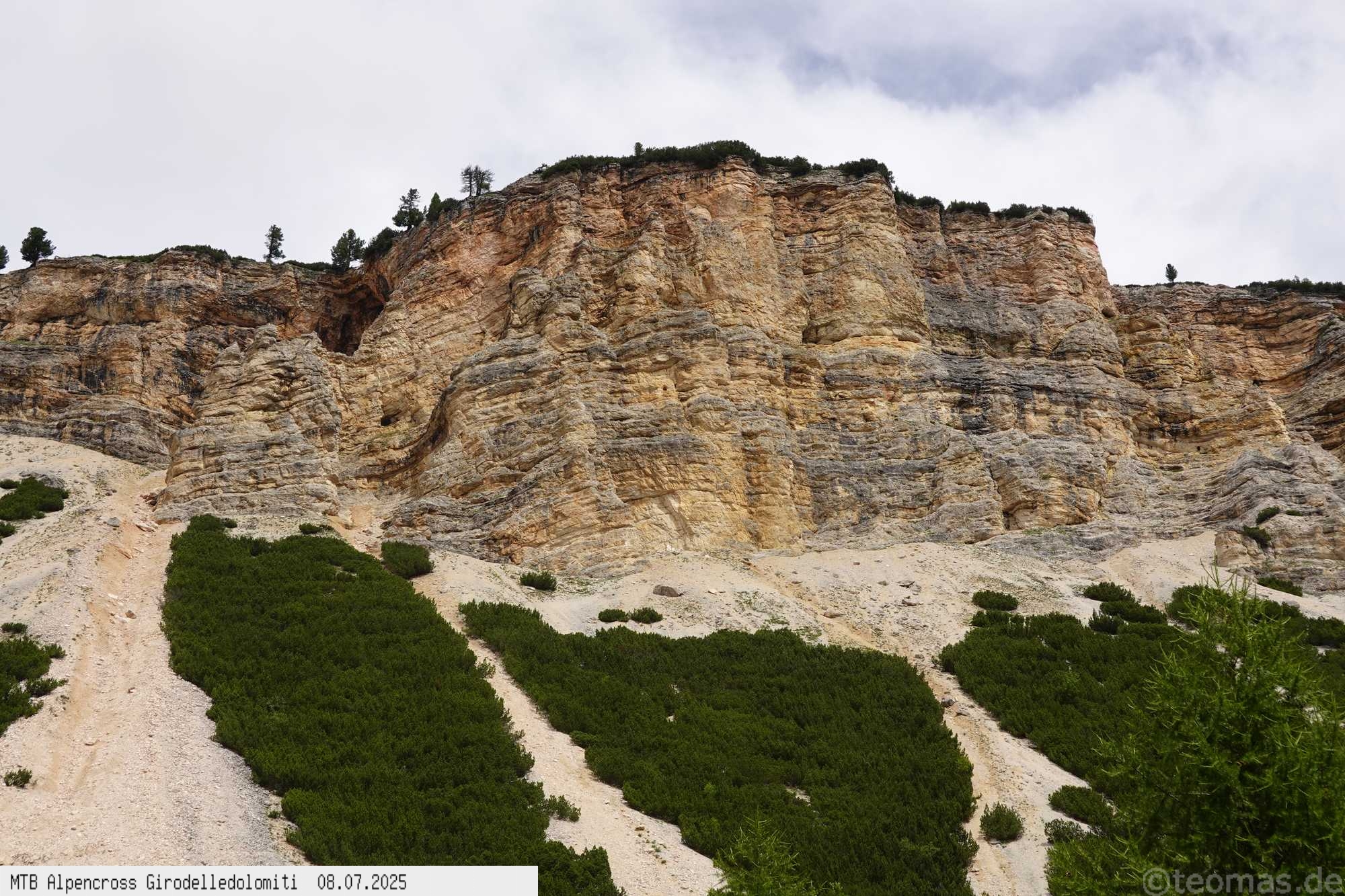 mit 18-22% Steigung oft Schieben angesagt. Man wanderte entlang der imposanten Felswände der Kreuzkofelgruppe. Sehr schwül an diesem Tag!