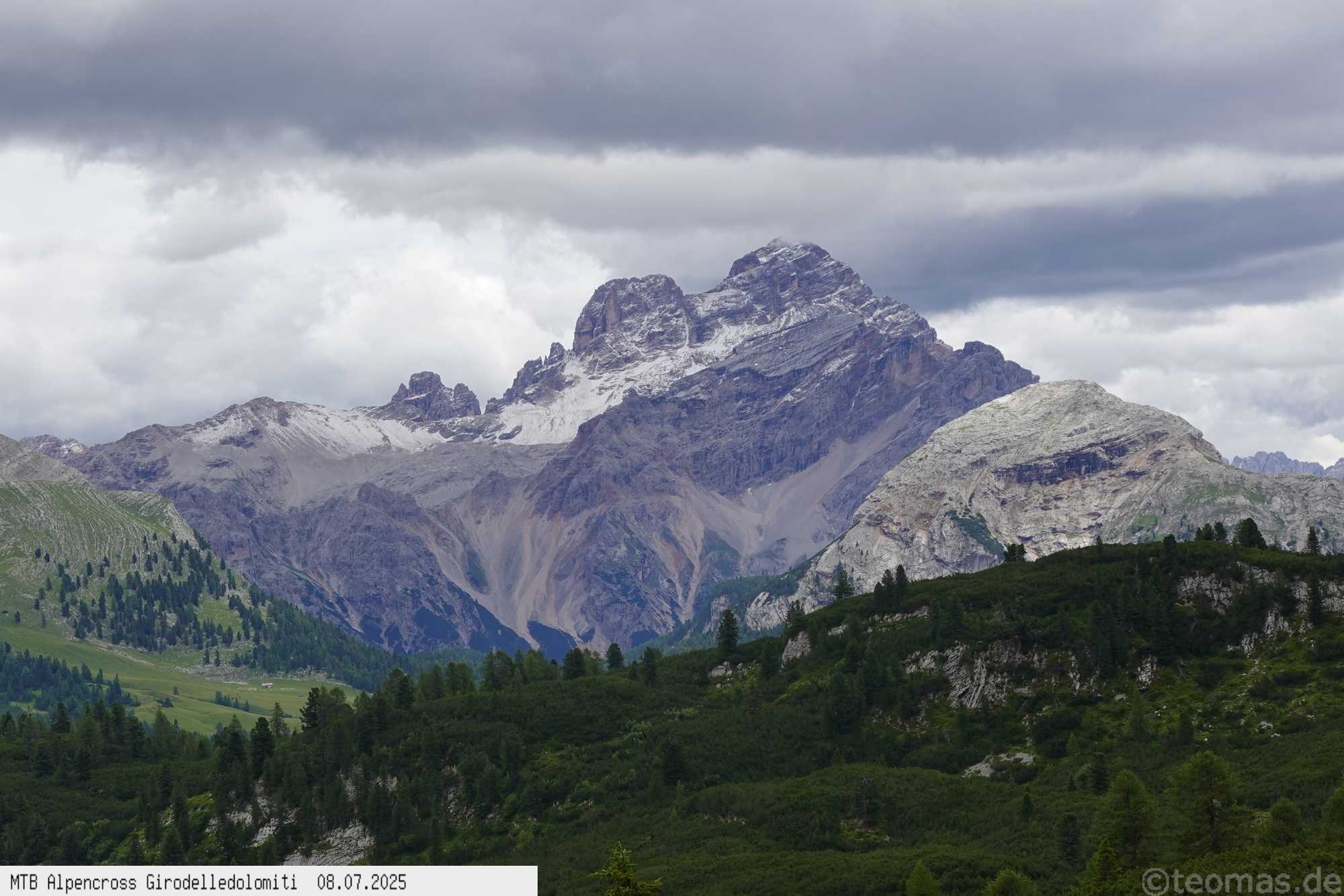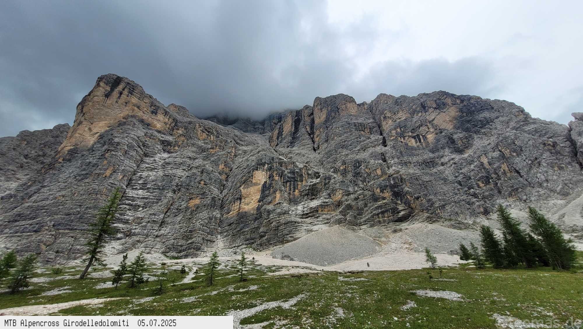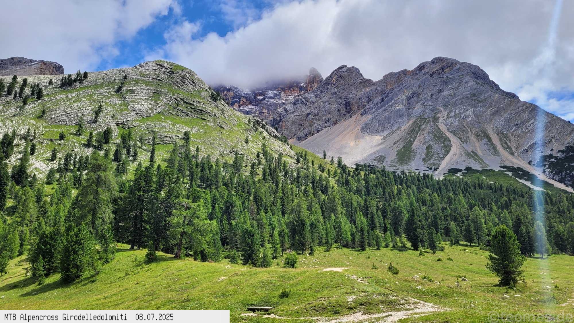 mit 18-22% Steigung oft Schieben angesagt. Man wanderte entlang der imposanten Felswände der Kreuzkofelgruppe. Sehr schwül an diesem Tag!