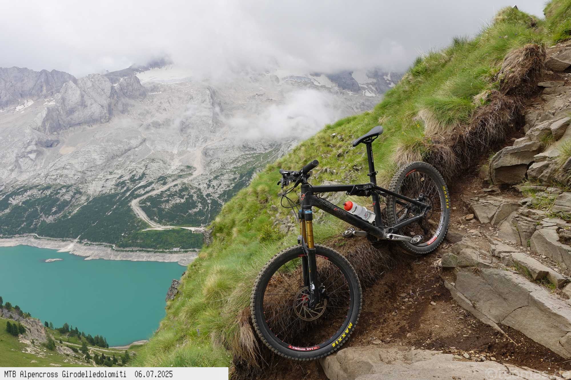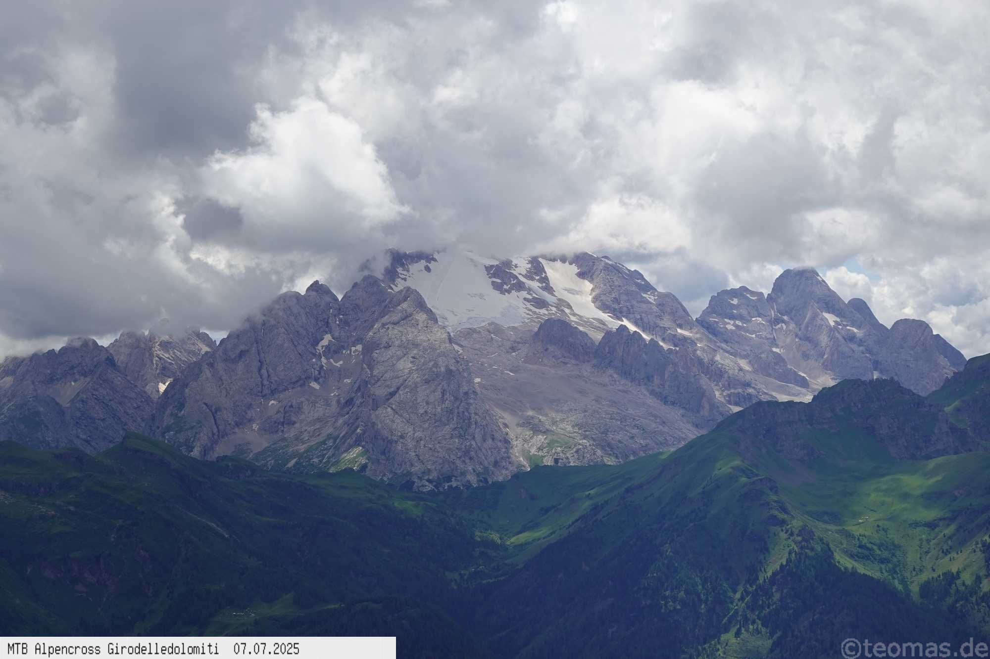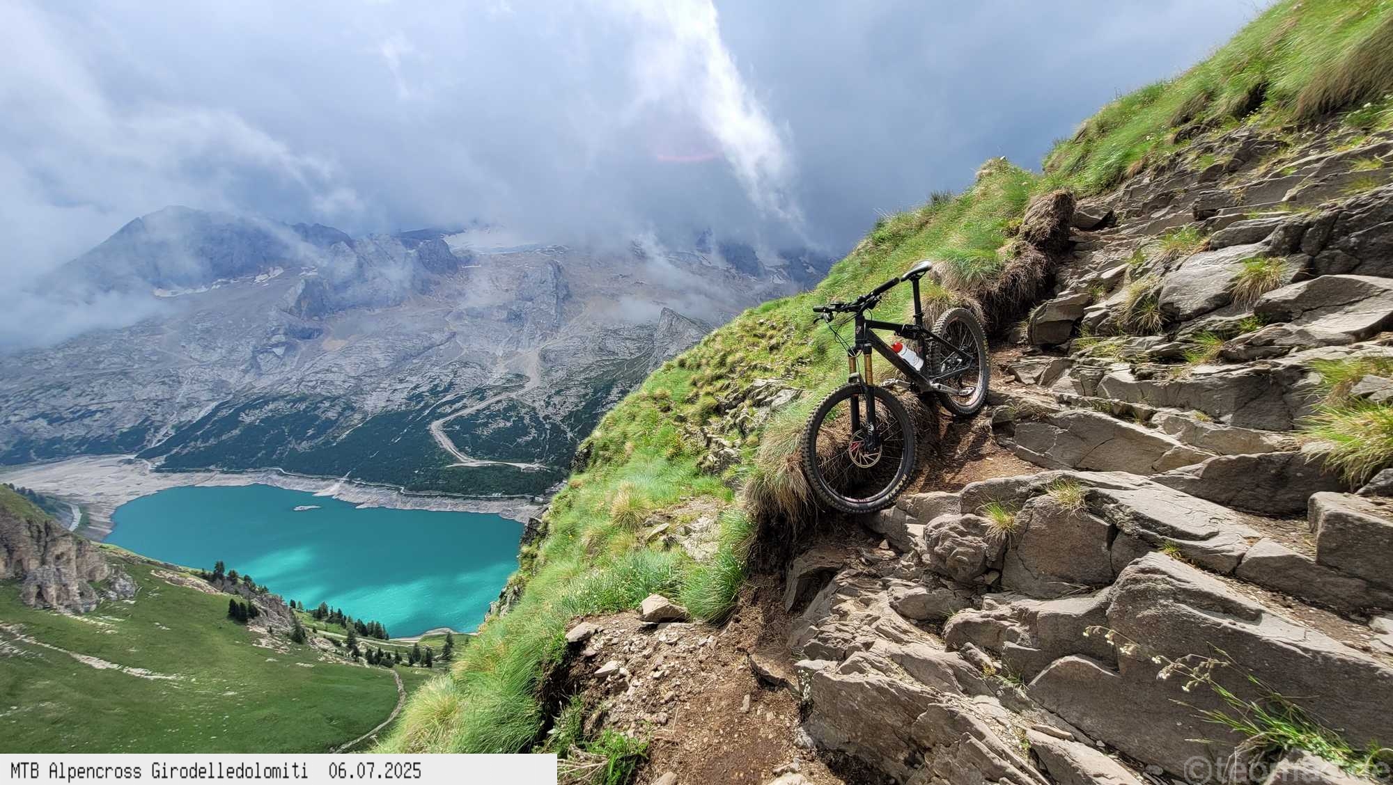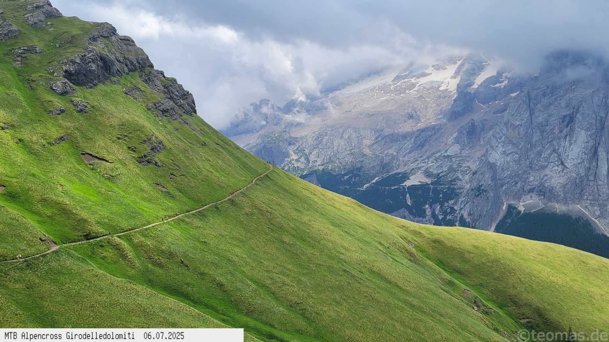 Schiebestück und dann auf schmalem Wanderpfad am Hang entlang mit grandiosen Ausblicken auf die Marmolada, toller Wolkenstimmung inklusive! Durch die Rennrad
