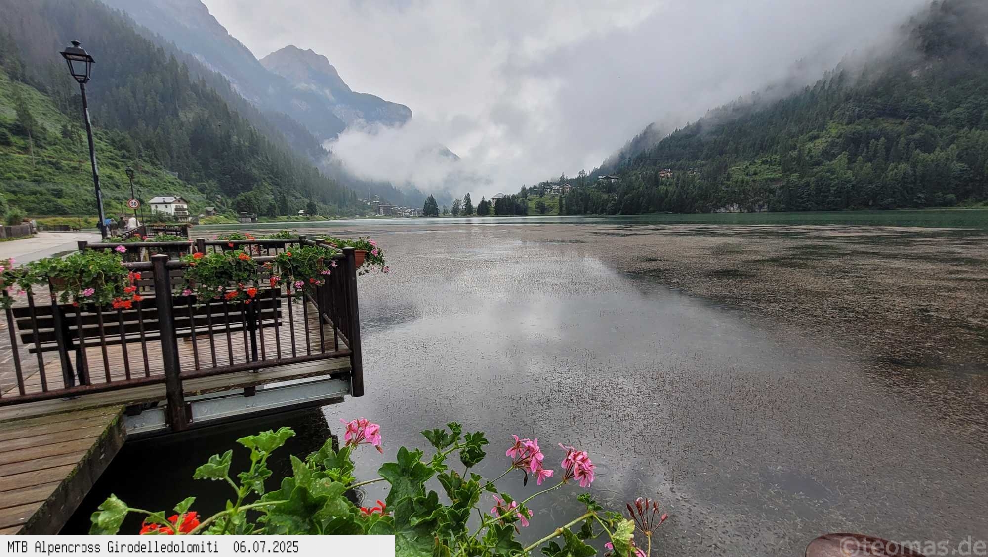 Gegen 14:30 Uhr an der Padon Hütte bereits im Regen ankommend entschied ich mich für die Abkürzung der Strecke direkt zum Fedaia See hinunter zur
