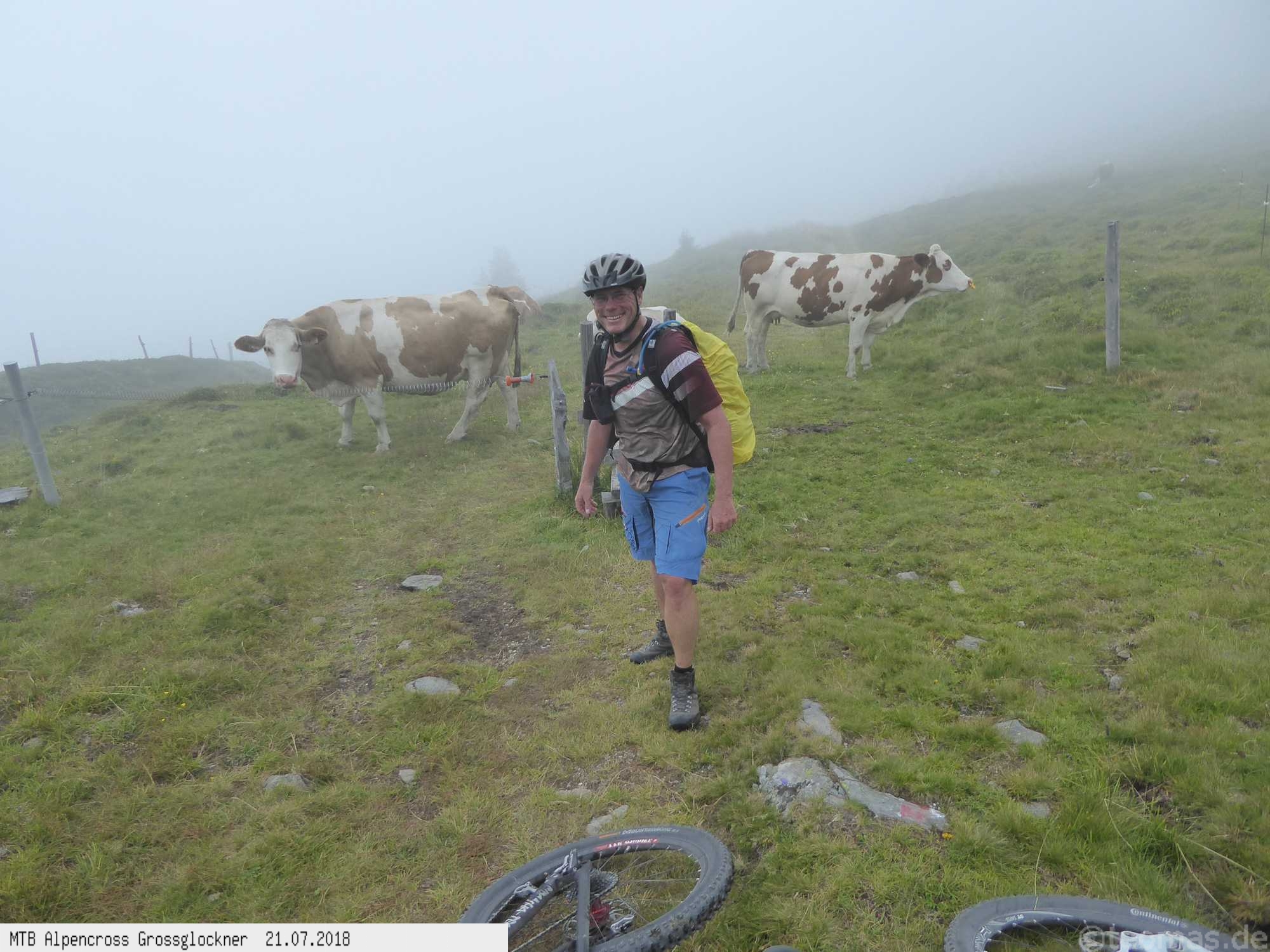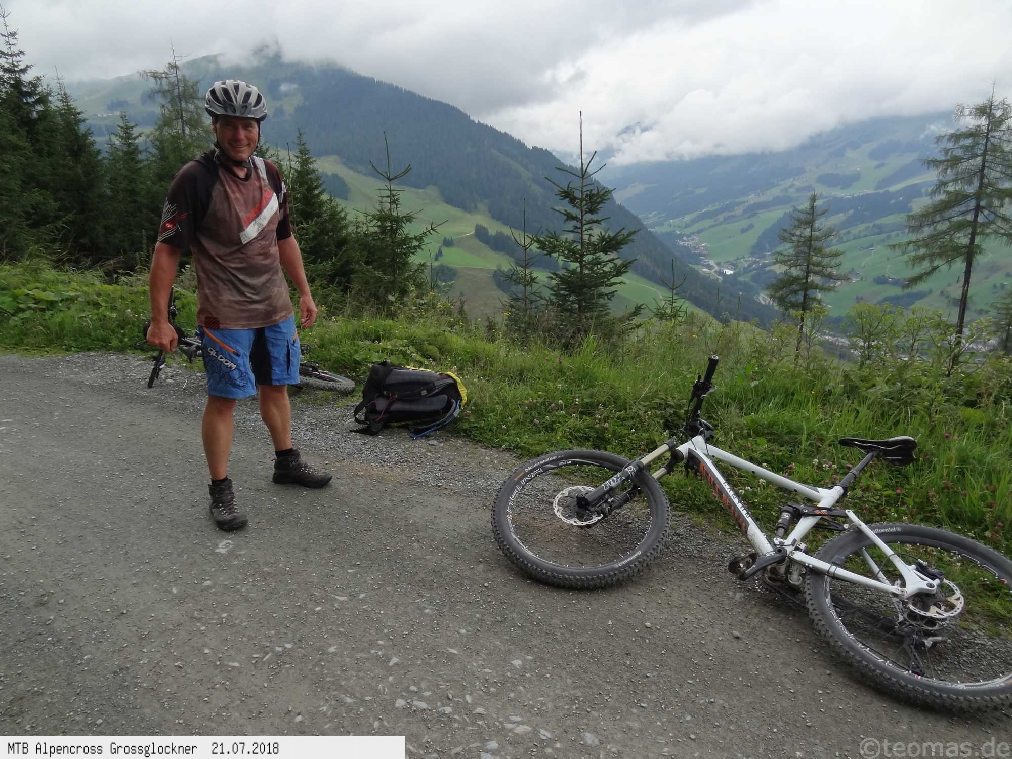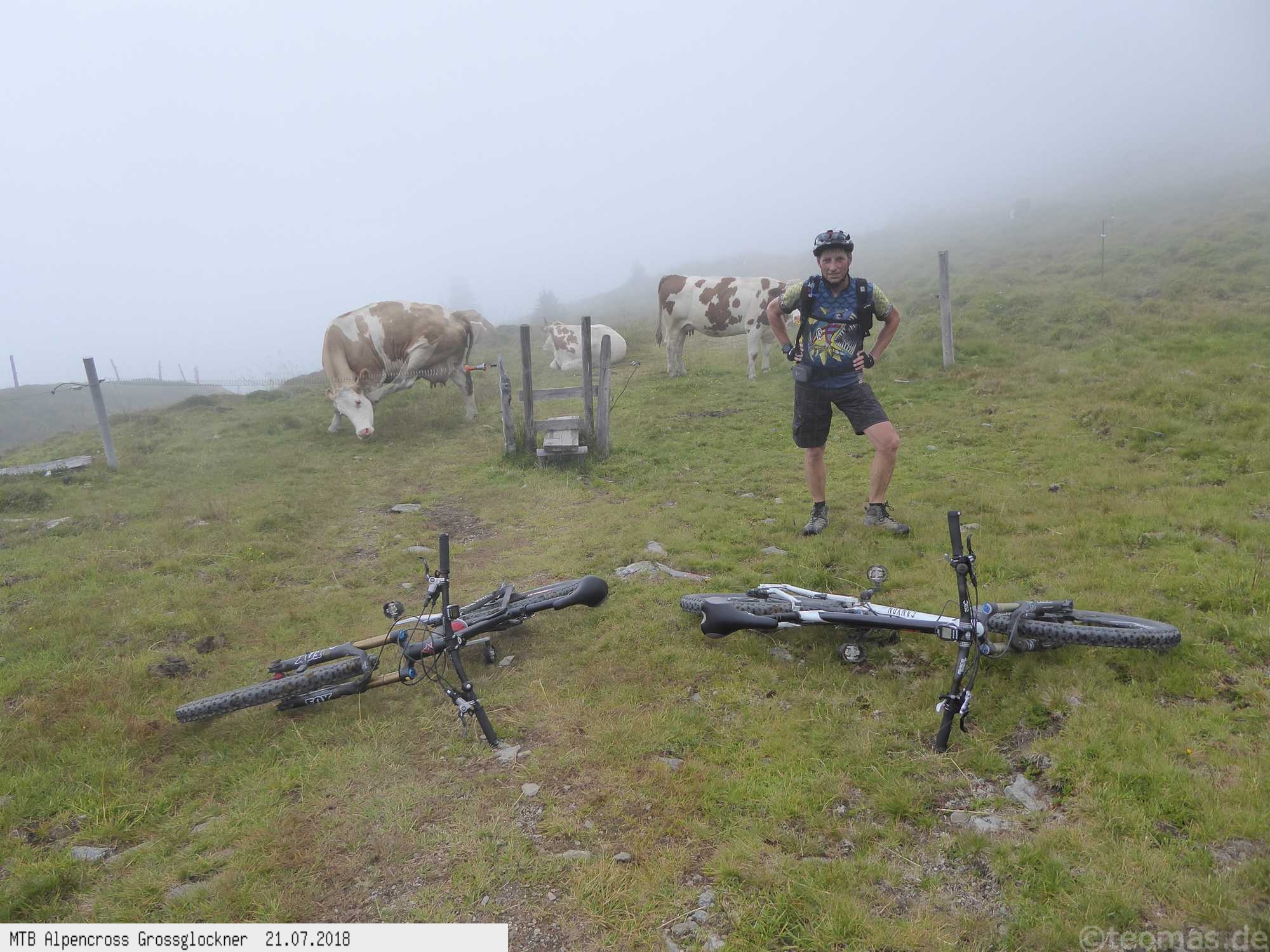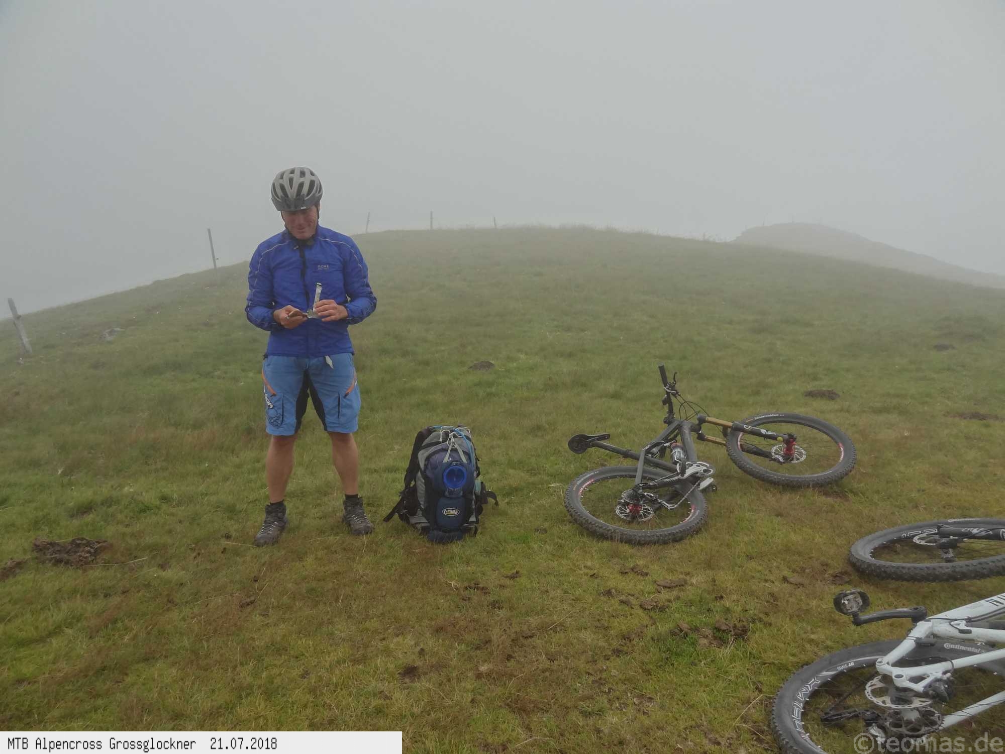Anfänglich gute Wetterprognose zum Start am Parkplatz in Glasenbach bei Salzburg. Radeln Richtung Bad Reichenhall mit Steigungen bis 22% auf Teer. Schieben zur Rötelbachalm auf Schotter mit 19% Steigung und heißen 31°C. Hinunter nach Ramsau, vorbei am Hintersee und hinauf zum Hirschbichl. Downhill nach Weißbach über den Römersattel nach Hochfilzen zum Hotel Edelweiß. Bereits am zweiten Tag Wetterumschwung. Noch trocken hinauf zum Spielberghaus und weiter nach Saalbach Hinterglemm ohne Regen. Hinauf zum Klinglertörl die letzten 200 Höhenmeter im Nebel schieben. Nach rasanter Trail- und Schotterabfahrt bis Piesendorf oberhalb der Salzach Mittagseinkehr und Weiterfahrt nach Bruck am Großglockner mit Übernachtung im Hotel Lukashansl.