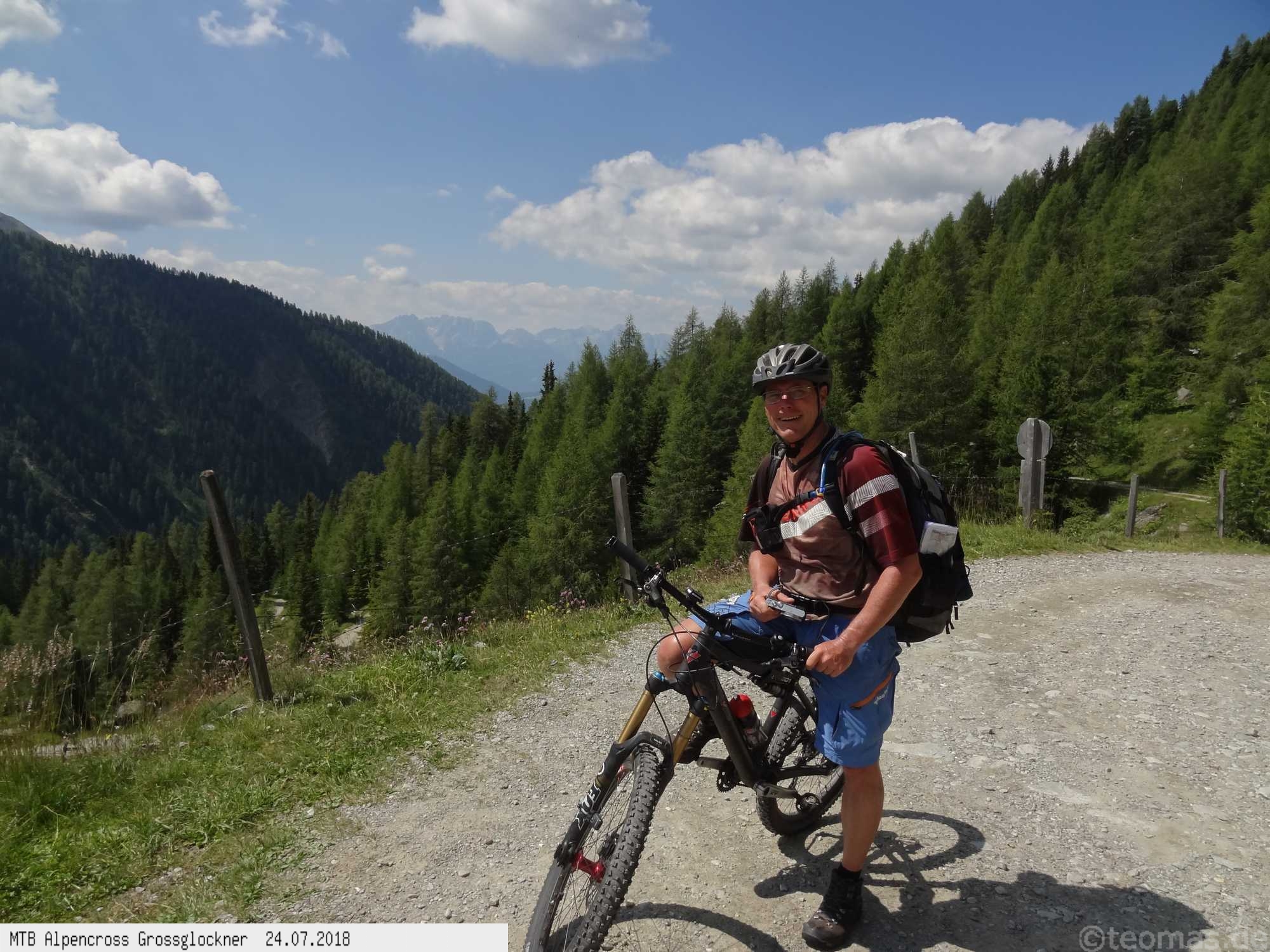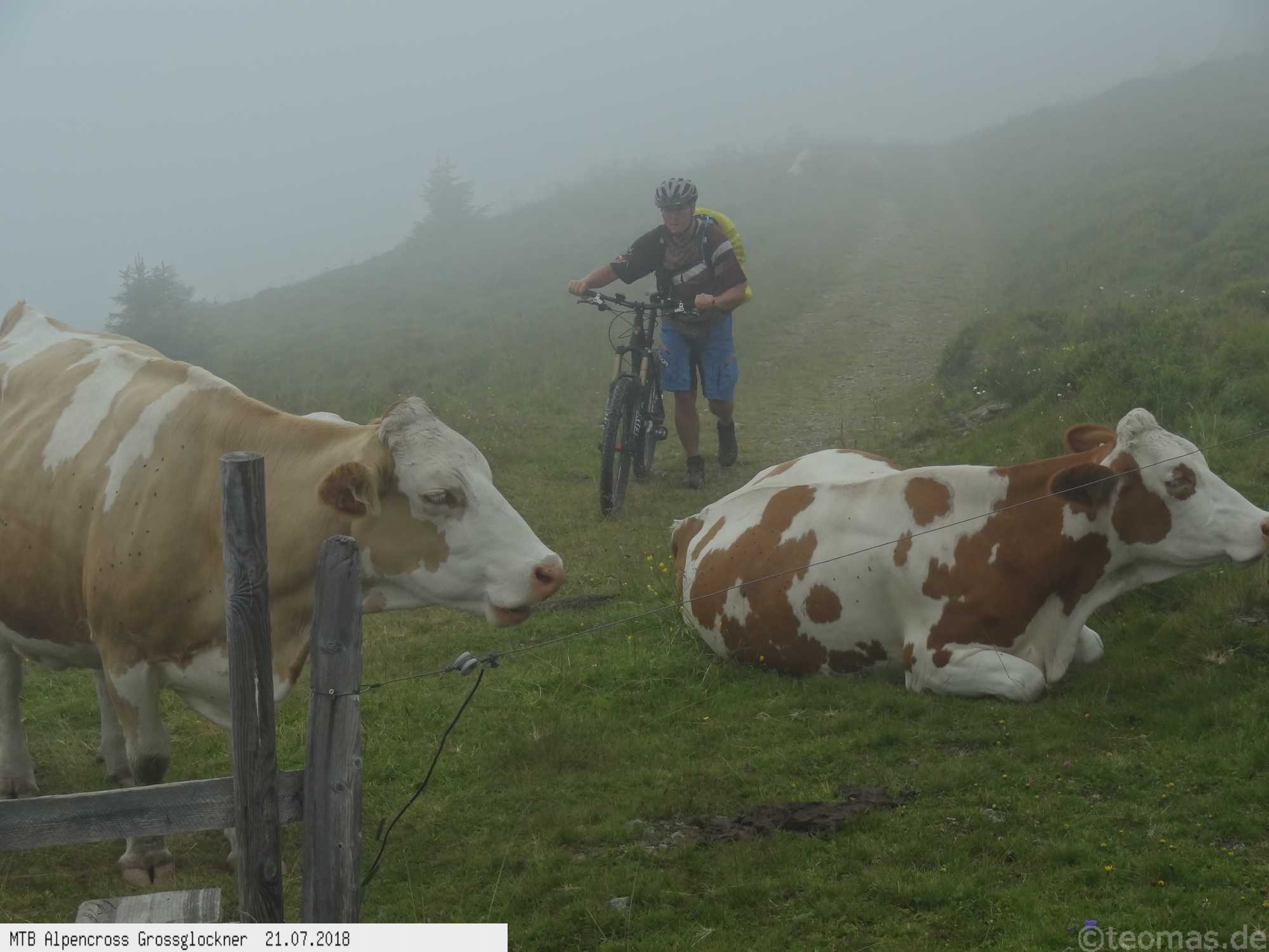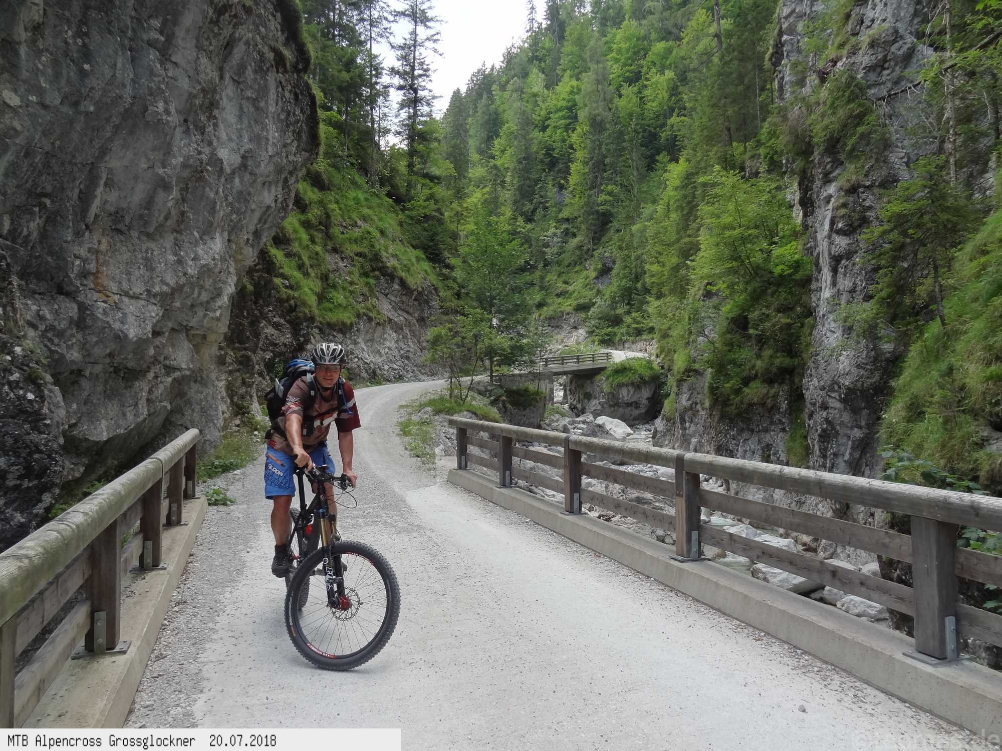 Anfänglich gute Wetterprognose zum Start am Parkplatz in Glasenbach bei Salzburg. Radeln Richtung Bad Reichenhall mit Steigungen bis 22% auf Teer. Schieben zur Rötelbachalm auf Schotter mit 19% Steigung und heißen 31°C. Hinunter nach Ramsau, vorbei am Hintersee und hinauf zum Hirschbichl. Downhill nach Weißbach über den Römersattel nach Hochfilzen zum Hotel Edelweiß. Bereits am zweiten Tag Wetterumschwung. Noch trocken hinauf zum Spielberghaus und weiter nach Saalbach Hinterglemm ohne Regen. Hinauf zum Klinglertörl die letzten 200 Höhenmeter im Nebel schieben. Nach rasanter Trail- und Schotterabfahrt bis Piesendorf oberhalb der Salzach Mittagseinkehr und Weiterfahrt nach Bruck am Großglockner mit Übernachtung im Hotel Lukashansl.