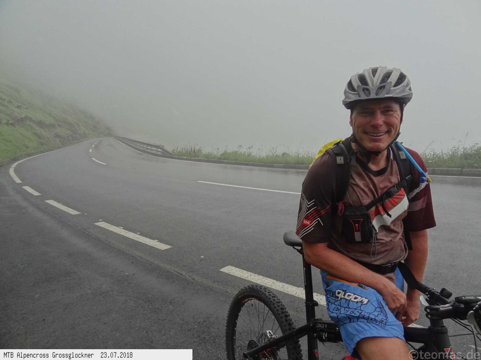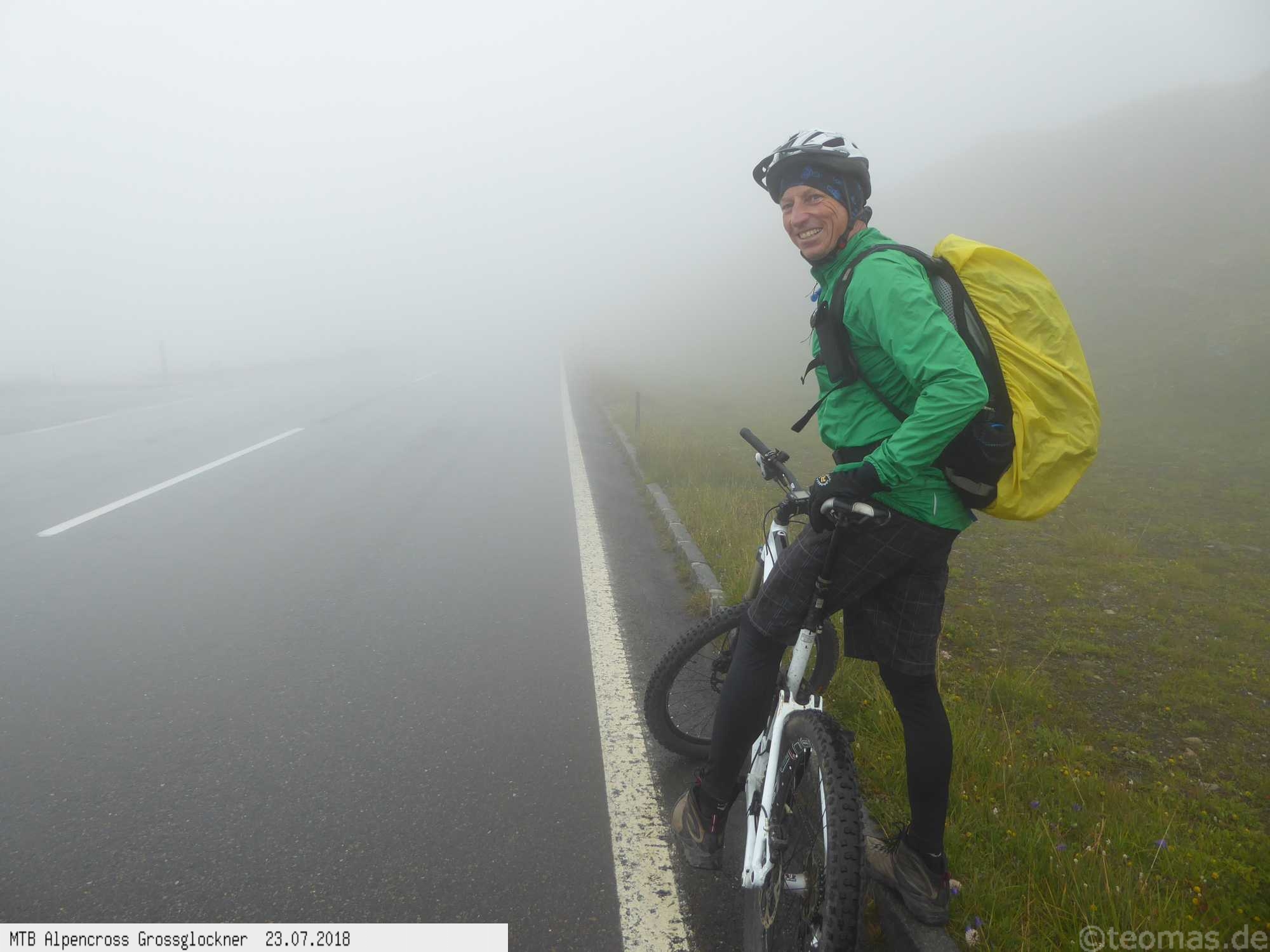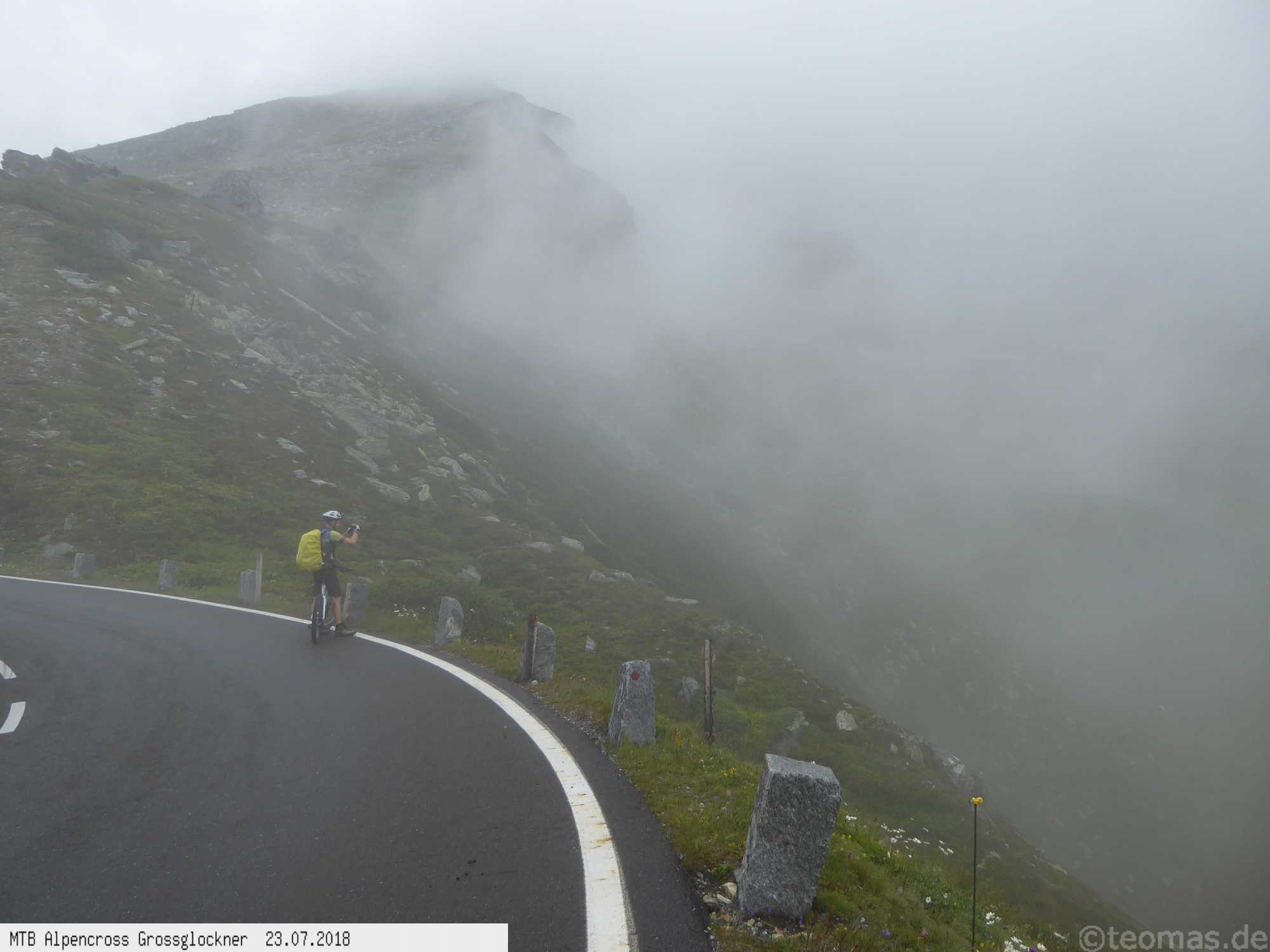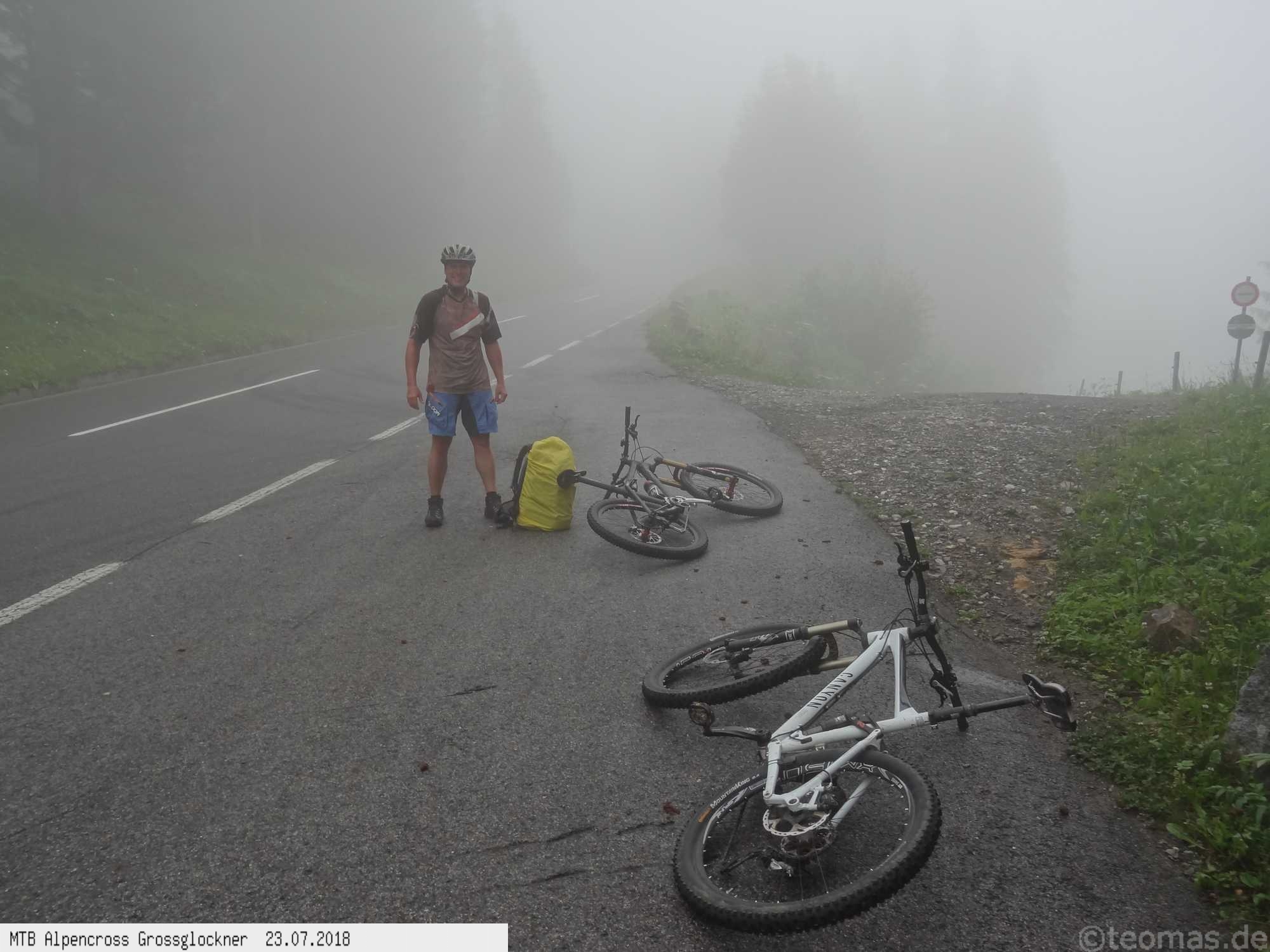 Am Morgen des dritten Tages Regen. Wir wagten es trotzdem, den Großglockner zu erklimmen, mussten aber im strömenden Regen nach 500 Hm kurz hinter Ferleiten abbrechen und nach Fusch zurückfahren. Ausrüstungspflege im Hotel Römerhof am frühen Vormittag! Den Rest des Tages mehr oder weniger im Hotel verbracht. Am 4. Tag hing der Nebel bis hinunter nach Fusch in den Bergen mit der Vorhersage: Oben wird es besser. Immerhin trocken, aber im dicken Nebel mit zum Teil nur 20 m Sicht bei 5°C war es nicht wirklich besser. Auf ca. 2.200 m mit allen verfügbaren Rad-Klamotten am Leib ohne große Pause bis nach Heiligenblut durchgefahren. Dort nach Schlotterabfahrt bei 16°C Mittagessen und weiter bis Winklern bei Lienz Hotel Tauerngold.