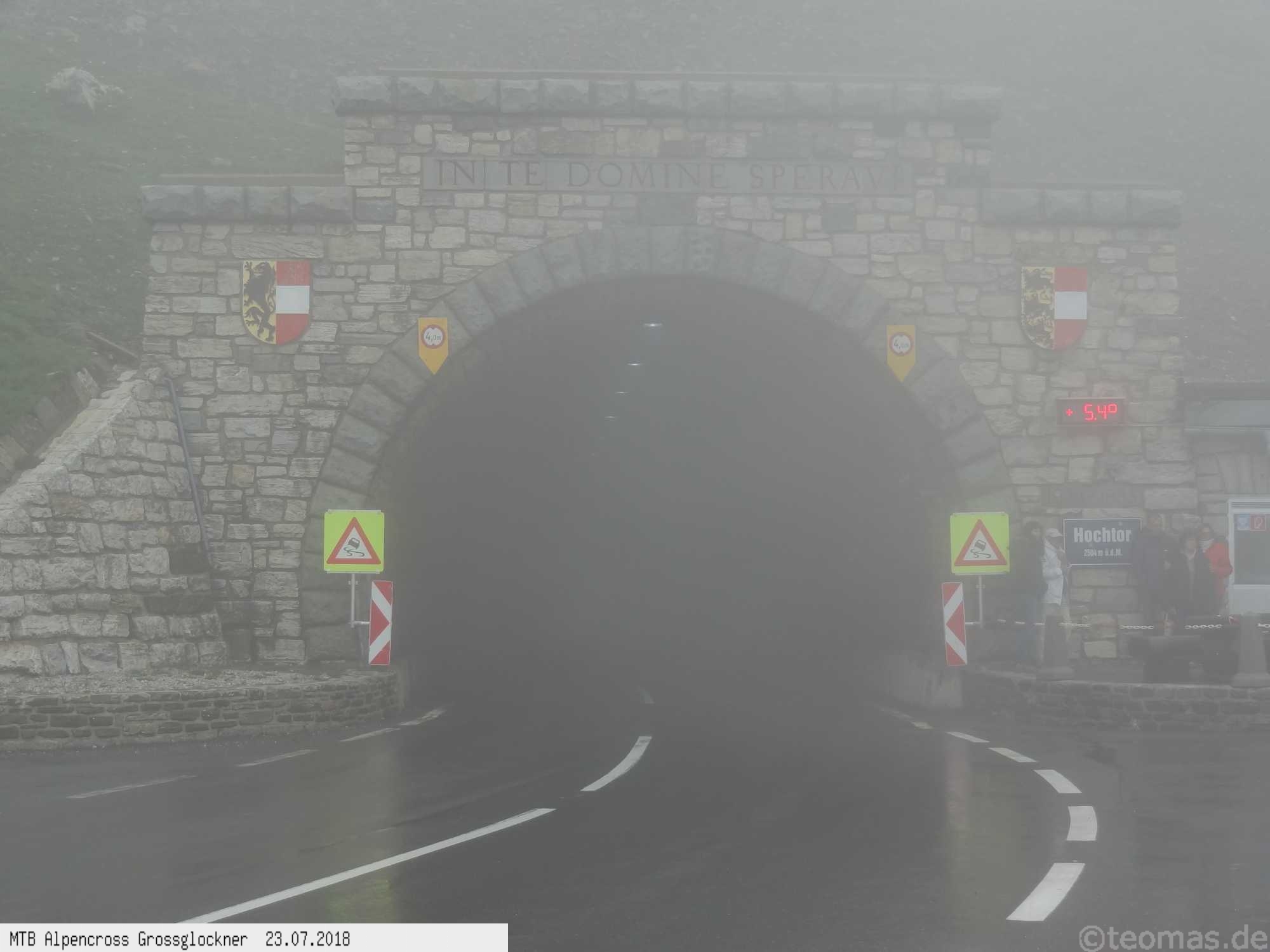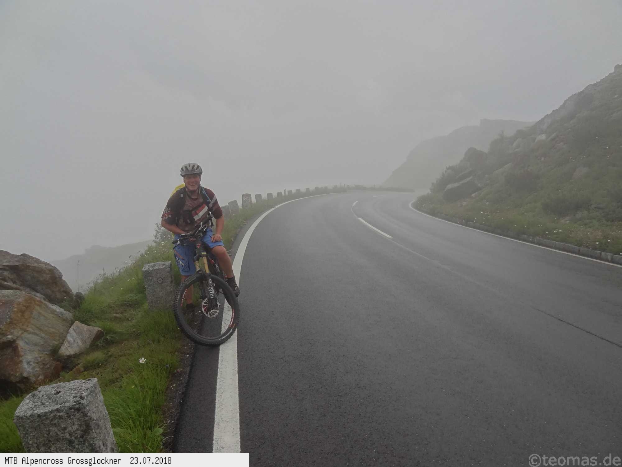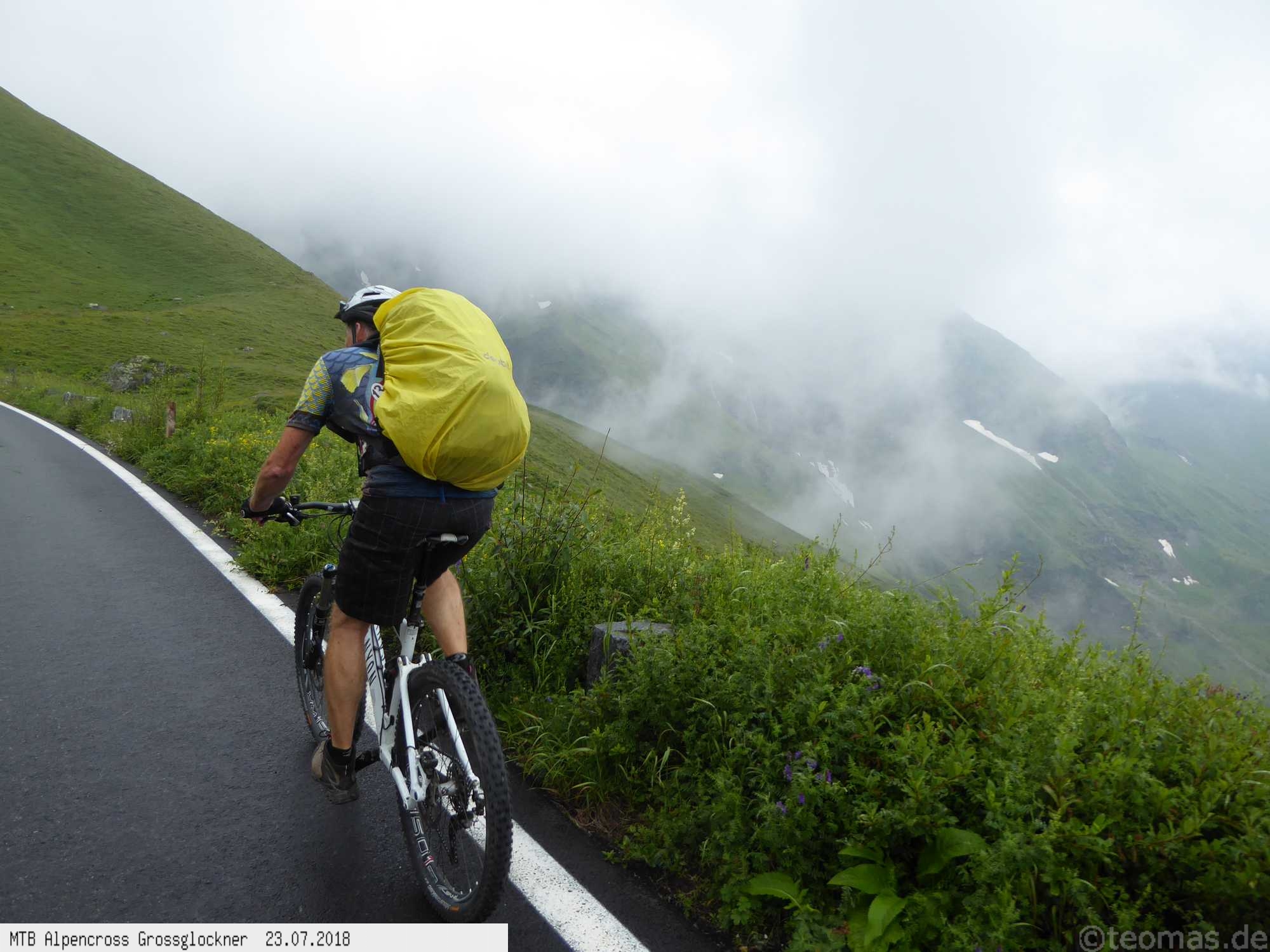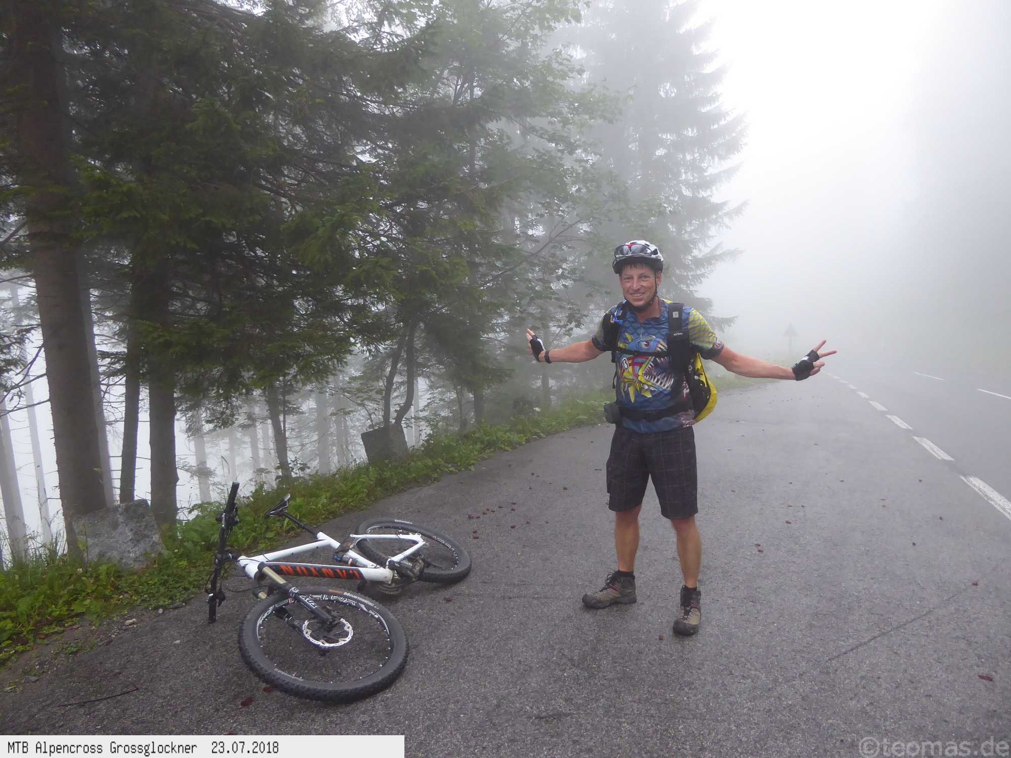 Am Morgen des dritten Tages Regen. Wir wagten es trotzdem, den Großglockner zu erklimmen, mussten aber im strömenden Regen nach 500 Hm kurz hinter Ferleiten abbrechen und nach Fusch zurückfahren. Ausrüstungspflege im Hotel Römerhof am frühen Vormittag! Den Rest des Tages mehr oder weniger im Hotel verbracht. Am 4. Tag hing der Nebel bis hinunter nach Fusch in den Bergen mit der Vorhersage: Oben wird es besser. Immerhin trocken, aber im dicken Nebel mit zum Teil nur 20 m Sicht bei 5°C war es nicht wirklich besser. Auf ca. 2.200 m mit allen verfügbaren Rad-Klamotten am Leib ohne große Pause bis nach Heiligenblut durchgefahren. Dort nach Schlotterabfahrt bei 16°C Mittagessen und weiter bis Winklern bei Lienz Hotel Tauerngold.