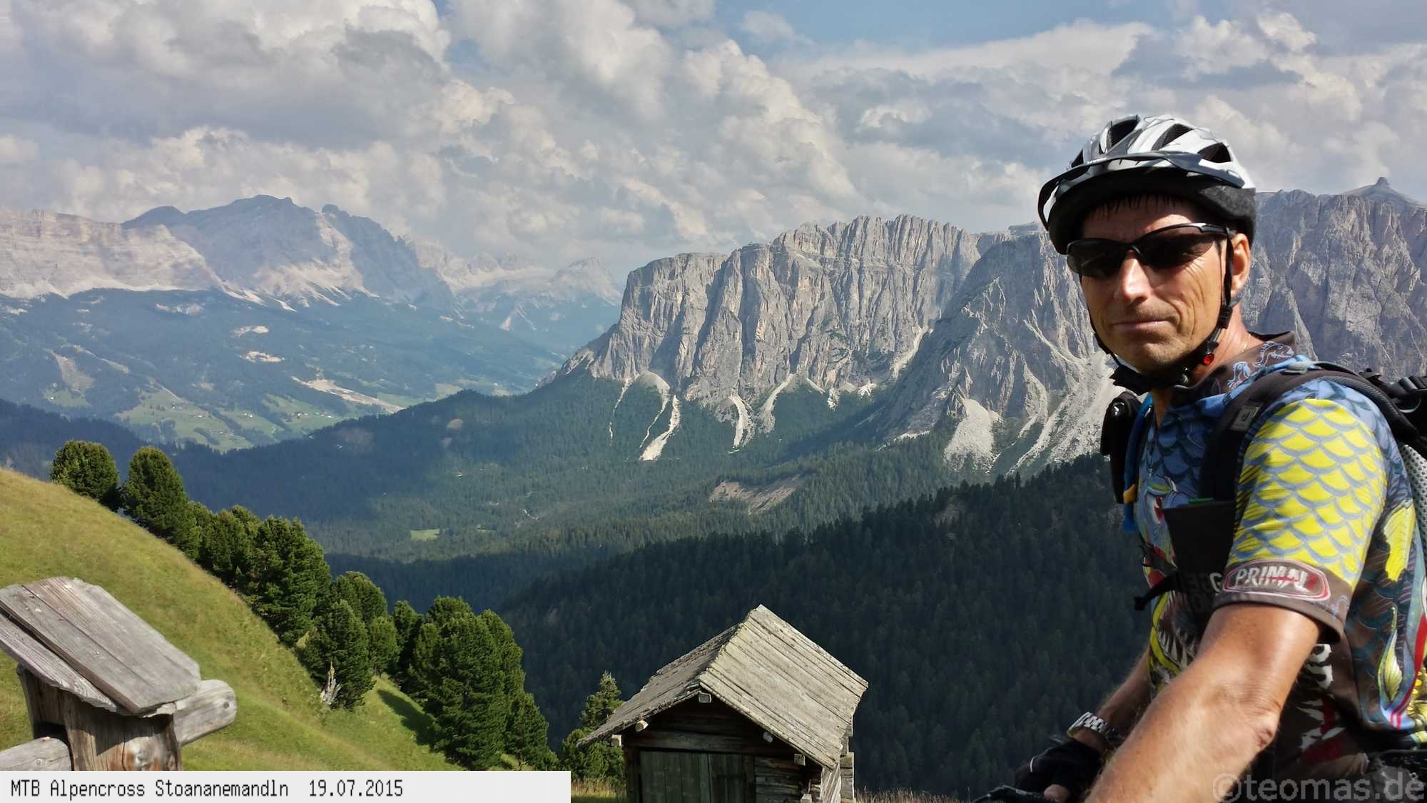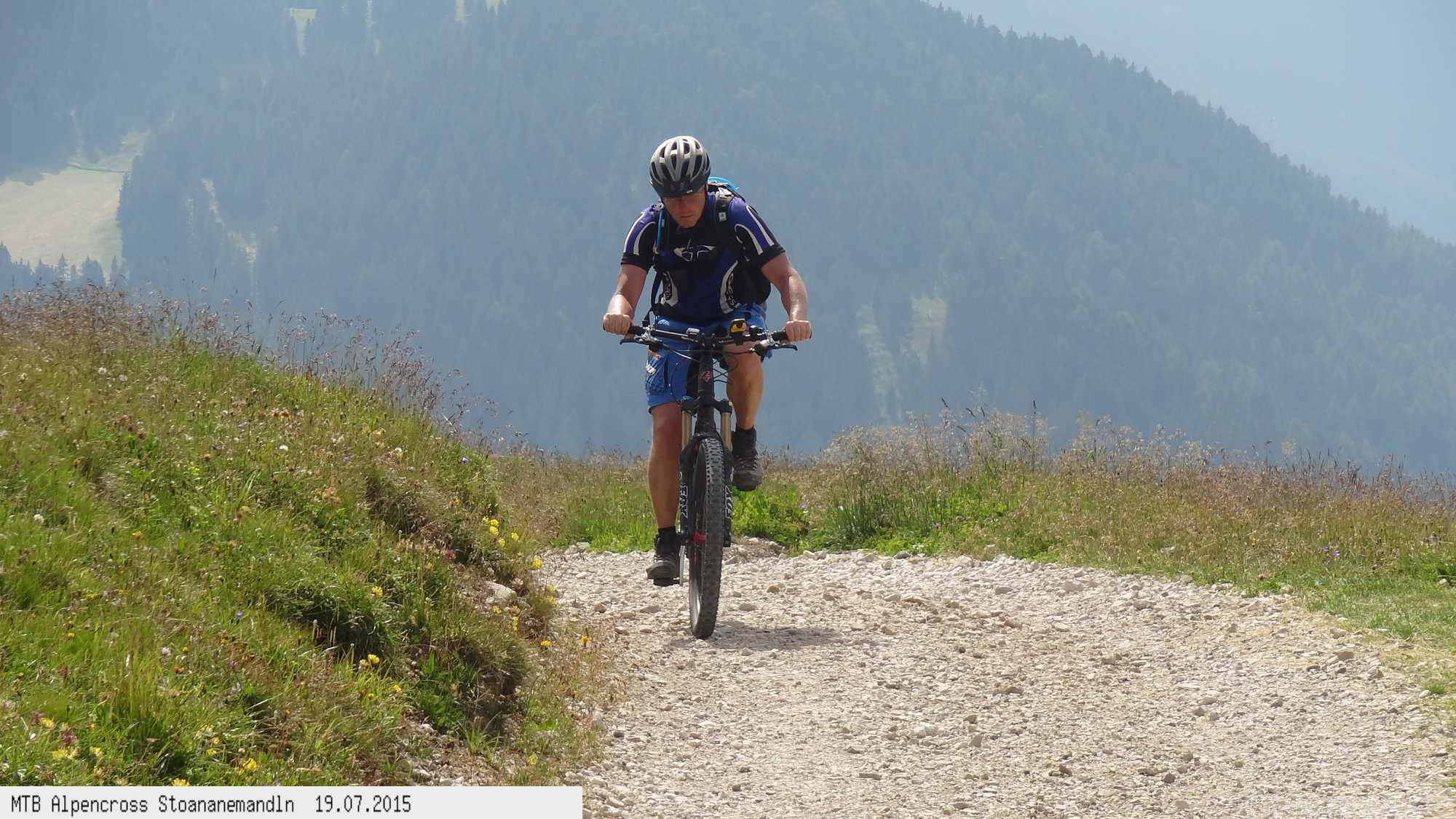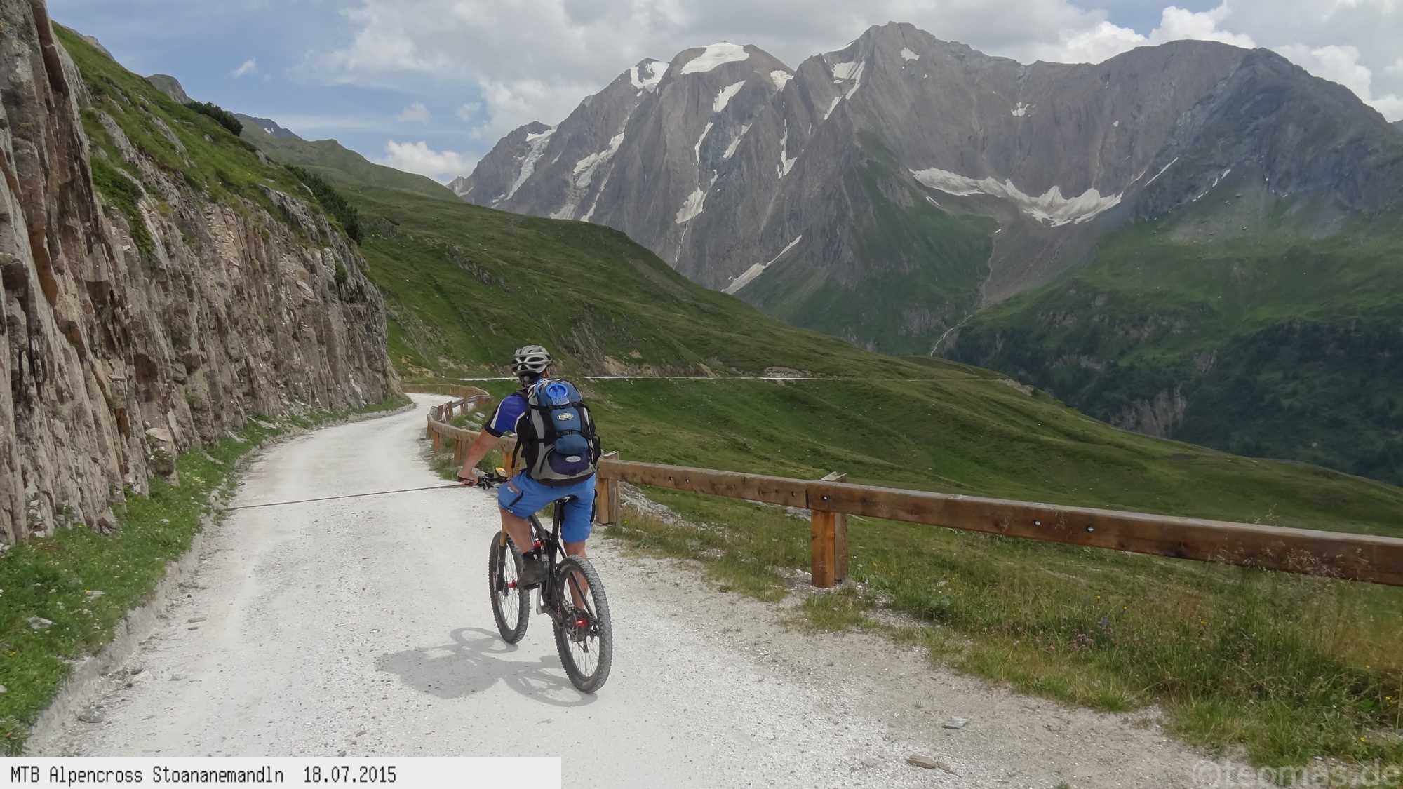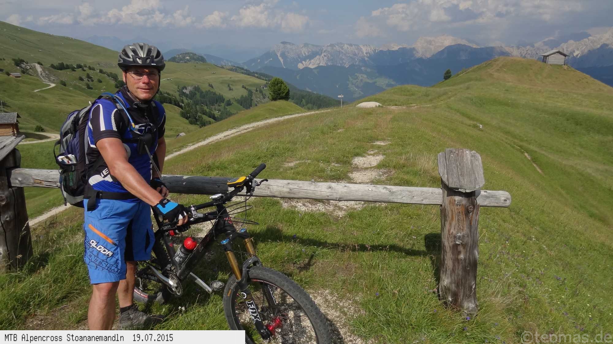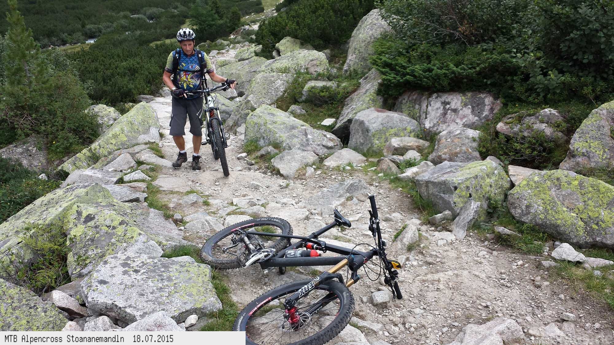 Die dem zweiten Trans-Alp Buch von Uli Stanciu entnommene Tour "Stoanane Mandln" haben wir von knapp 20.000 Hm auf ein für uns durchführbares Maß entschärft. 6 Fahrtage reichen uns völlig! Start in Kramsach am Inn, sämtliche Highlights wie das Pfitscher Joch und die Dolomiten wurden gefahren. Ziel in Eppan, die Schußetappen bis zum Gardasee haben wir ausgelassen. Am ersten Tag anspruchsvolle, steile Auffahrt zum Geiseljoch bei 41°C mit anschließender kalter Gewitter-Dusche bei 10°C hinunter nach Tux.