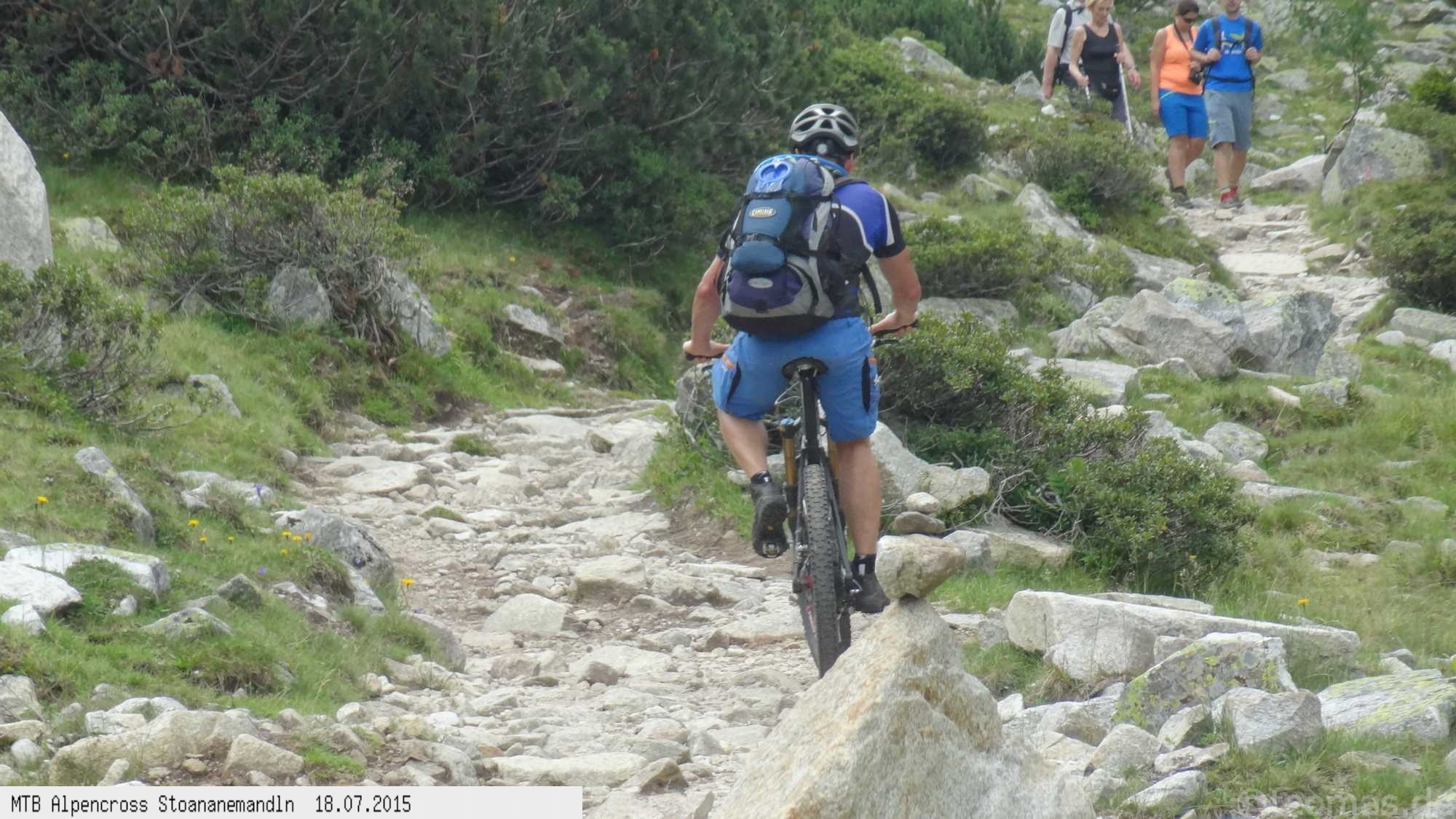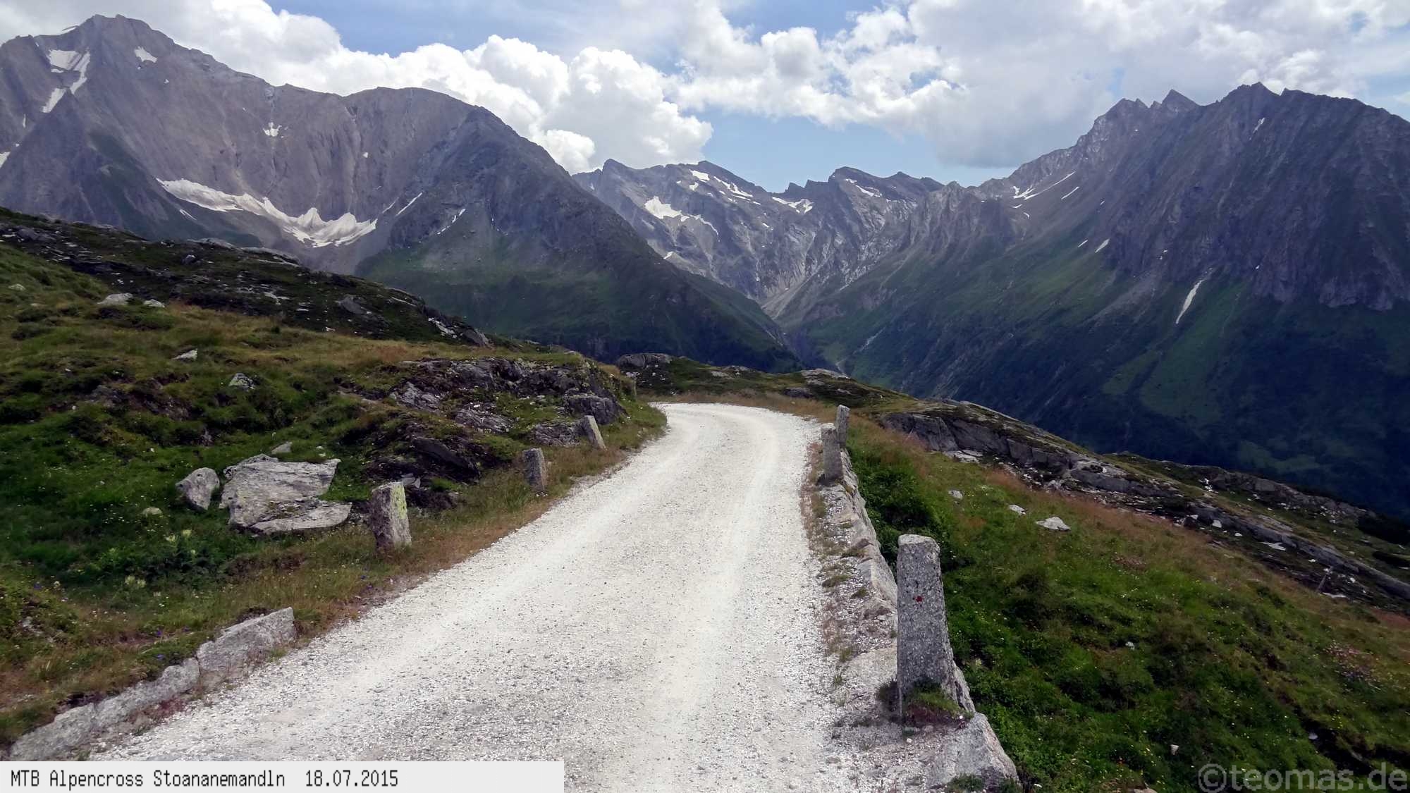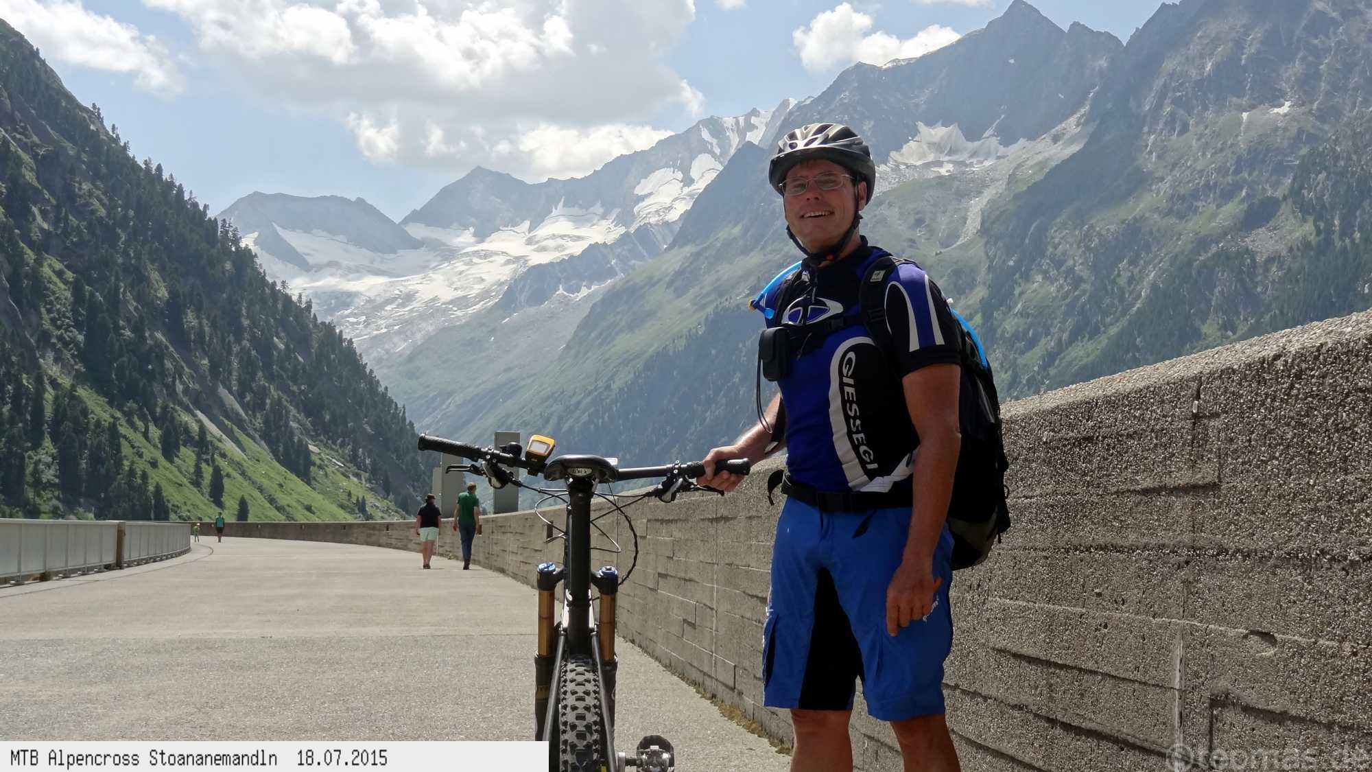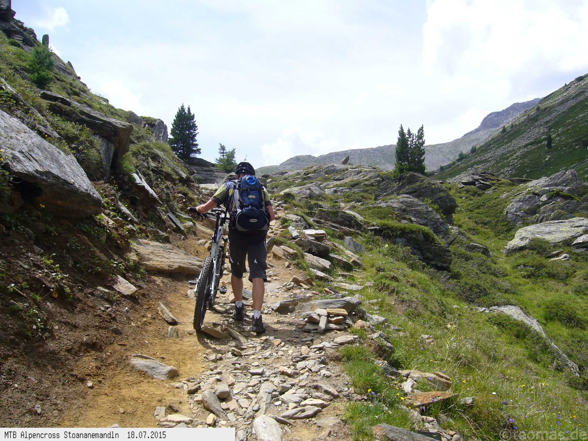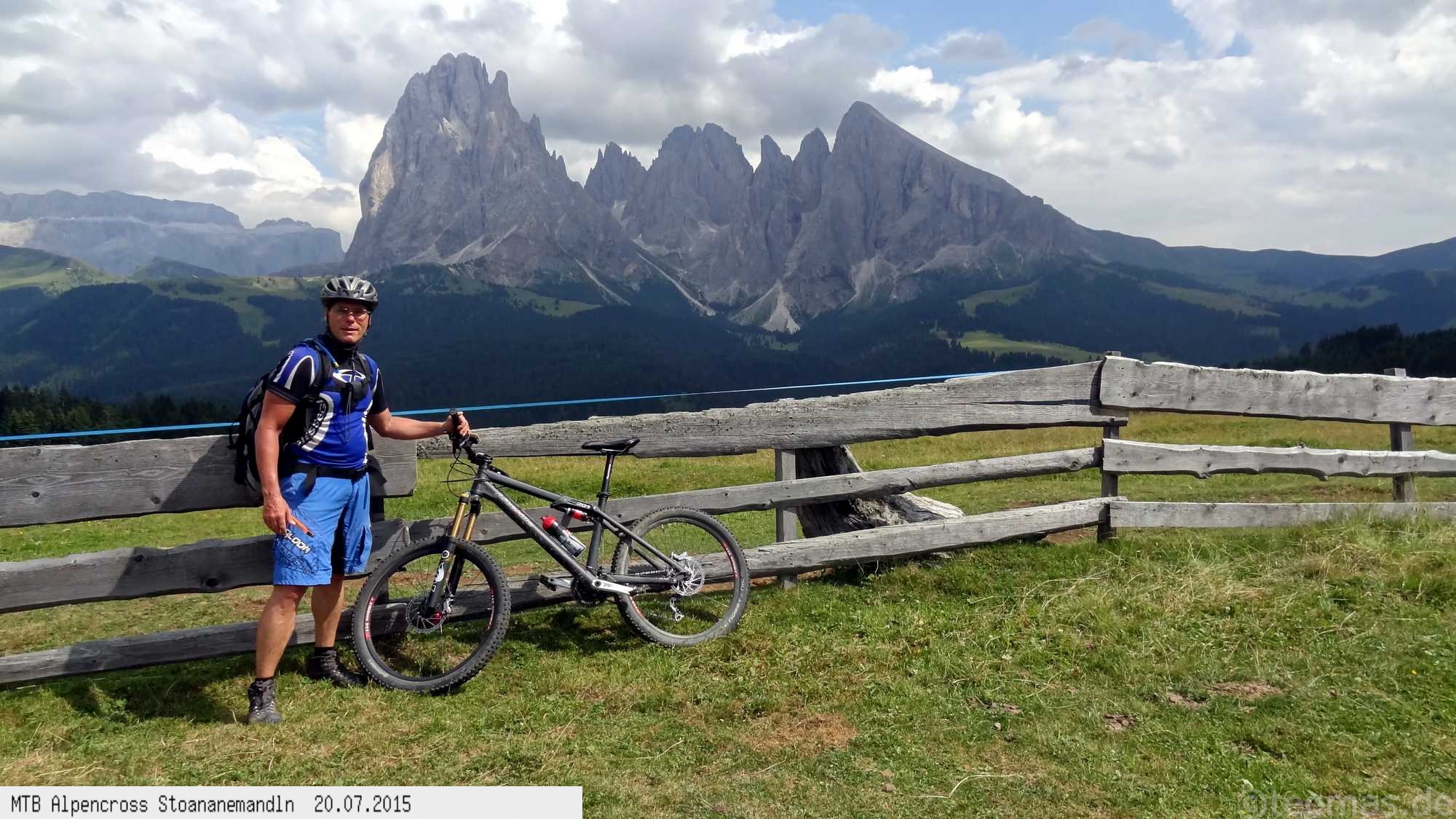 Die dem zweiten Trans-Alp Buch von Uli Stanciu entnommene Tour "Stoanane Mandln" haben wir von knapp 20.000 Hm auf ein für uns durchführbares Maß entschärft. 6 Fahrtage reichen uns völlig! Start in Kramsach am Inn, sämtliche Highlights wie das Pfitscher Joch und die Dolomiten wurden gefahren. Ziel in Eppan, die Schußetappen bis zum Gardasee haben wir ausgelassen. Am ersten Tag anspruchsvolle, steile Auffahrt zum Geiseljoch bei 41°C mit anschließender kalter Gewitter-Dusche bei 10°C hinunter nach Tux.