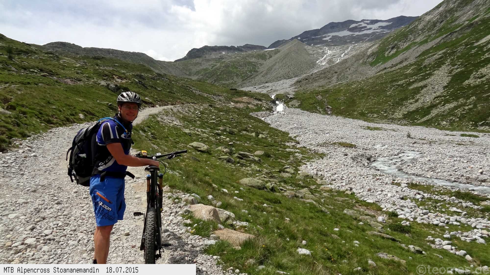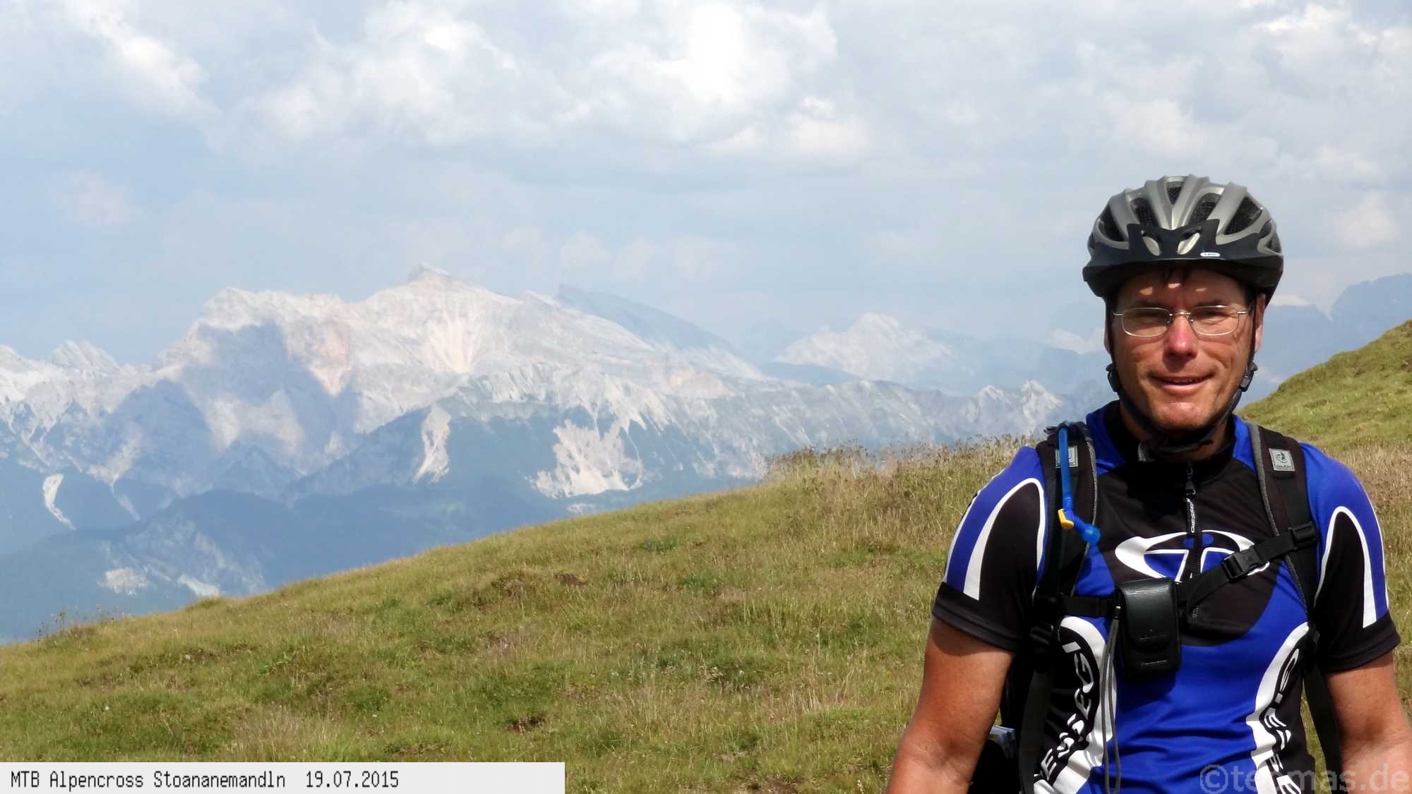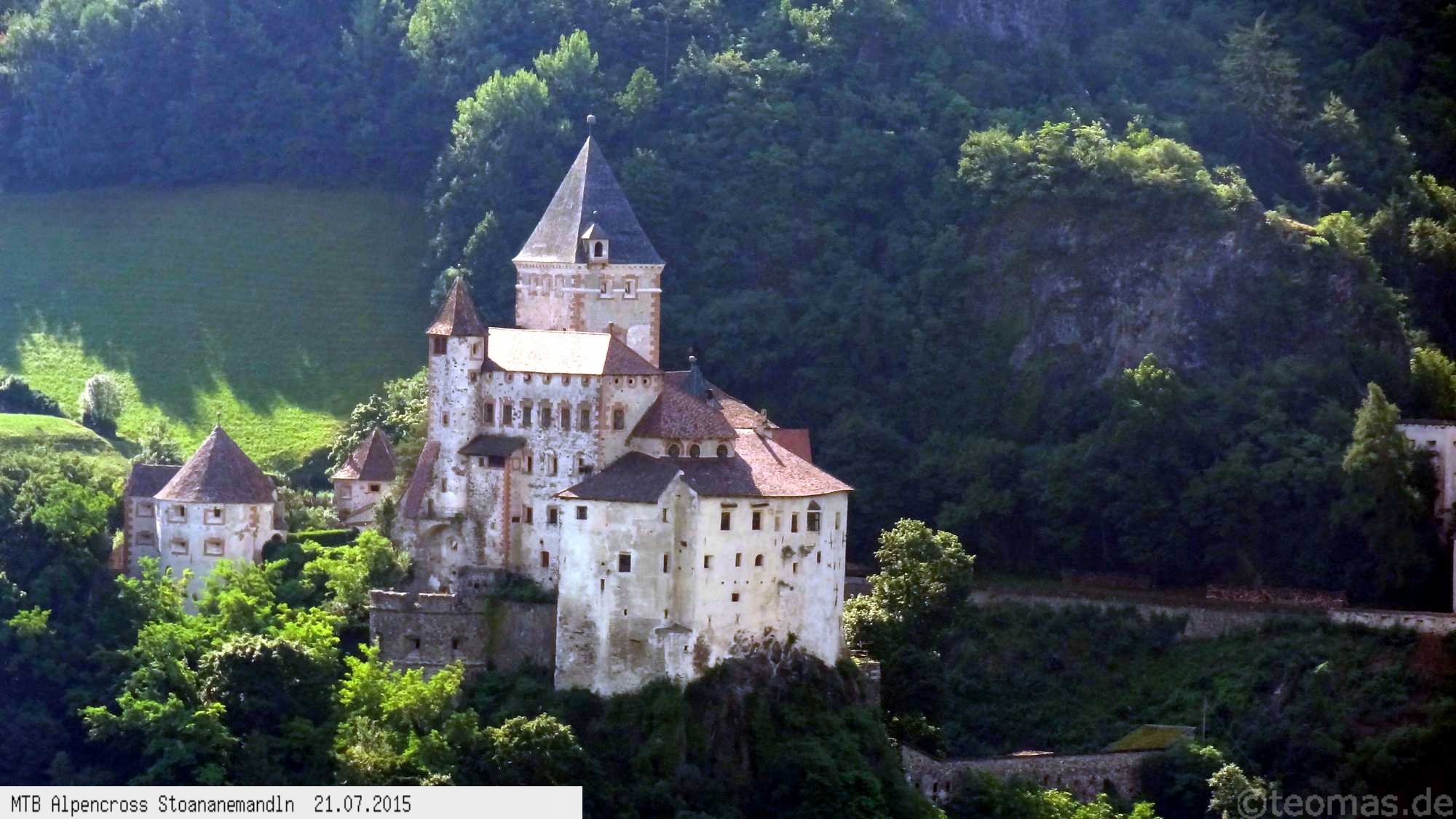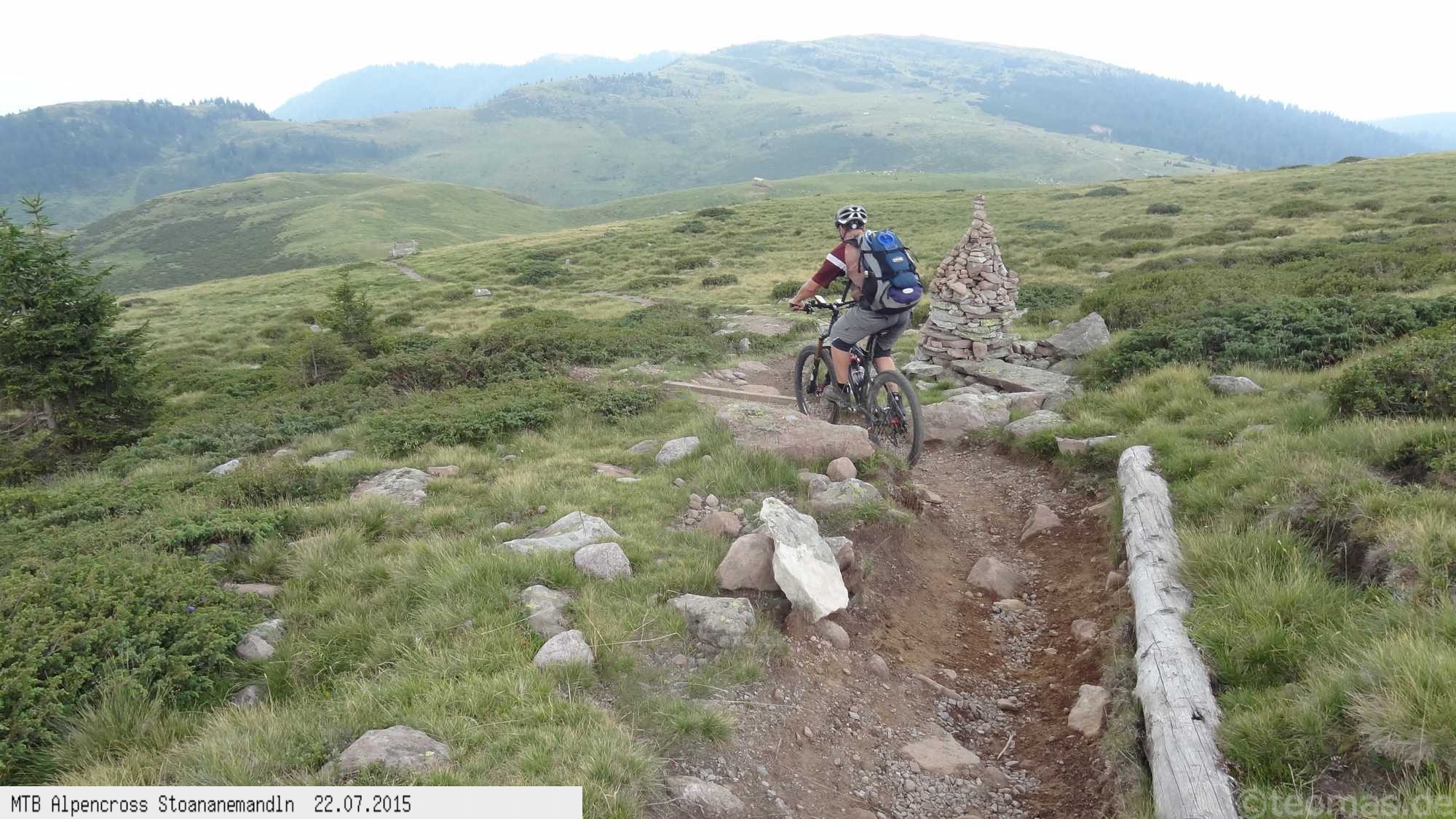 Die dem zweiten Trans-Alp Buch von Uli Stanciu entnommene Tour "Stoanane Mandln" haben wir von knapp 20.000 Hm auf ein für uns durchführbares Maß entschärft. 6 Fahrtage reichen uns völlig! Start in Kramsach am Inn, sämtliche Highlights wie das Pfitscher Joch und die Dolomiten wurden gefahren. Ziel in Eppan, die Schußetappen bis zum Gardasee haben wir ausgelassen. Am ersten Tag anspruchsvolle, steile Auffahrt zum Geiseljoch bei 41°C mit anschließender kalter Gewitter-Dusche bei 10°C hinunter nach Tux.