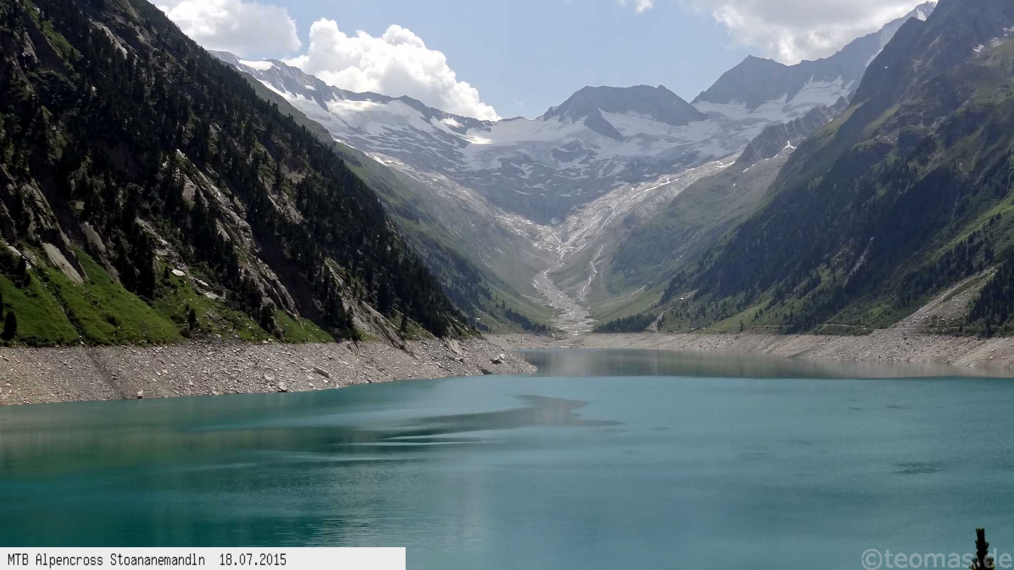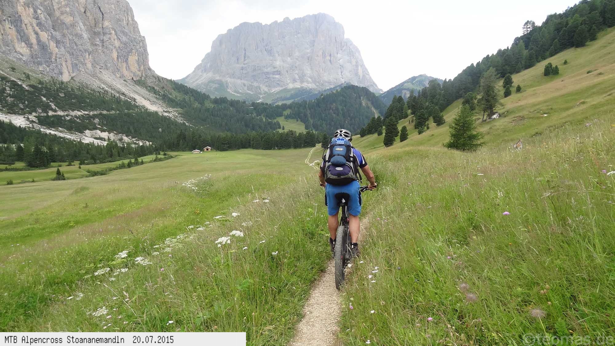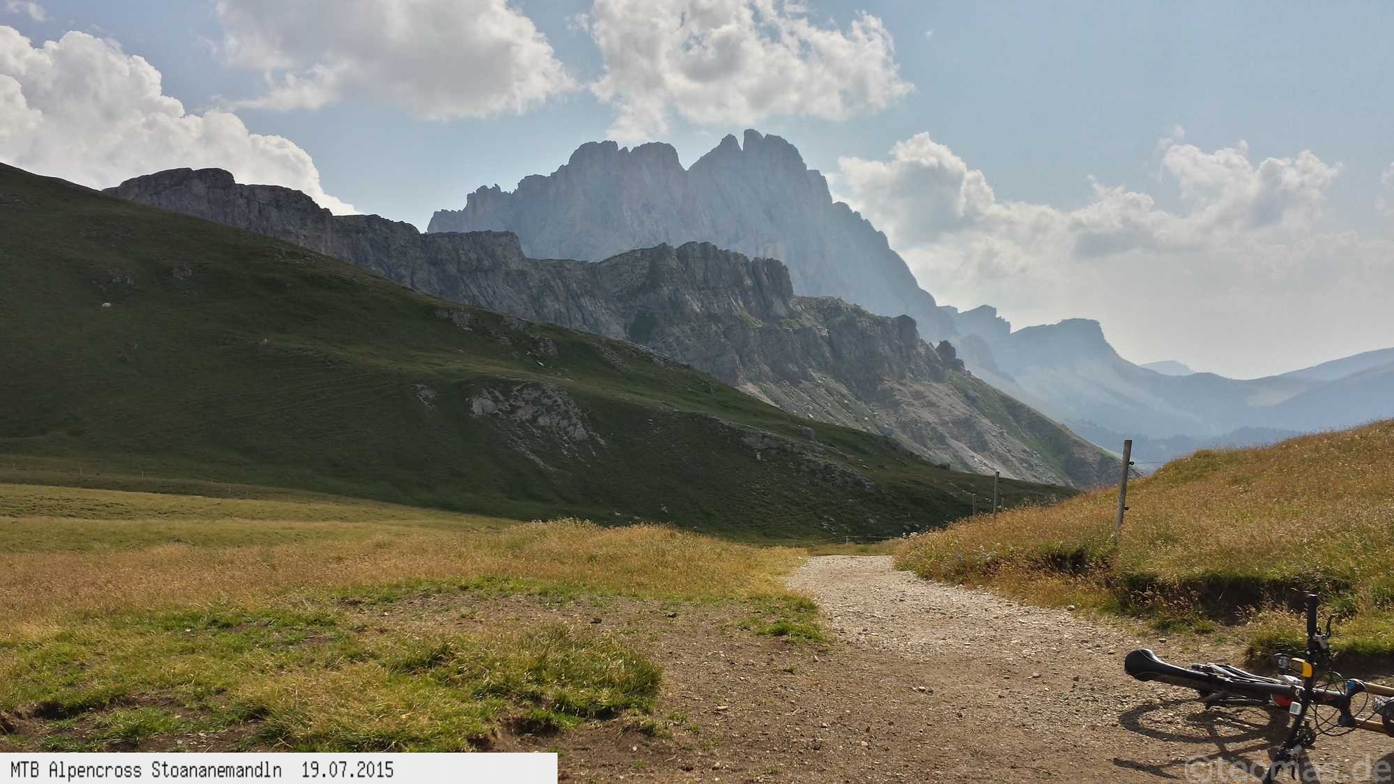 Am nächsten Tag bei Traumkulisse vorbei am Schlegeisspeicher über das Pfitscher Joch. Von Sterzing bis Brixen im Eissacktal größtenteils auf einem schmalen Trail entlang der Bahnlinie. Harter dritter Tag mit steiler Auffahrt ab Brixen, unterwegs Stechmücken so groß wie Wespen. Hinauf zur Schlüterhütte nicht minder anstrengend! Mangels Übernachtungsmöglichkeit in Campill noch einen Berg bis Abtei Badia überwunden.