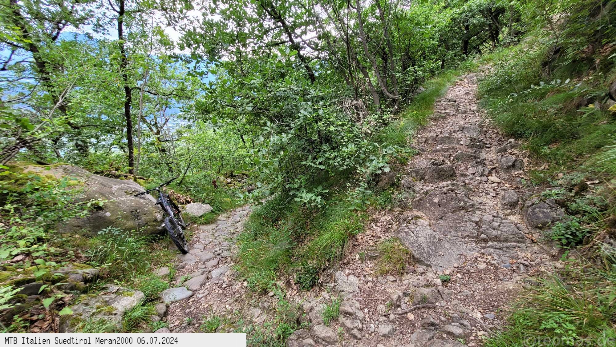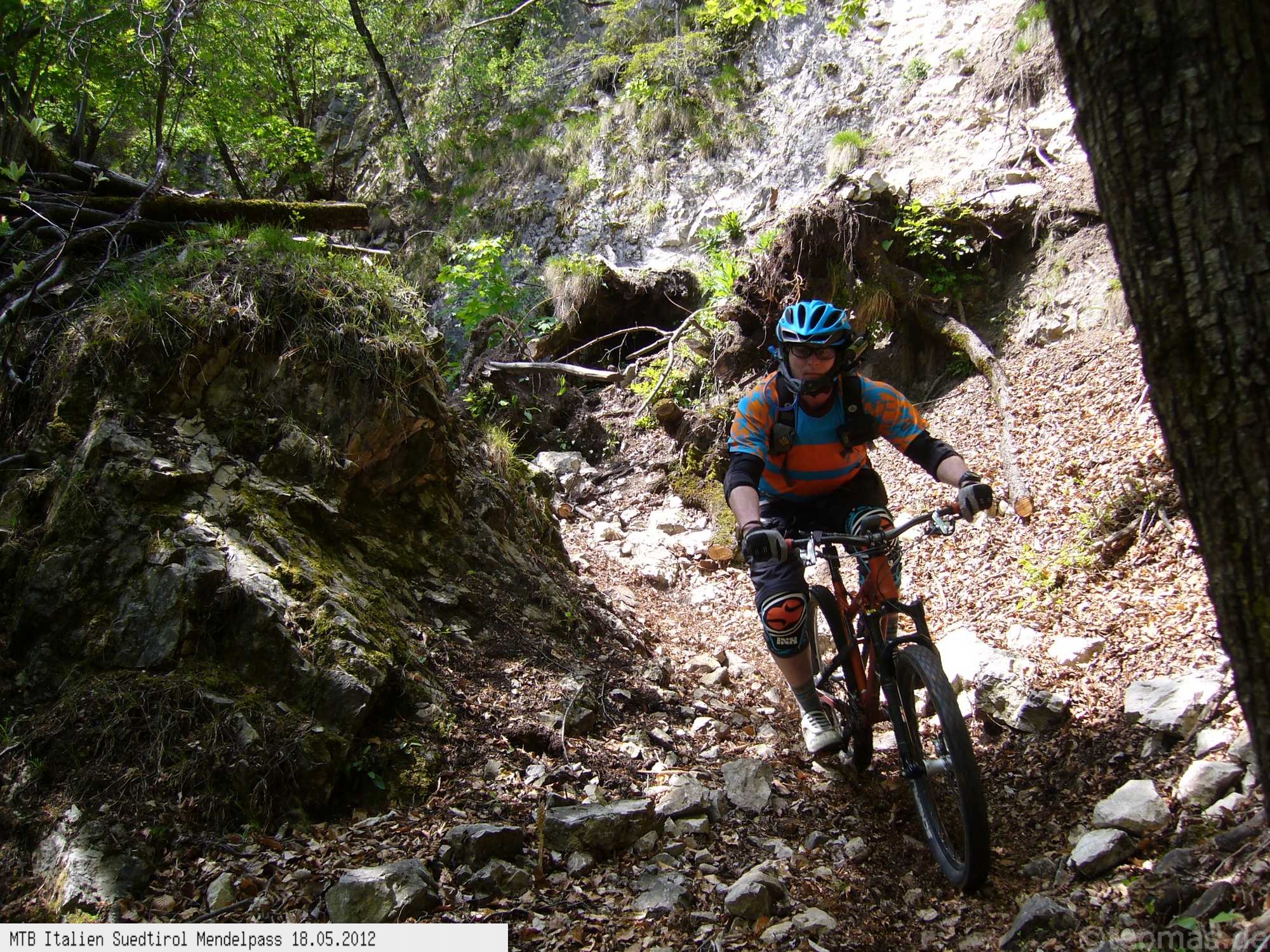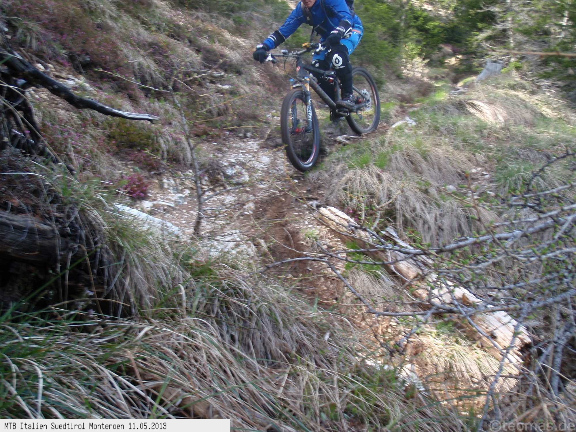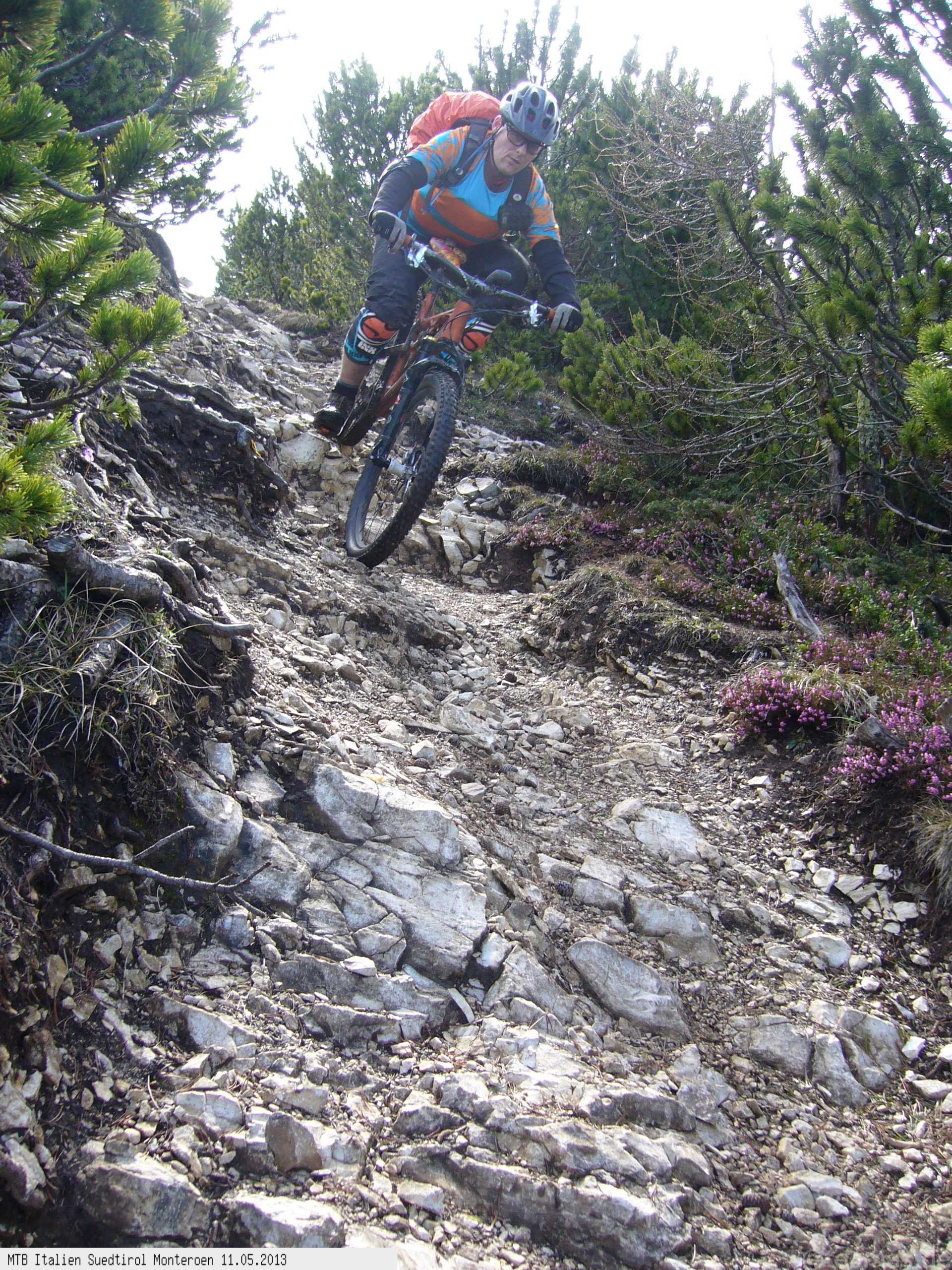 Technisch flowiger Trail, ab der Paß Querung im Wald mit anspruchsvollerem verblocktem Trails bis zur Straße nach Terlan.