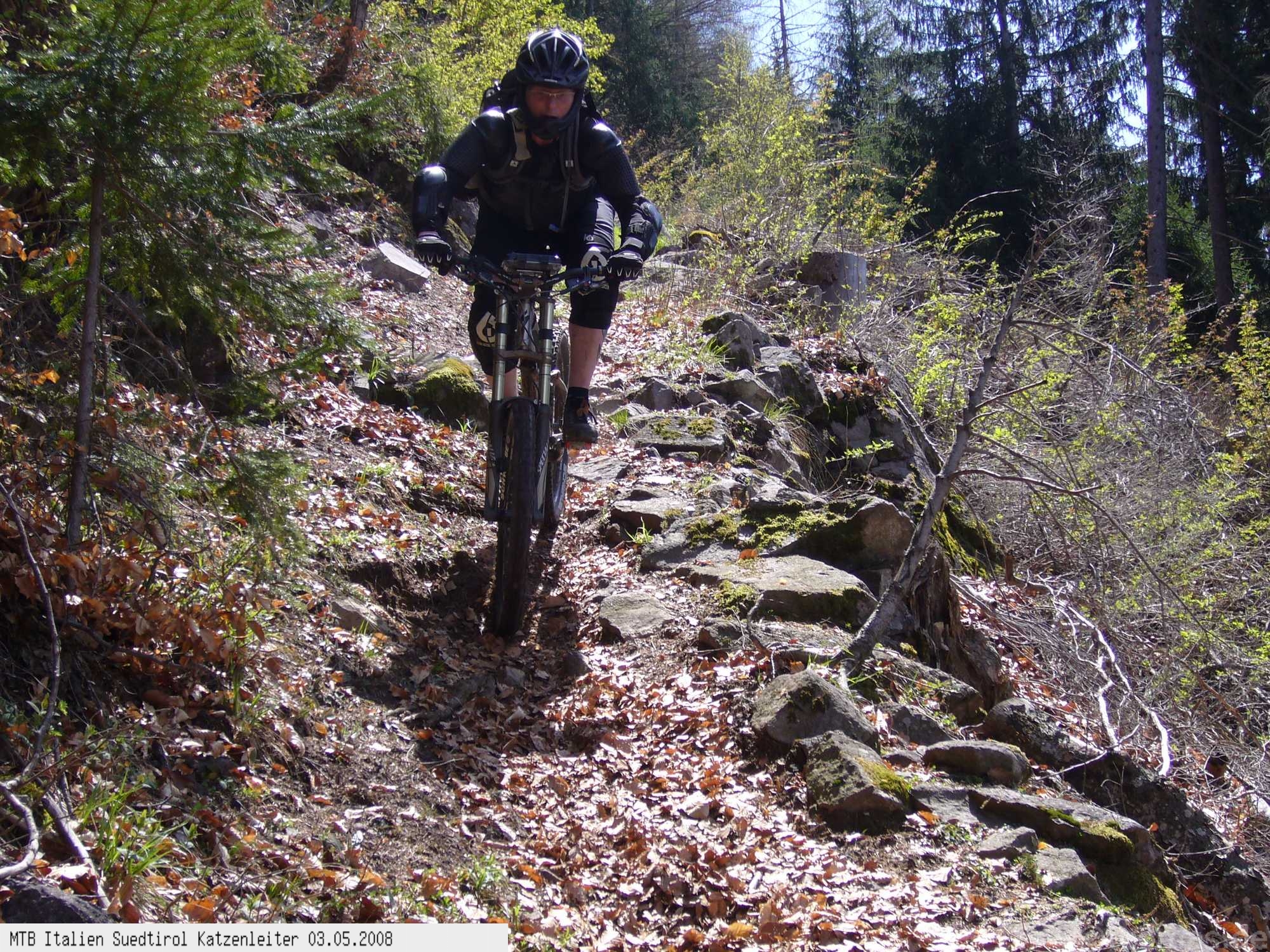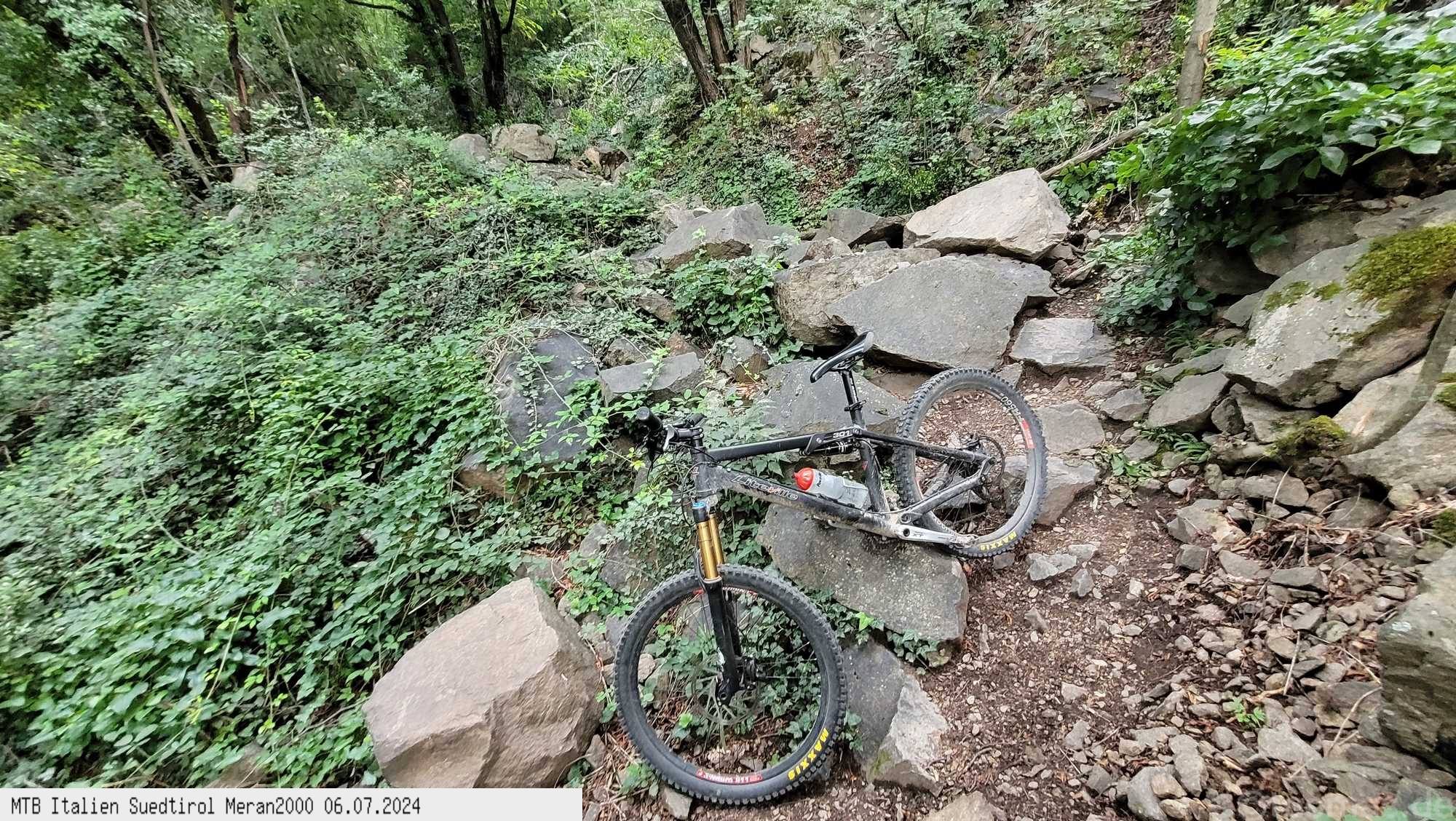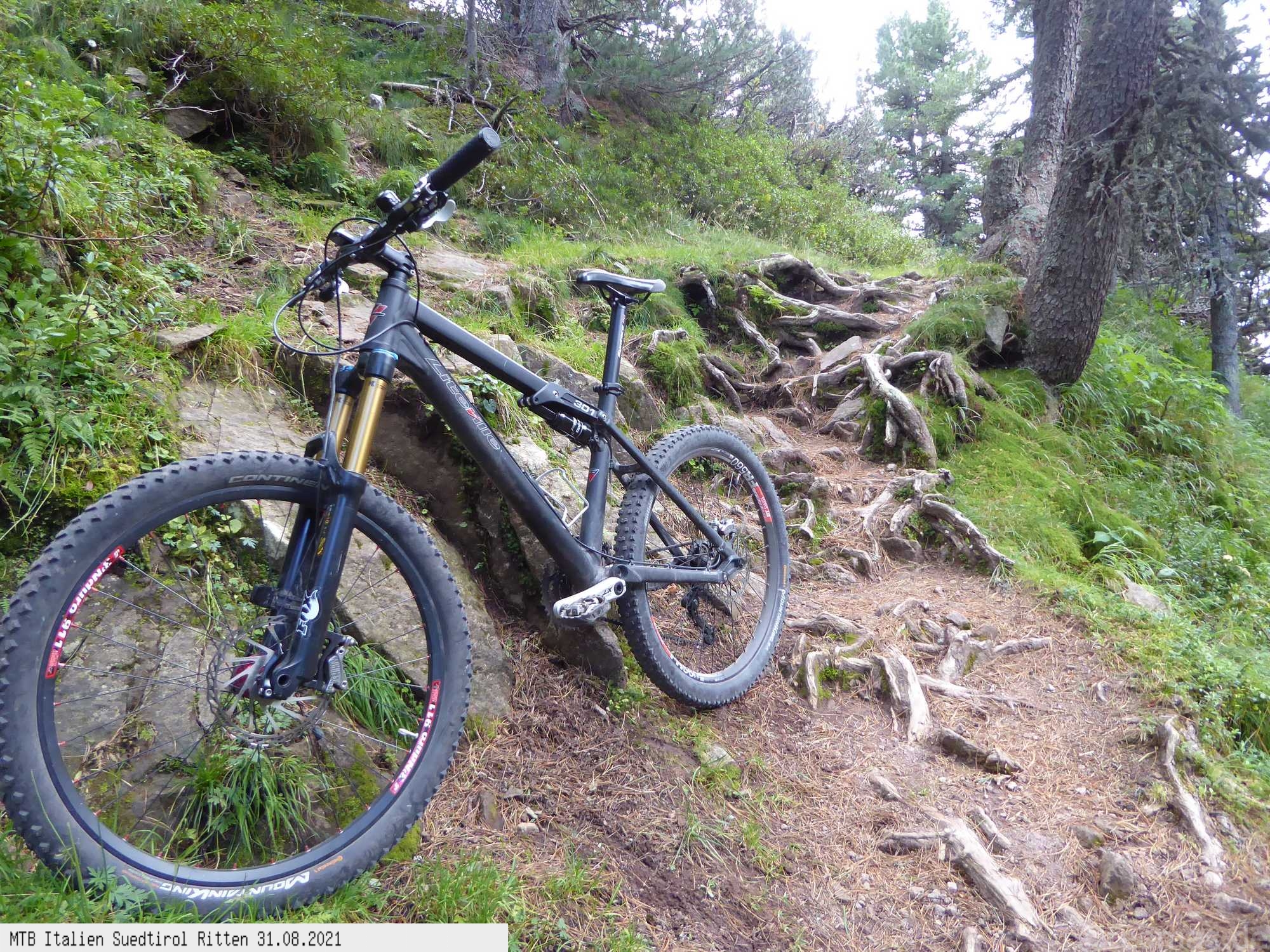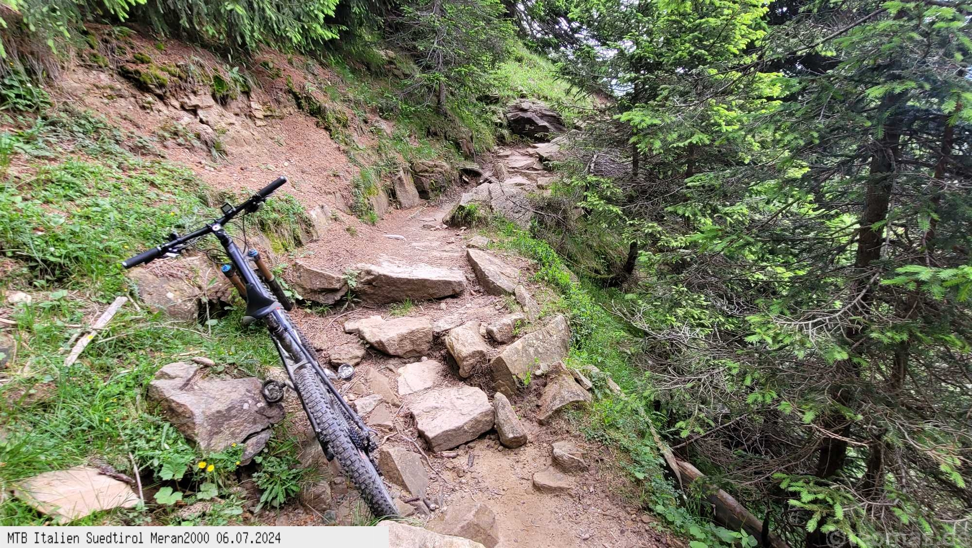 Technisch flowiger Trail, ab der Paß Querung im Wald mit anspruchsvollerem verblocktem Trails bis zur Straße nach Terlan.