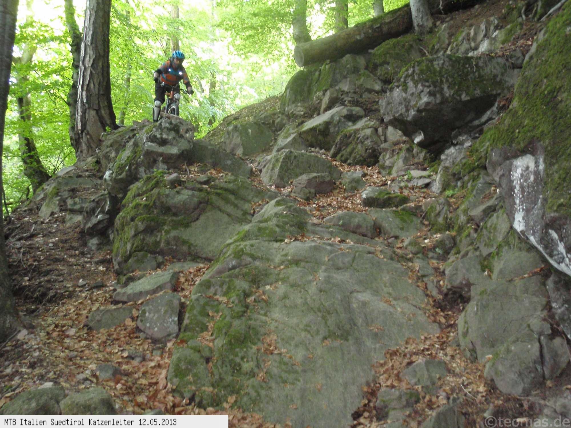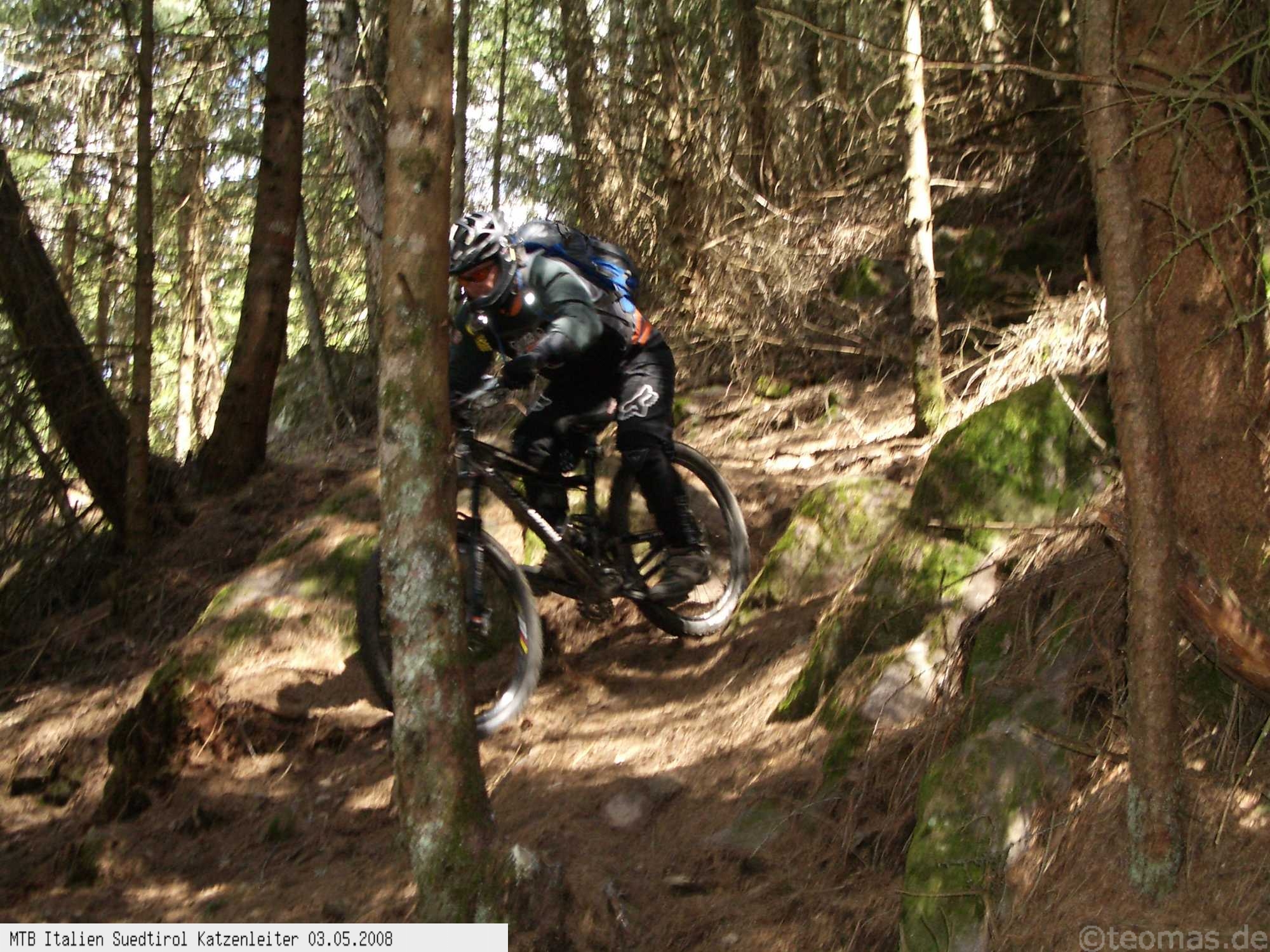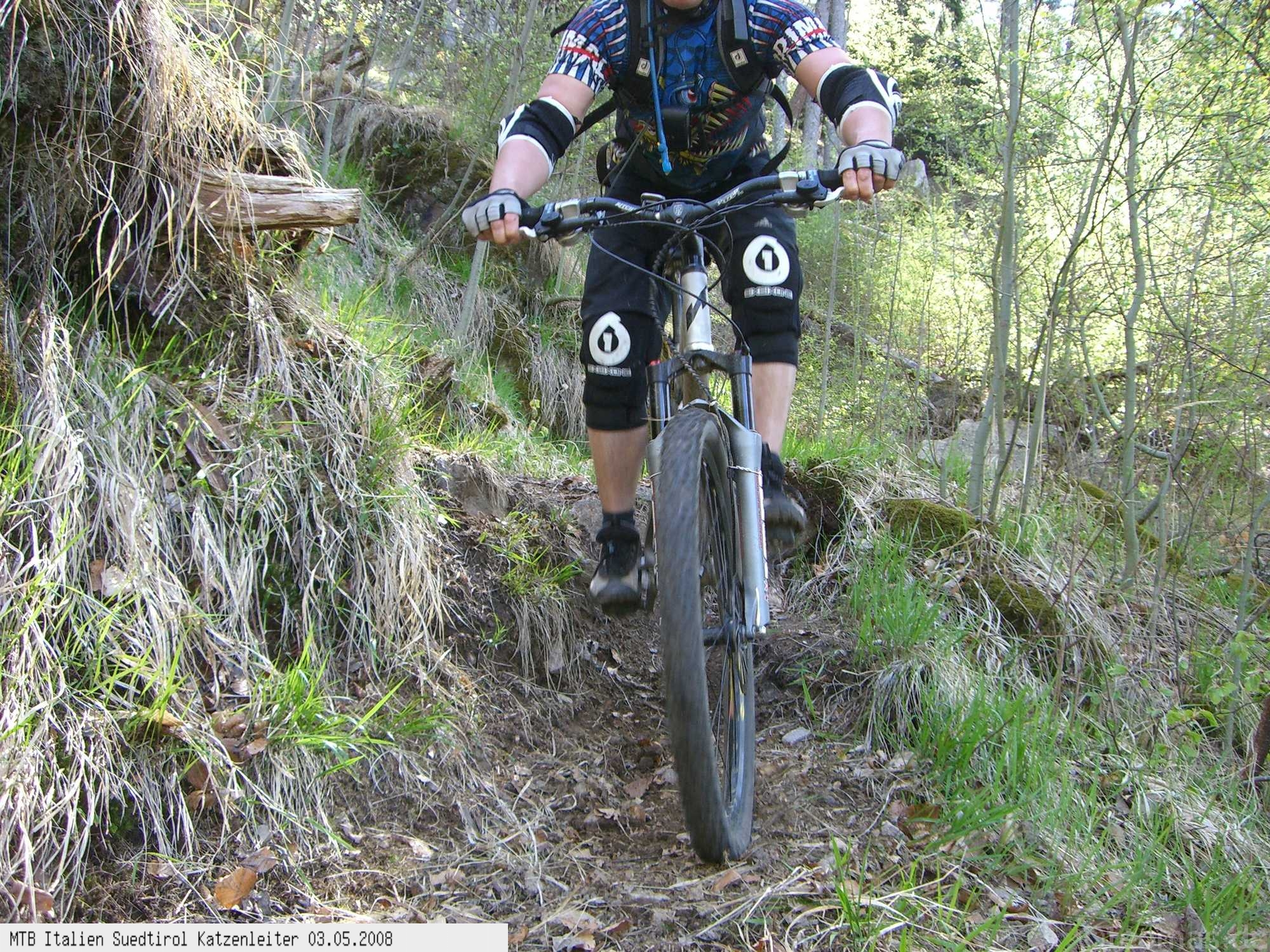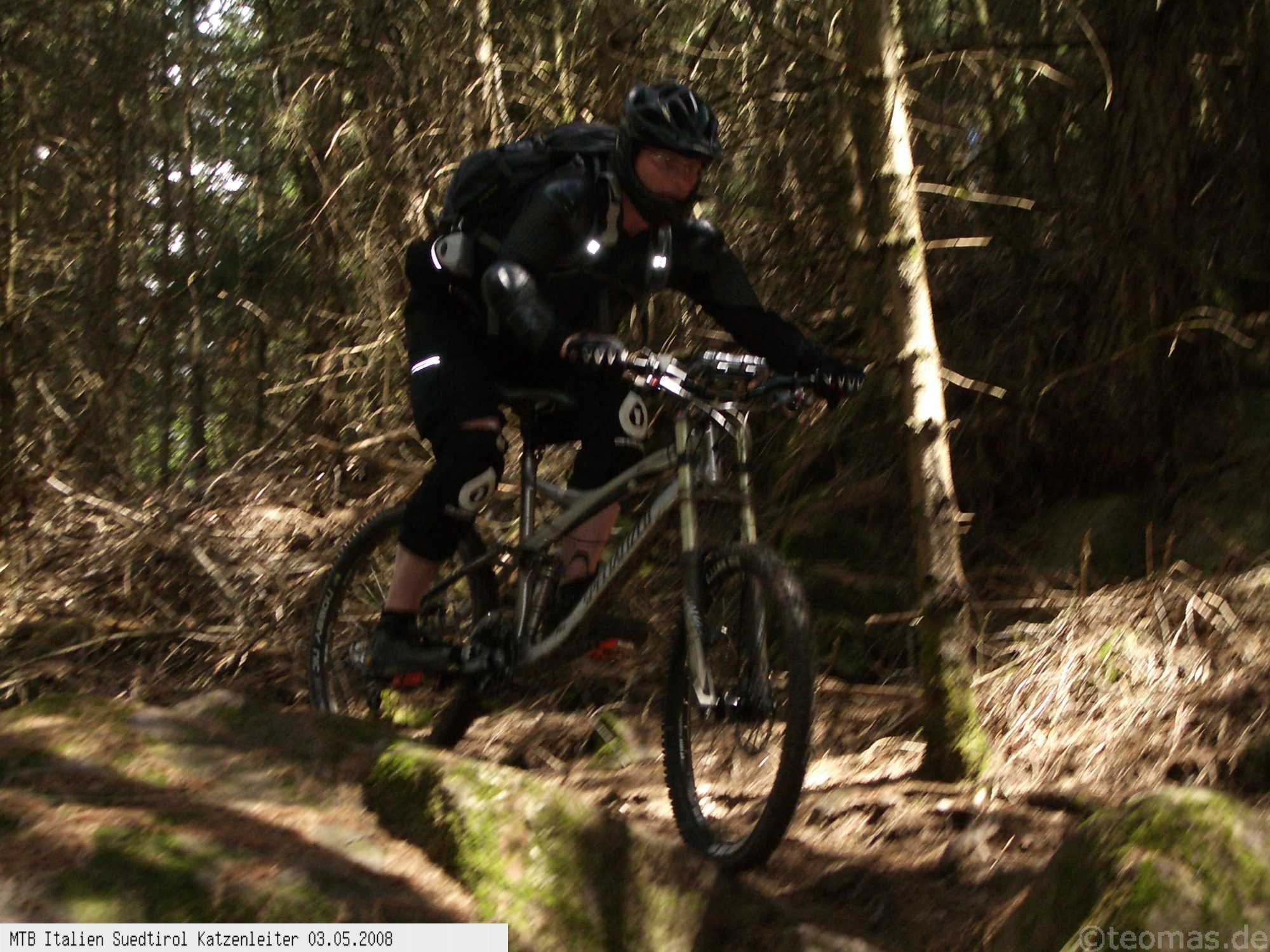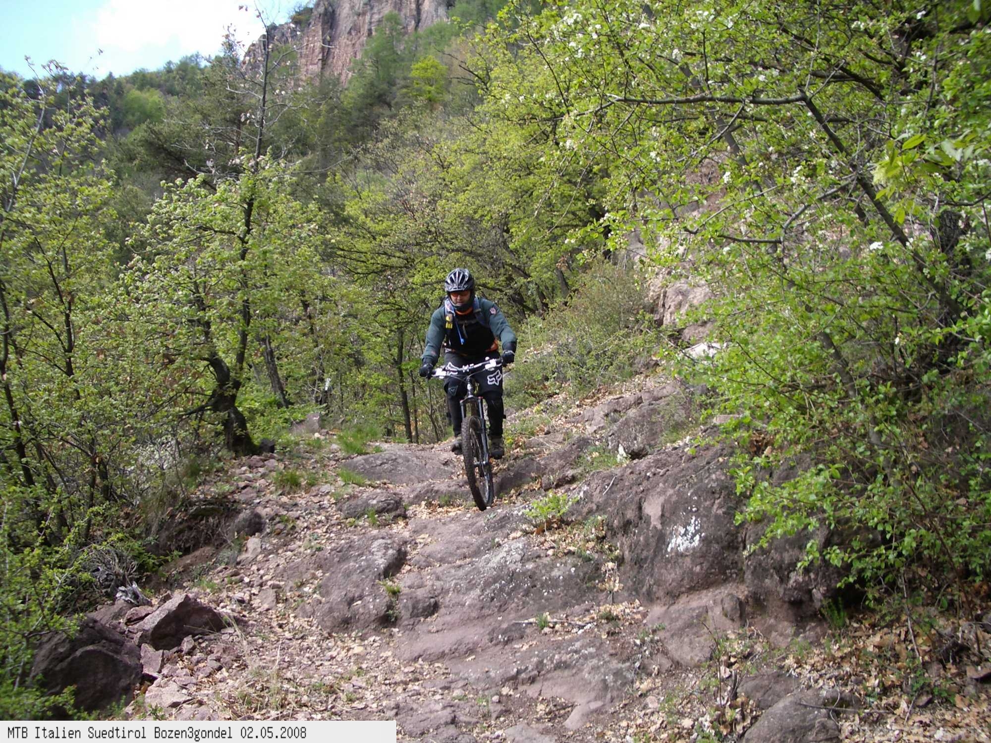 Technisch flowiger Trail, ab der Paß Querung im Wald mit anspruchsvollerem verblocktem Trails bis zur Straße nach Terlan.