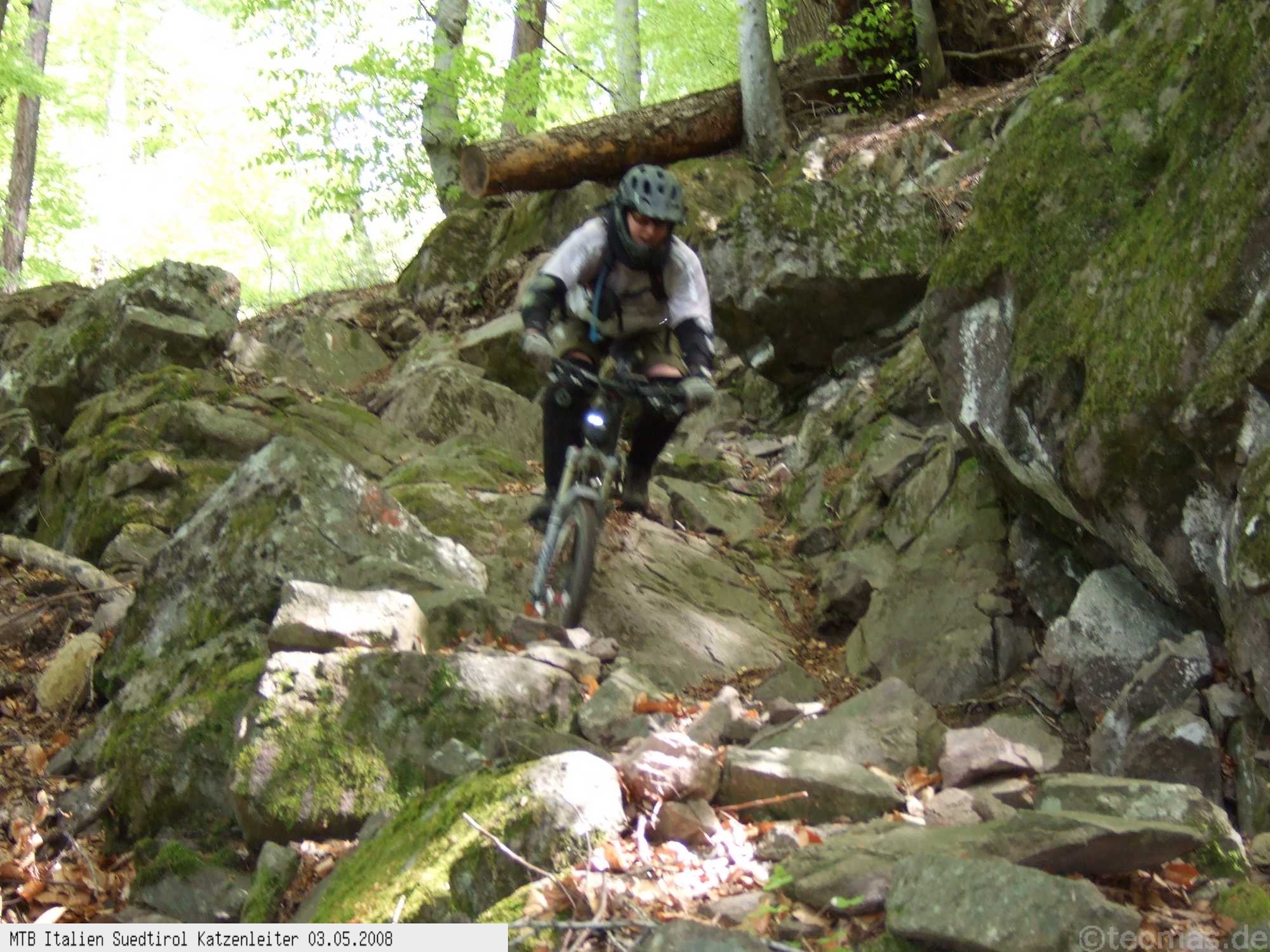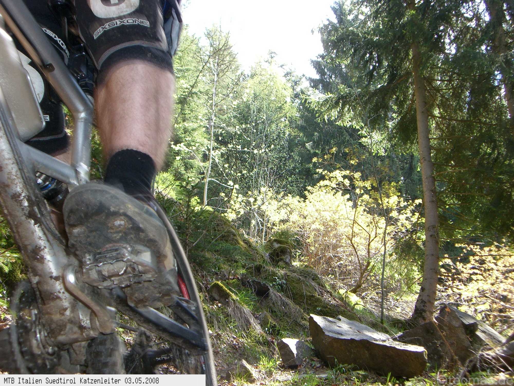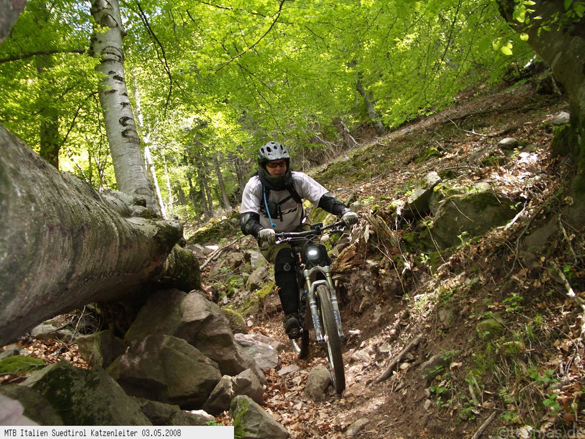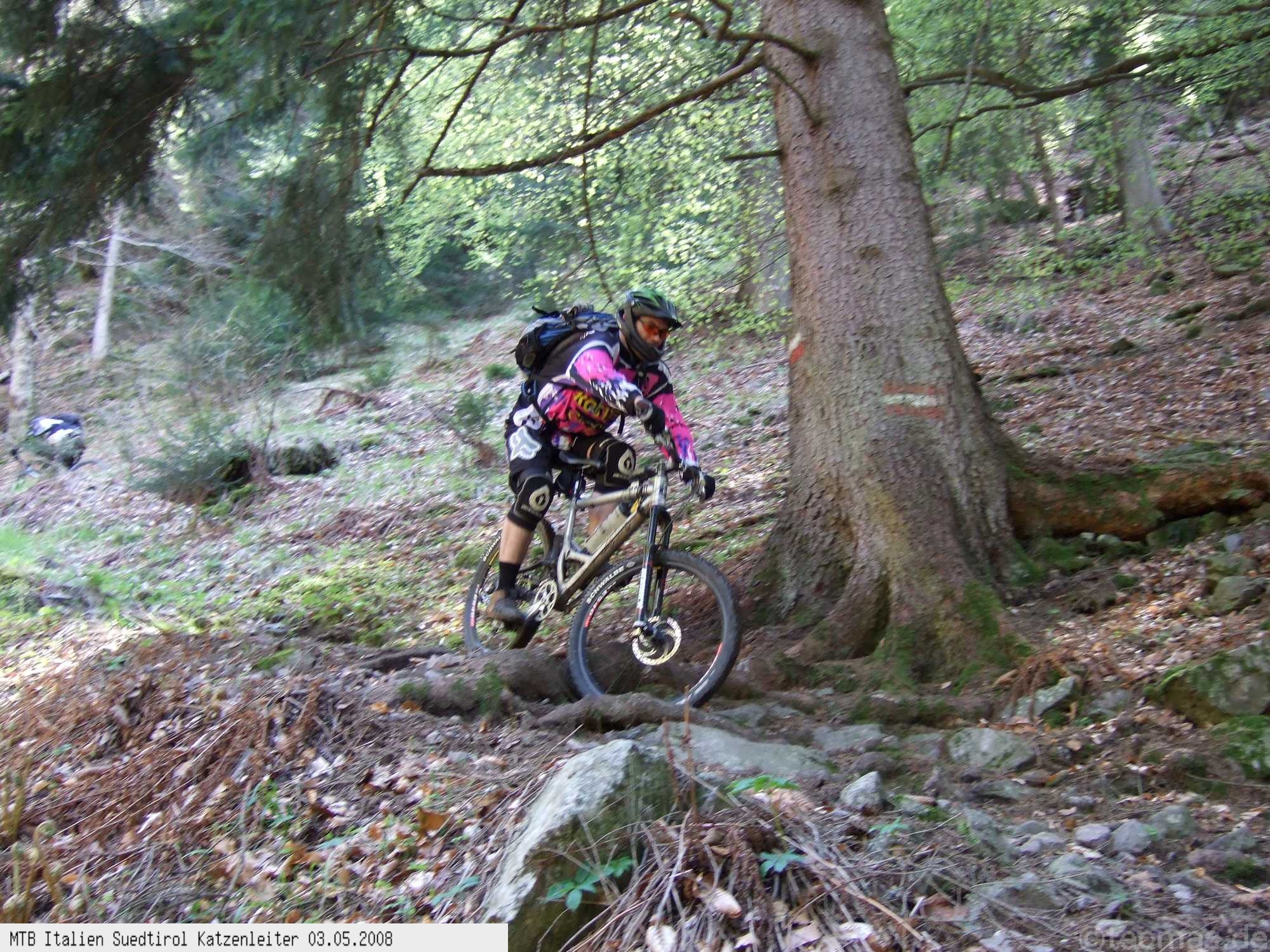 Technisch flowiger Trail, ab der Paß Querung im Wald mit anspruchsvollerem verblocktem Trails bis zur Straße nach Terlan.