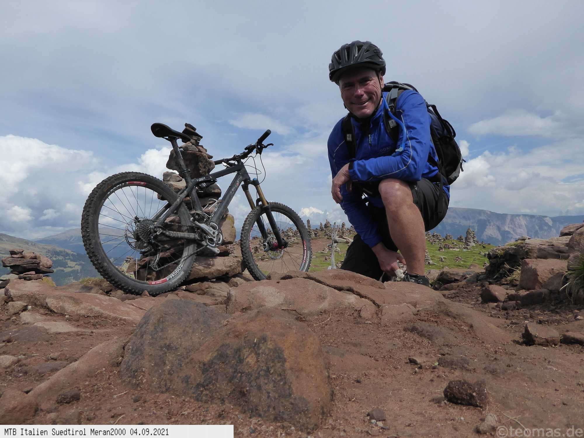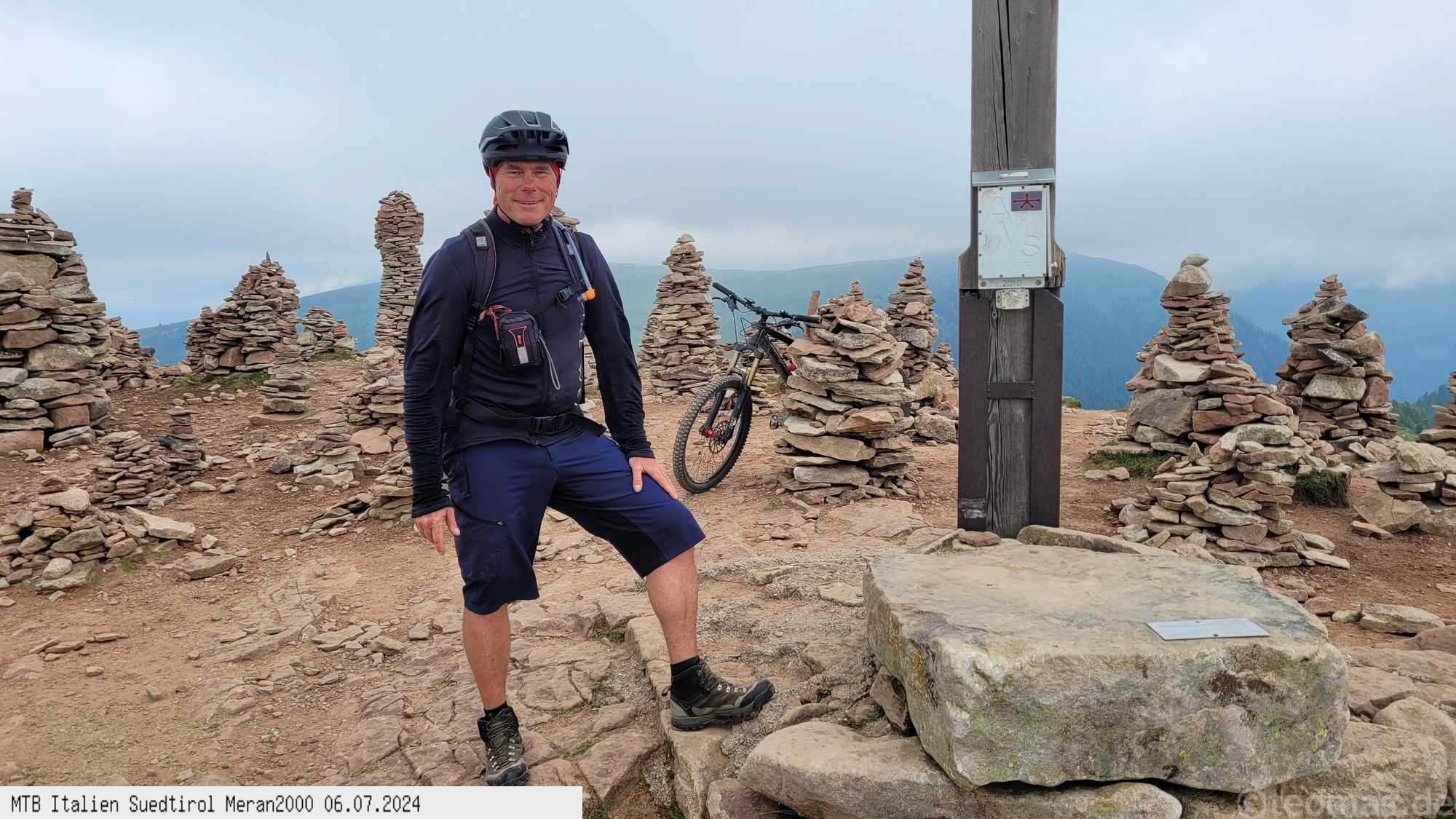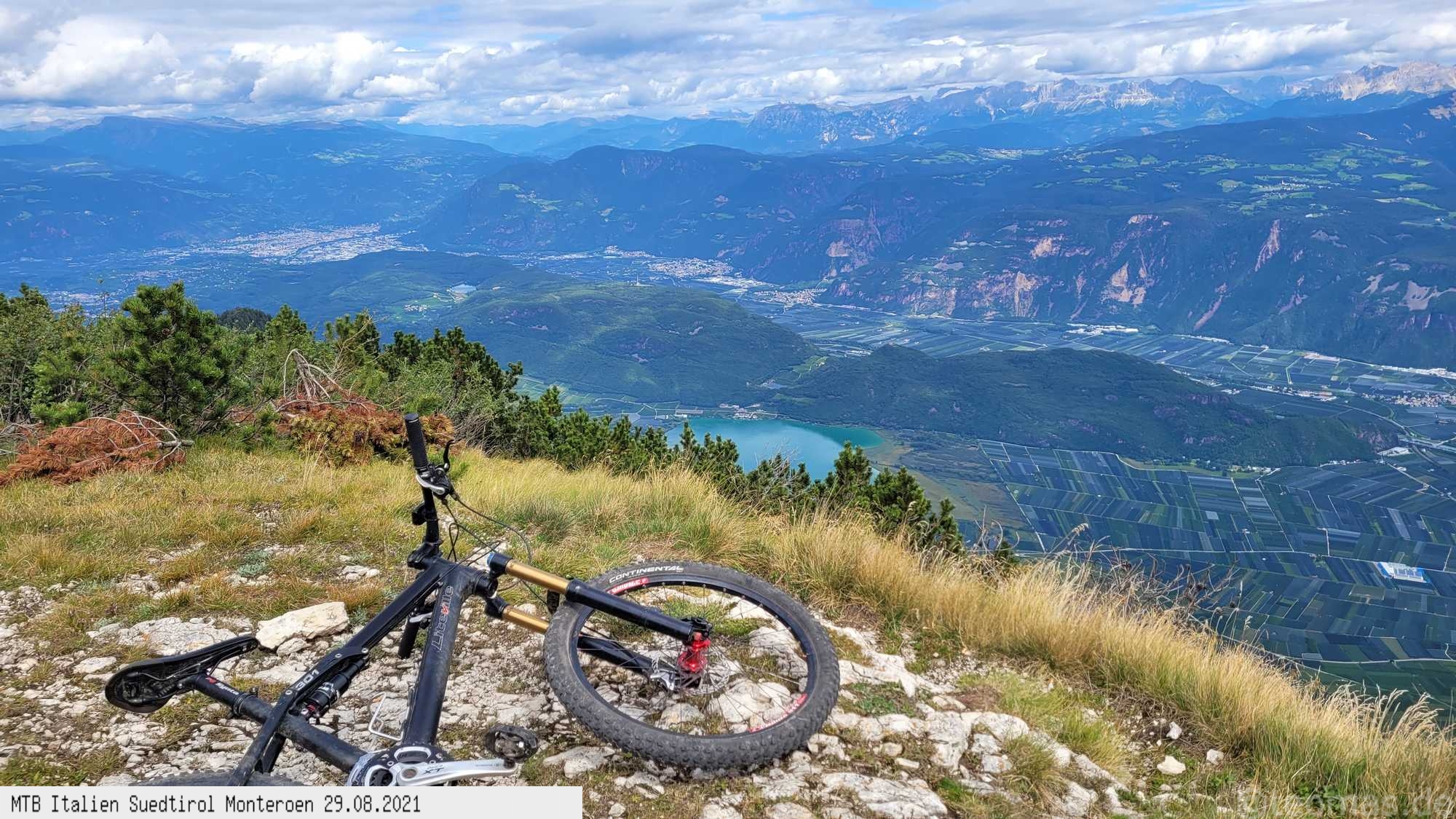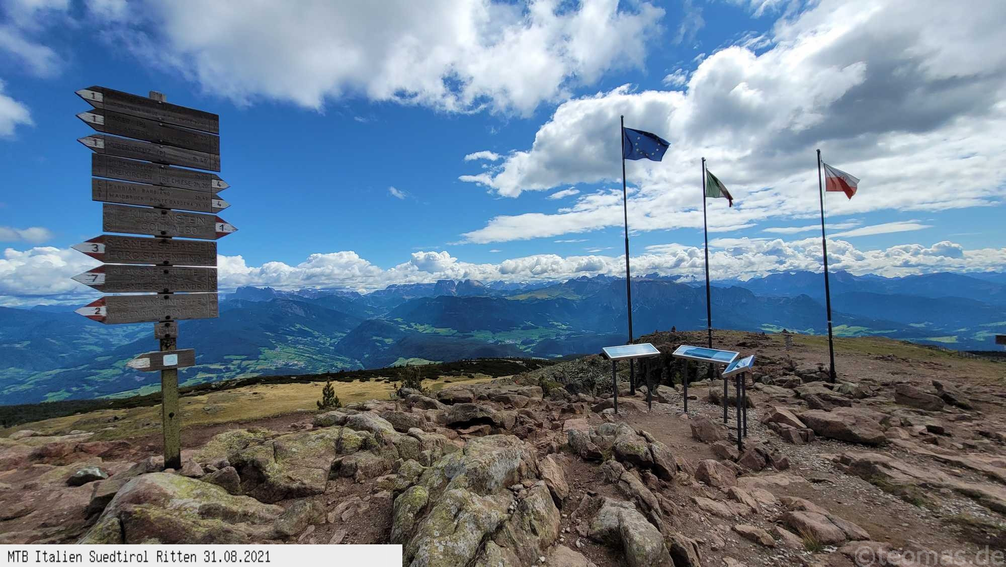 neben dem Höhenangaben Hinweisschild. Alternativ die ebenfalls schwere MTB Trail Tour vom Penegal zum Mendelpass und hinunter nach Kaltern fehren.
