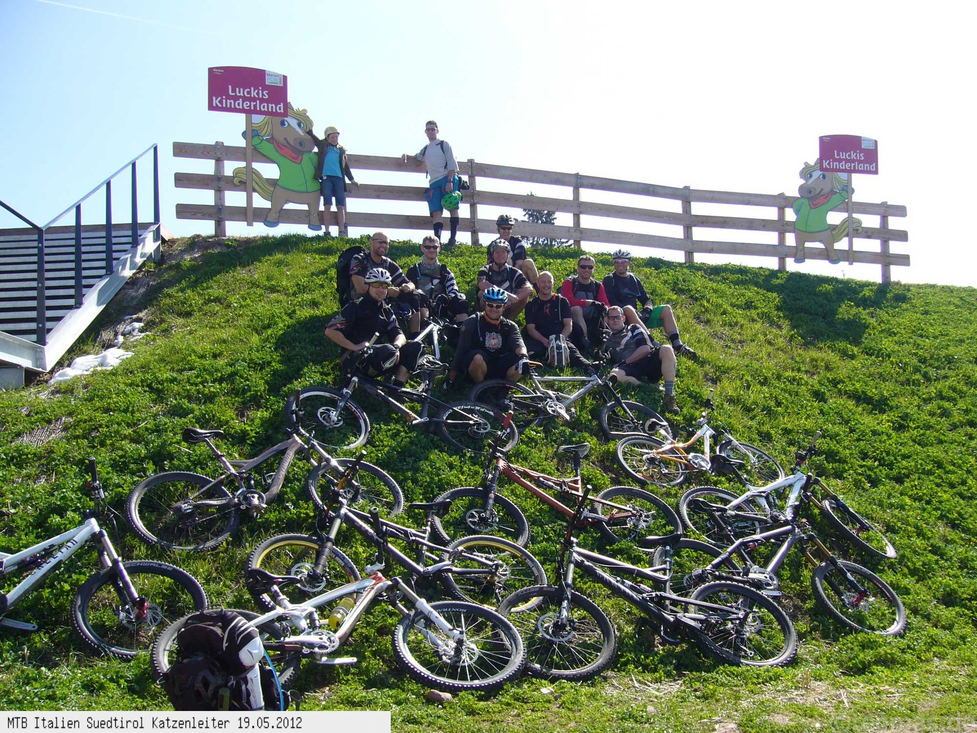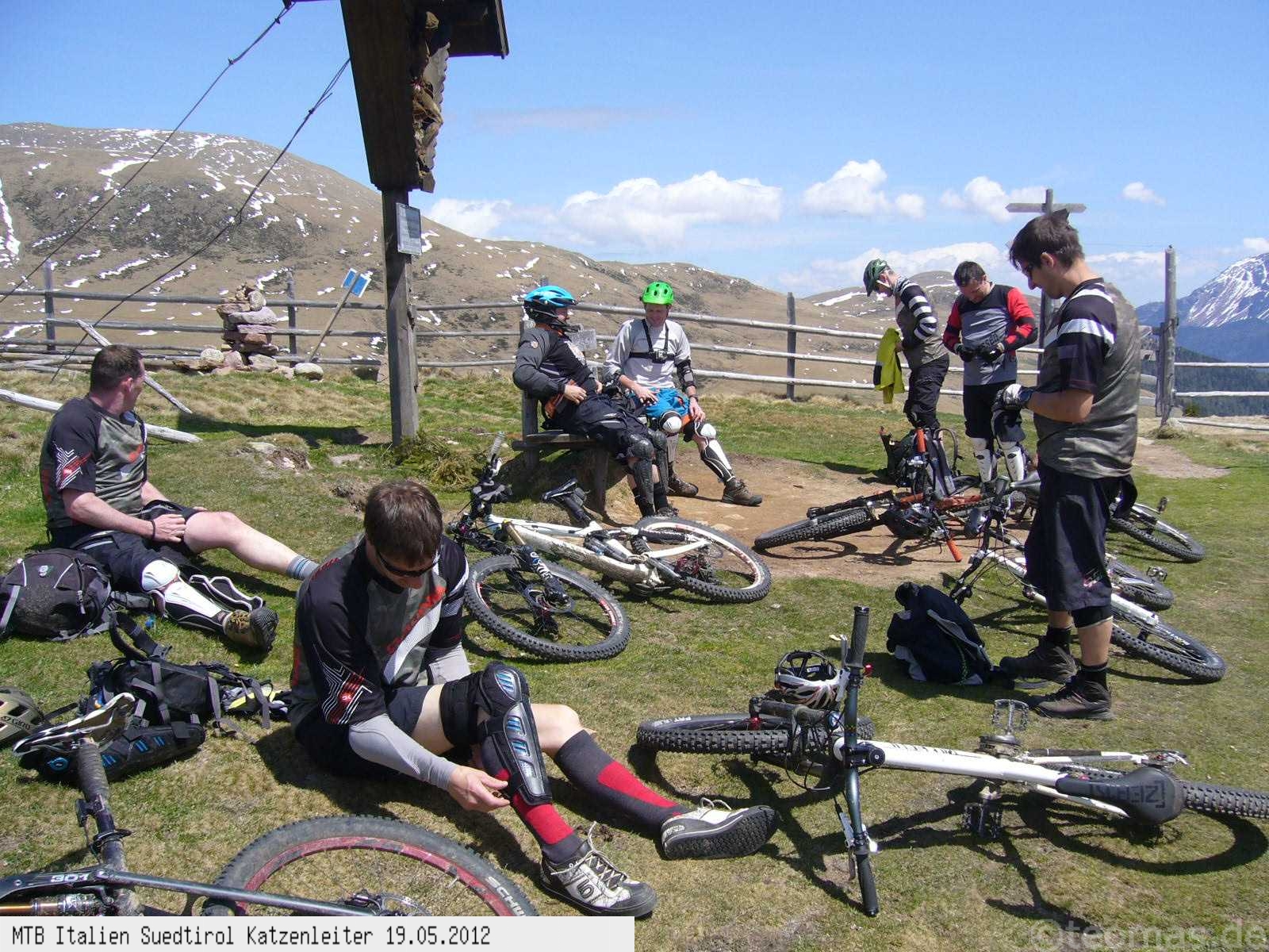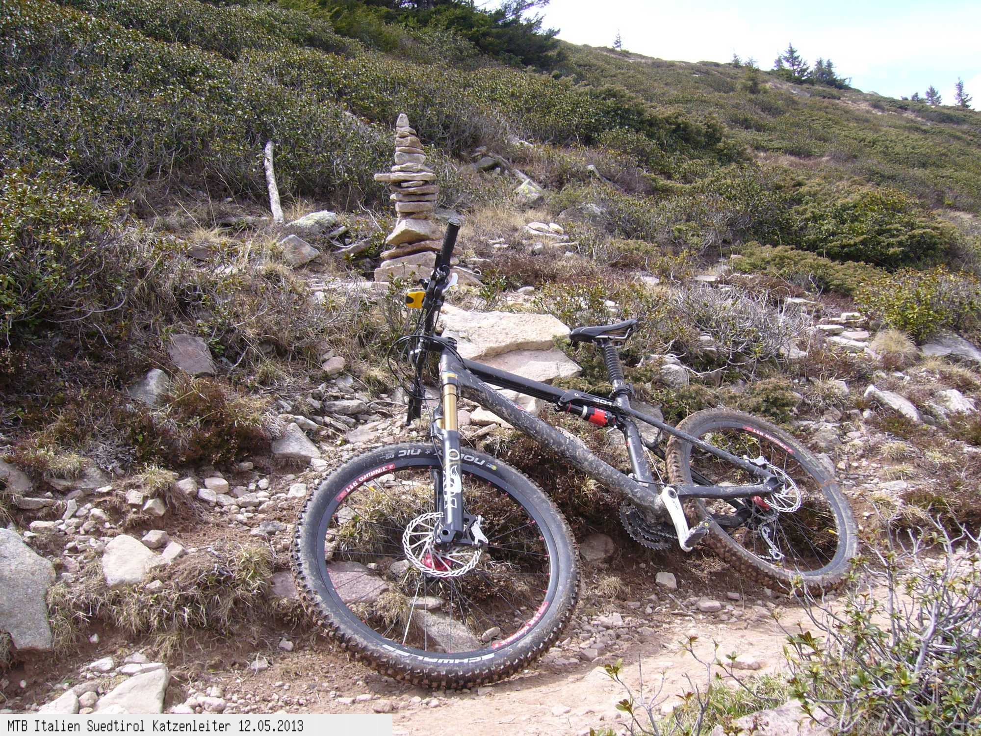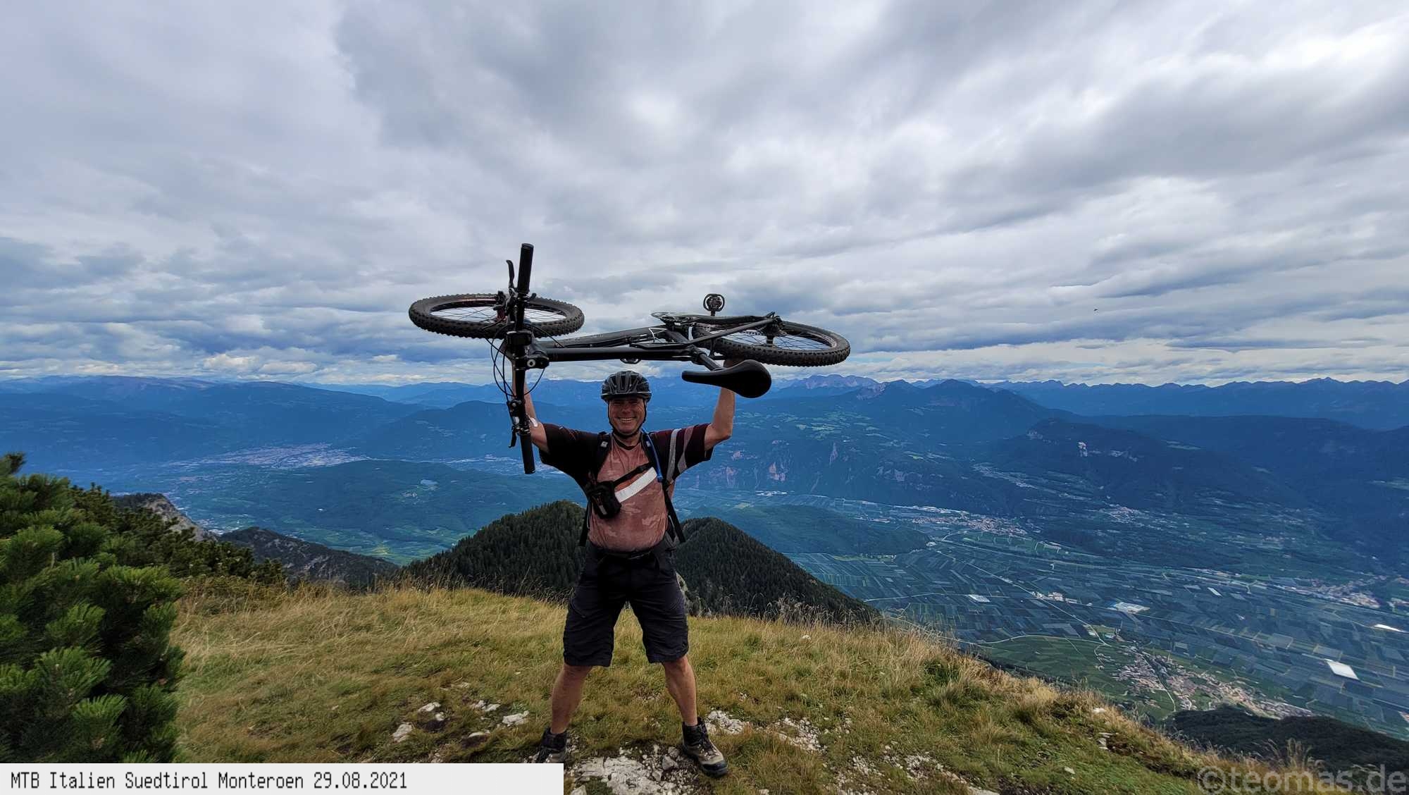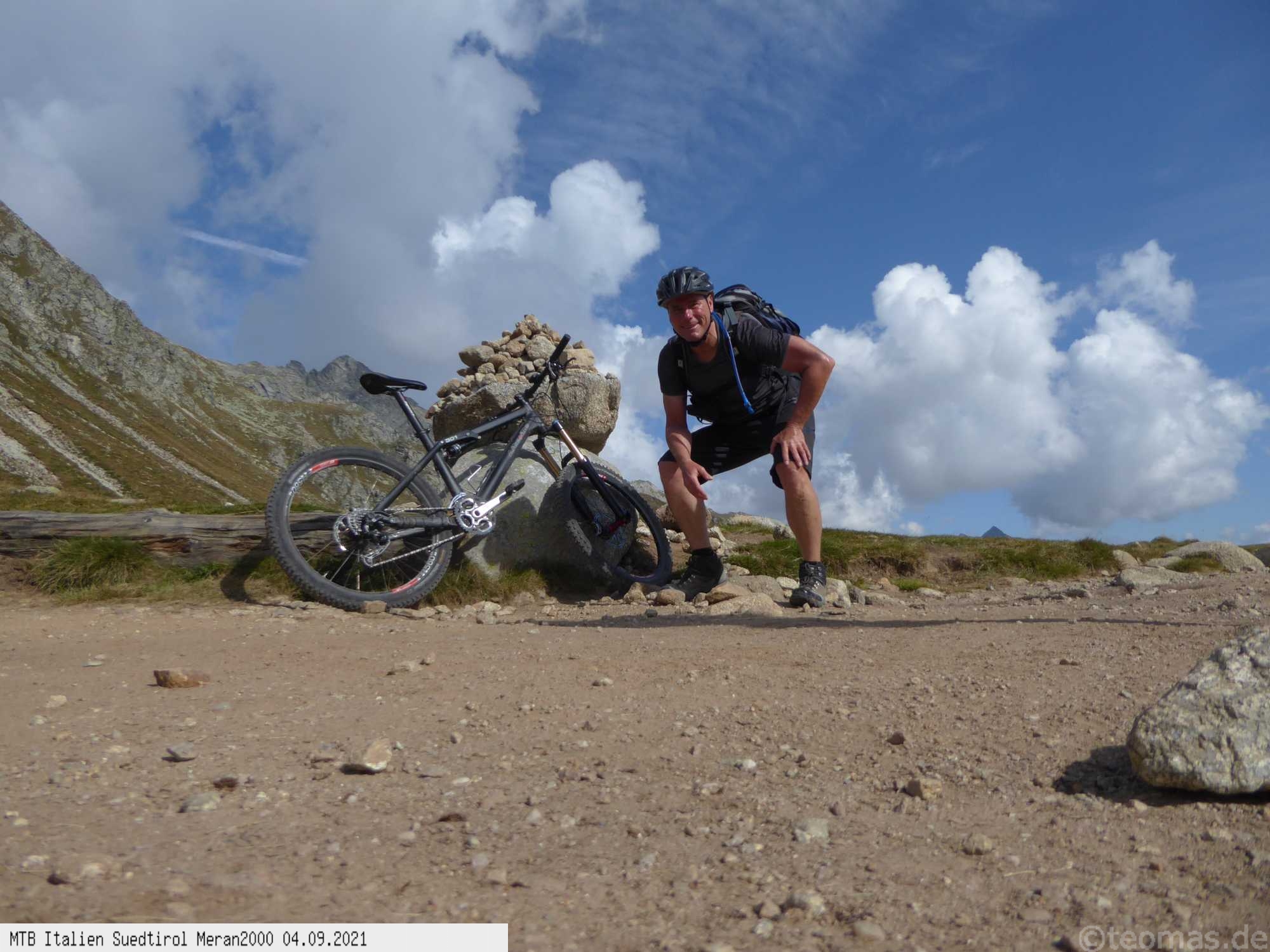 neben dem Höhenangaben Hinweisschild. Alternativ die ebenfalls schwere MTB Trail Tour vom Penegal zum Mendelpass und hinunter nach Kaltern fehren.