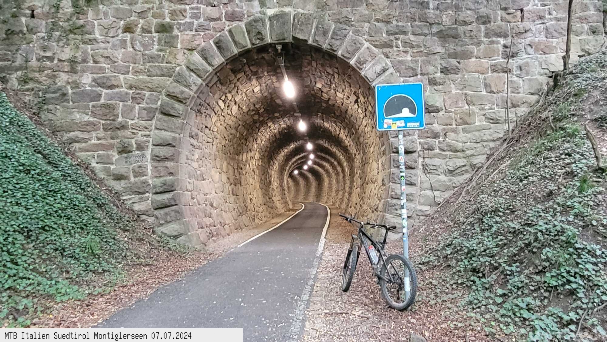 Von Andrian über den Etschtalradweg nach Frangart und an der alten Bahnlinie durch Tunnels bis St. Michele zu den Montigler Seen.