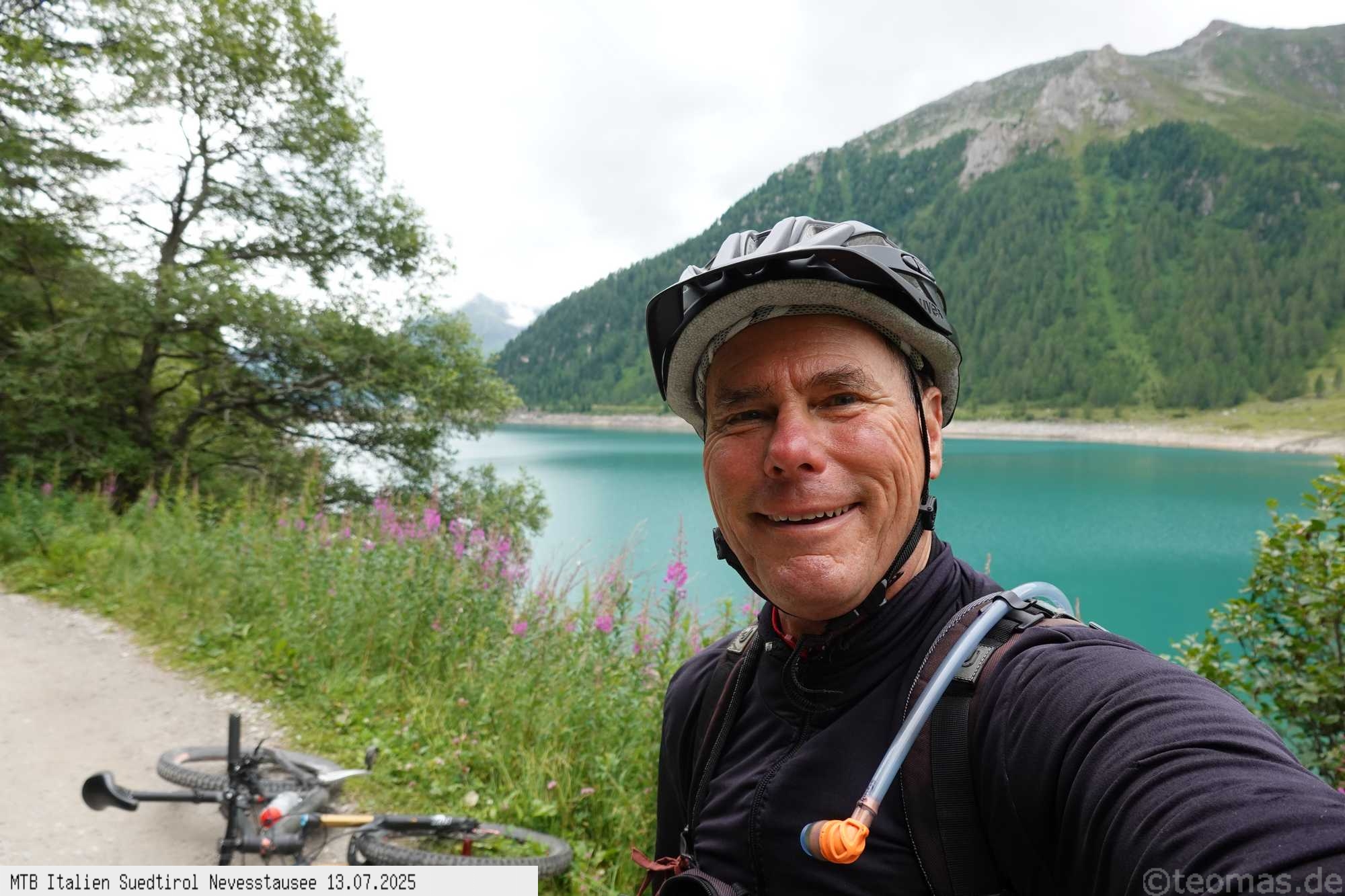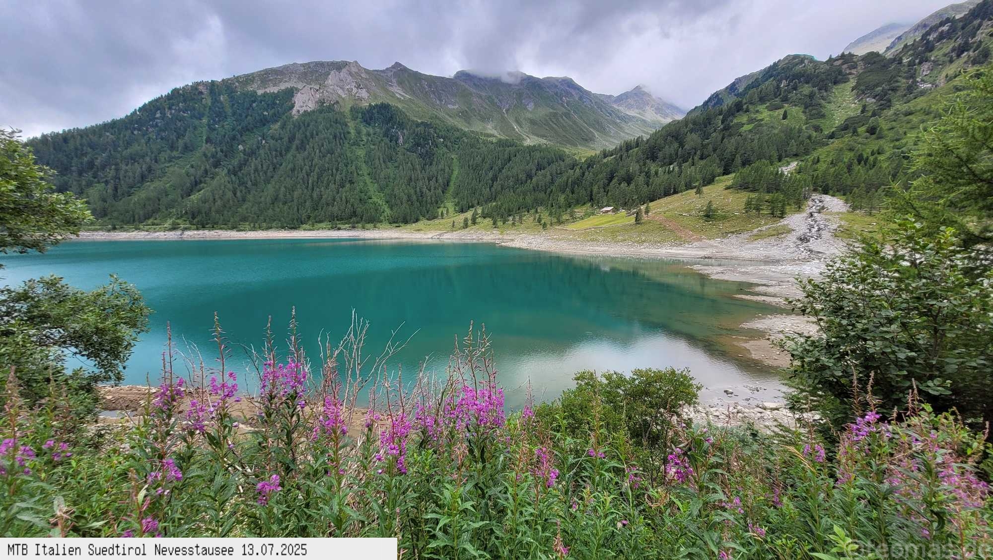 Dort Startet die MTB Tour mit steiler Auffahrt auf Teer zum Neves Stausee am Talschluß. Der Stausse liegt am Fuße des großen