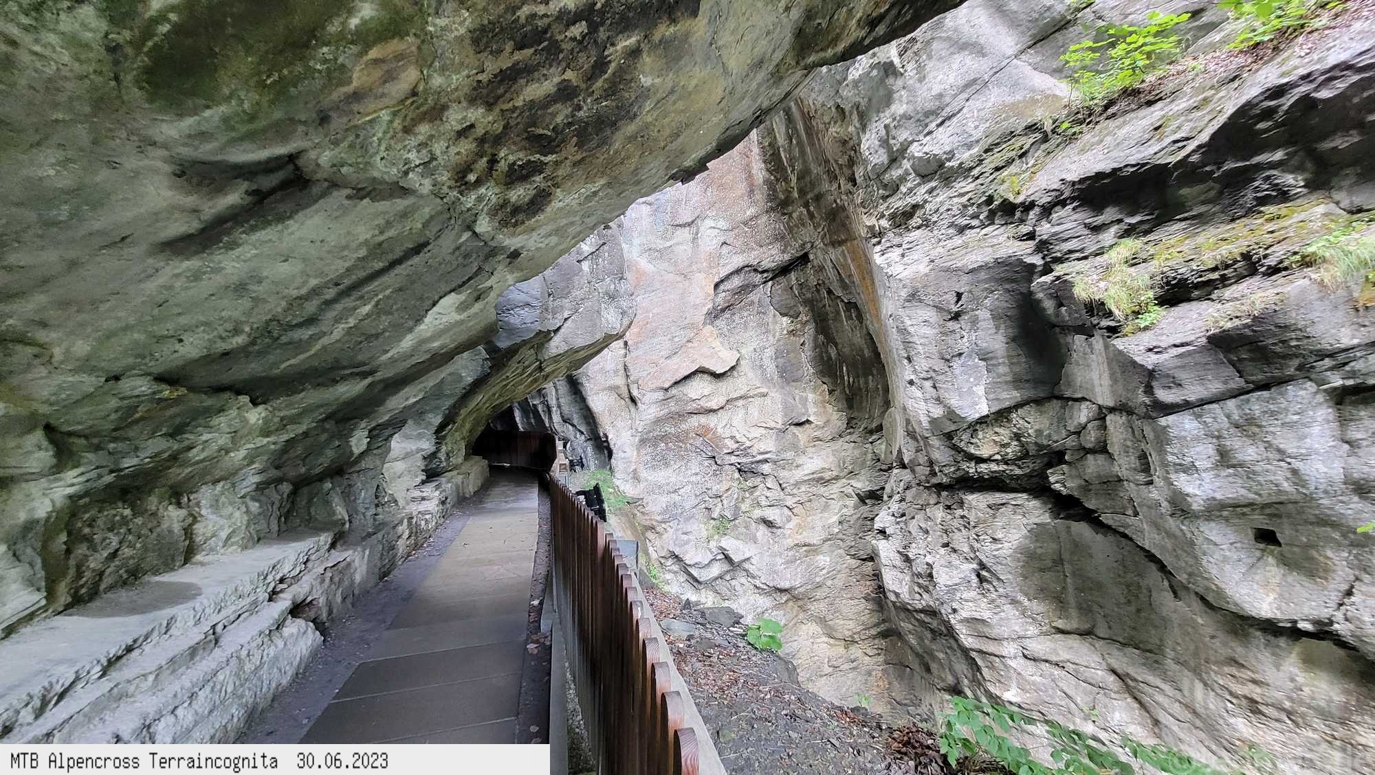 Der aus dem Mittelalter stammende Weg führt durch Felstunnels und über ruppige Trails nach Domleschg. Nach kurzem erreichte man Thusis am Hinterrhein.