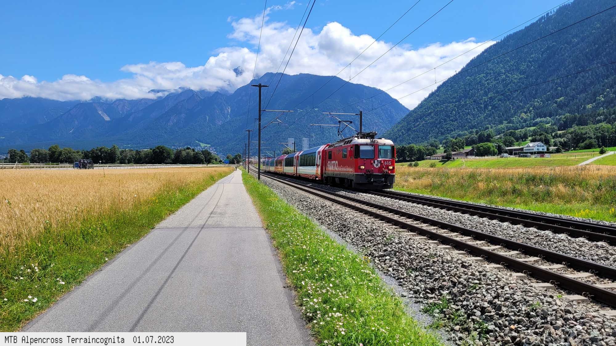 Blicke auf die Glacier Express Bahnstrecke, sehr abwechslungsreicher Abschnitt mit Waldtrails, Schotterwegen und ewigem Auf und Ab, bis man auf die