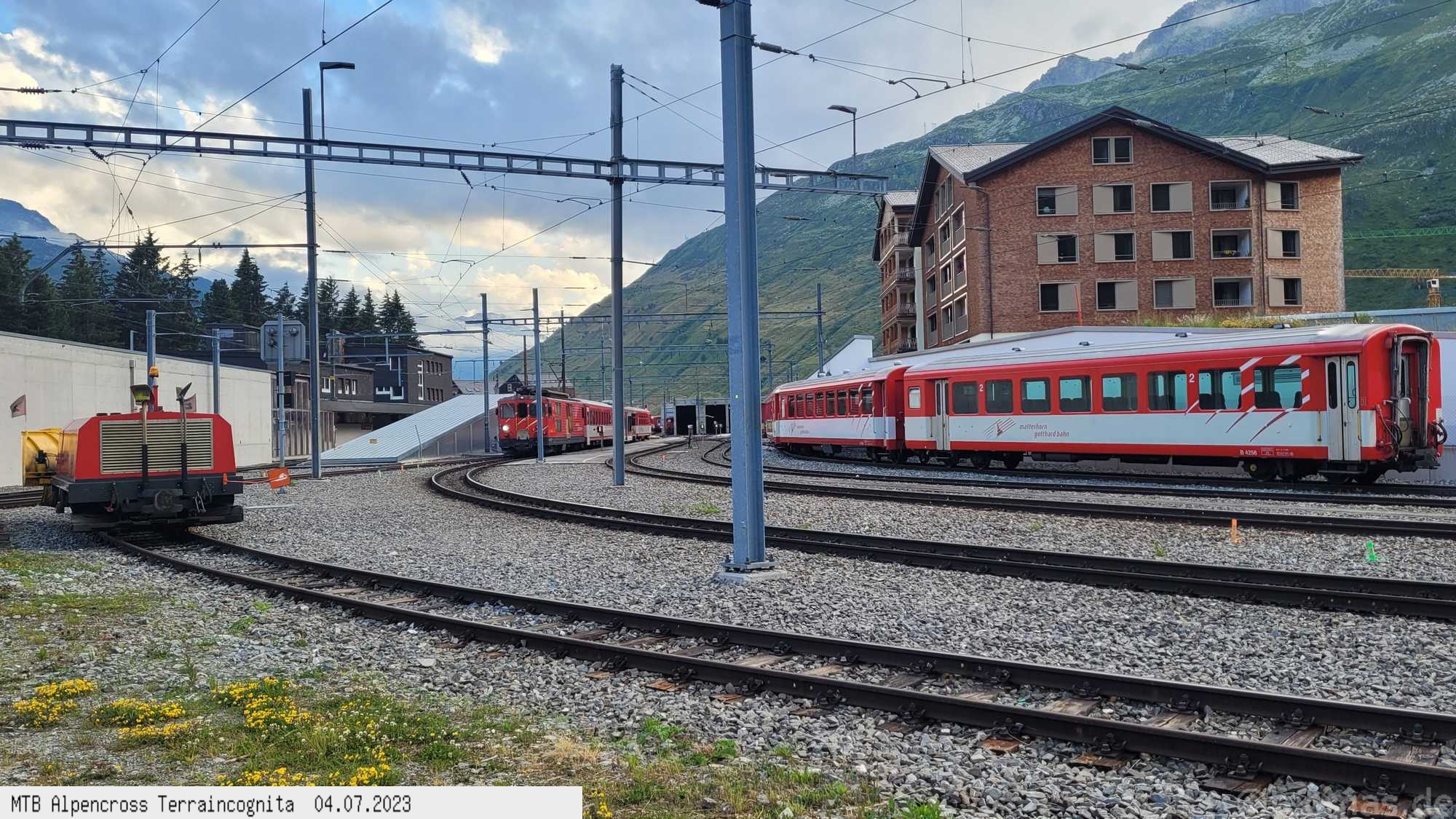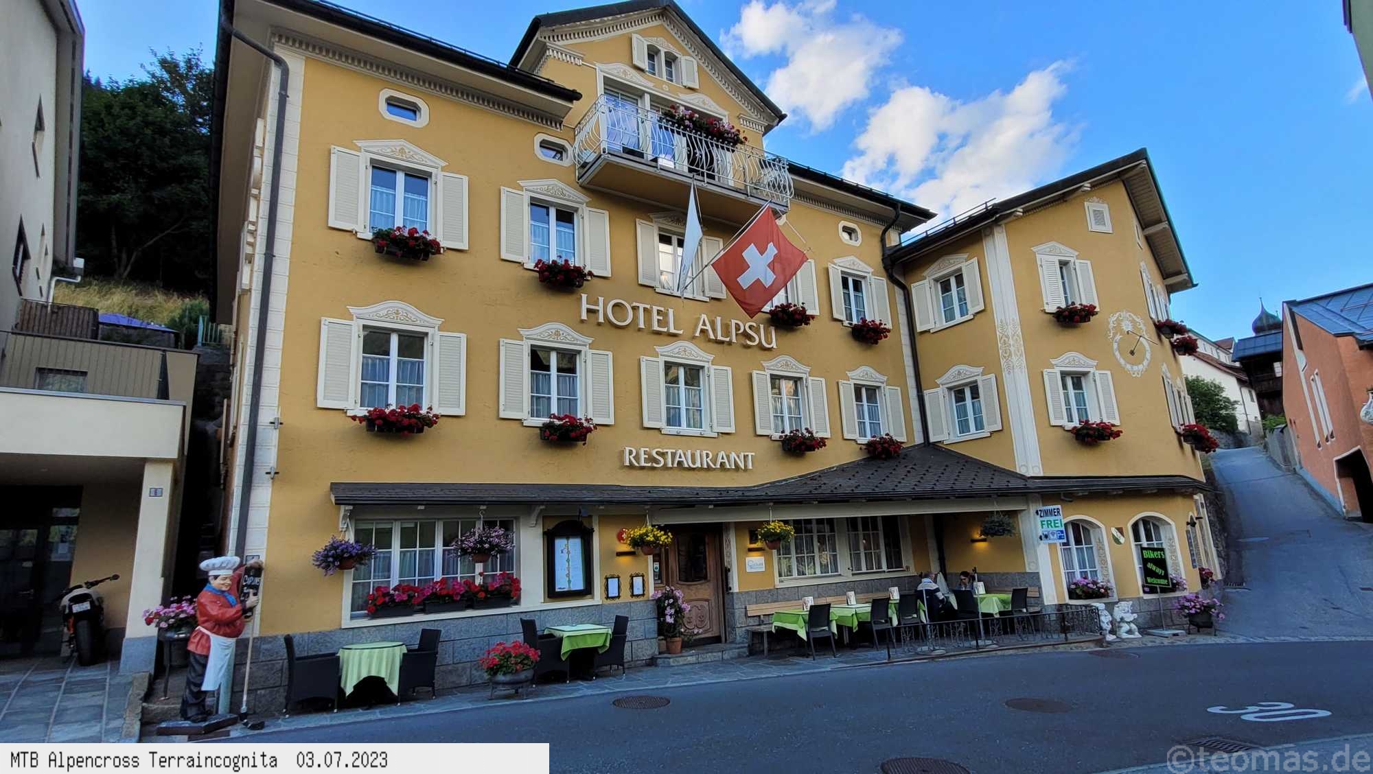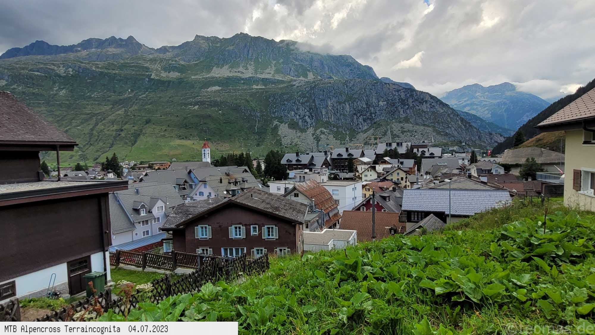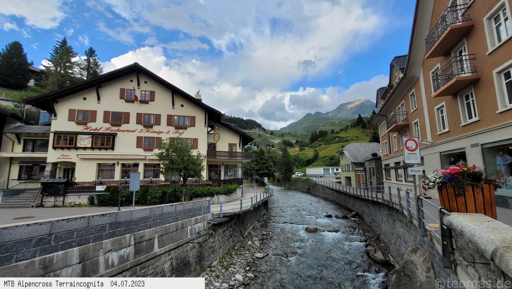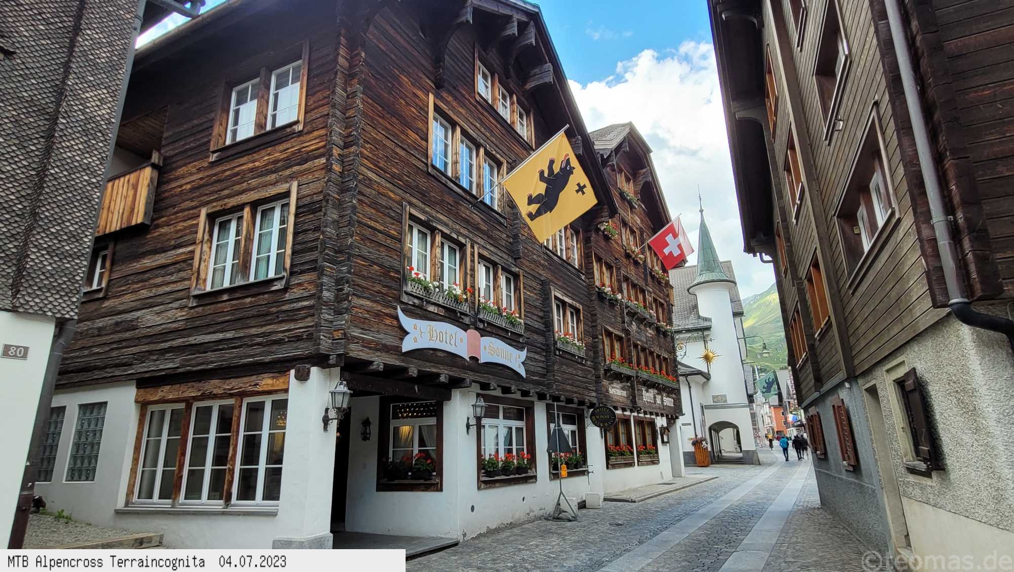 Hinunter nach Andermatt auf krassem Trail, verblockt, steil, technisches Highlight. Übernachtung in Andermatt im Gasthaus zum Sternen direkt im Ort mit Biergarten.