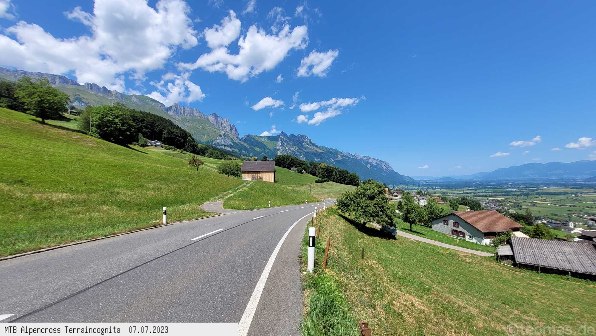 Sehr aufregend! Nach weiteren welligen Wegstücken endlich bergab ins Rheintal. Rasanter steiler Schotterweg mit kolossaler Bergkulisse bis Zignau,