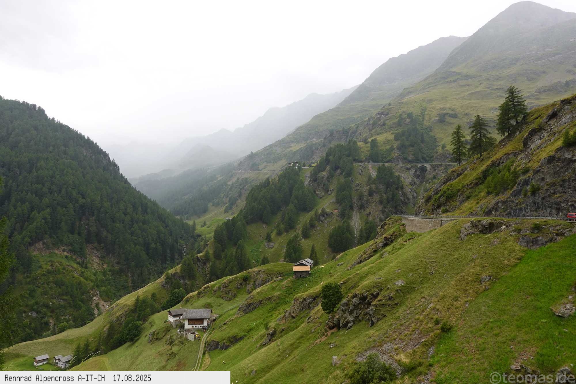 bei 11°C leichter Regen, weiter südlich Besserung in Sicht. Rasante Abfahrt nach Moos im Passeier bis St. Leonhard, unterwegs