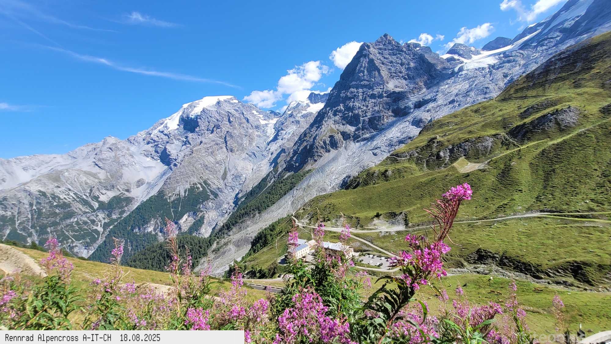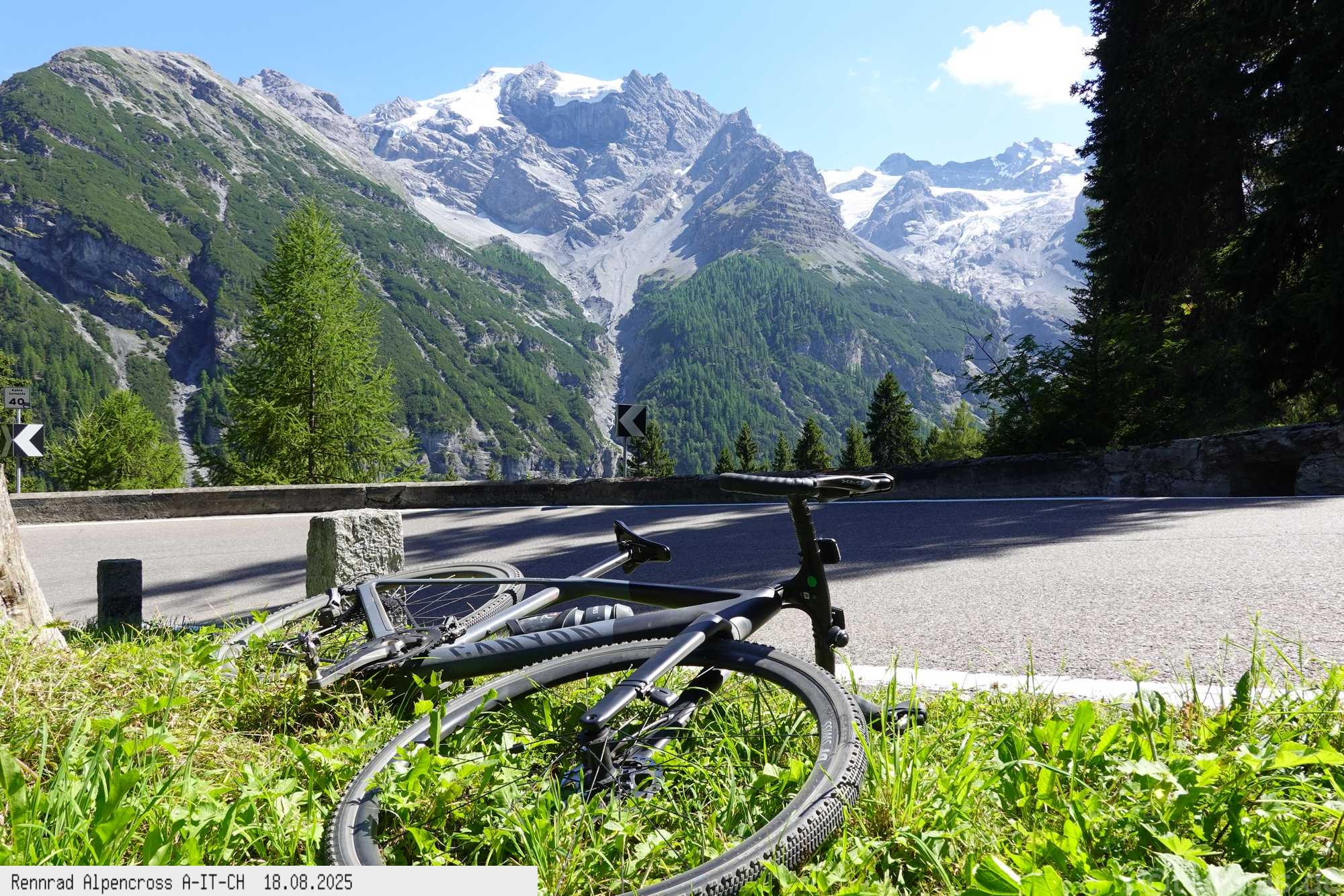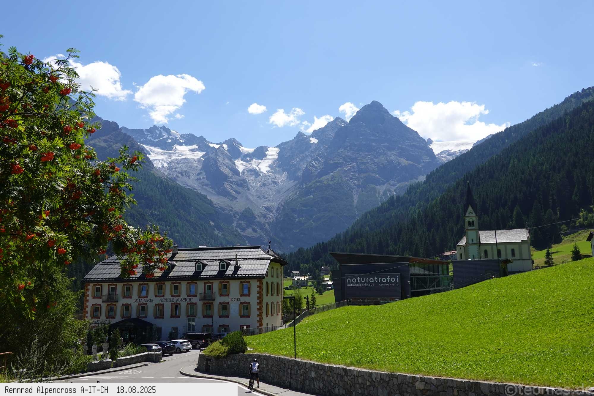 für Hotel! Nach Rast in Prad gegen 13 Uhr weiter hinauf bis Stilfs und Trafoi bei 37°C in der Sonne, puh! Immer weiter hoch über den