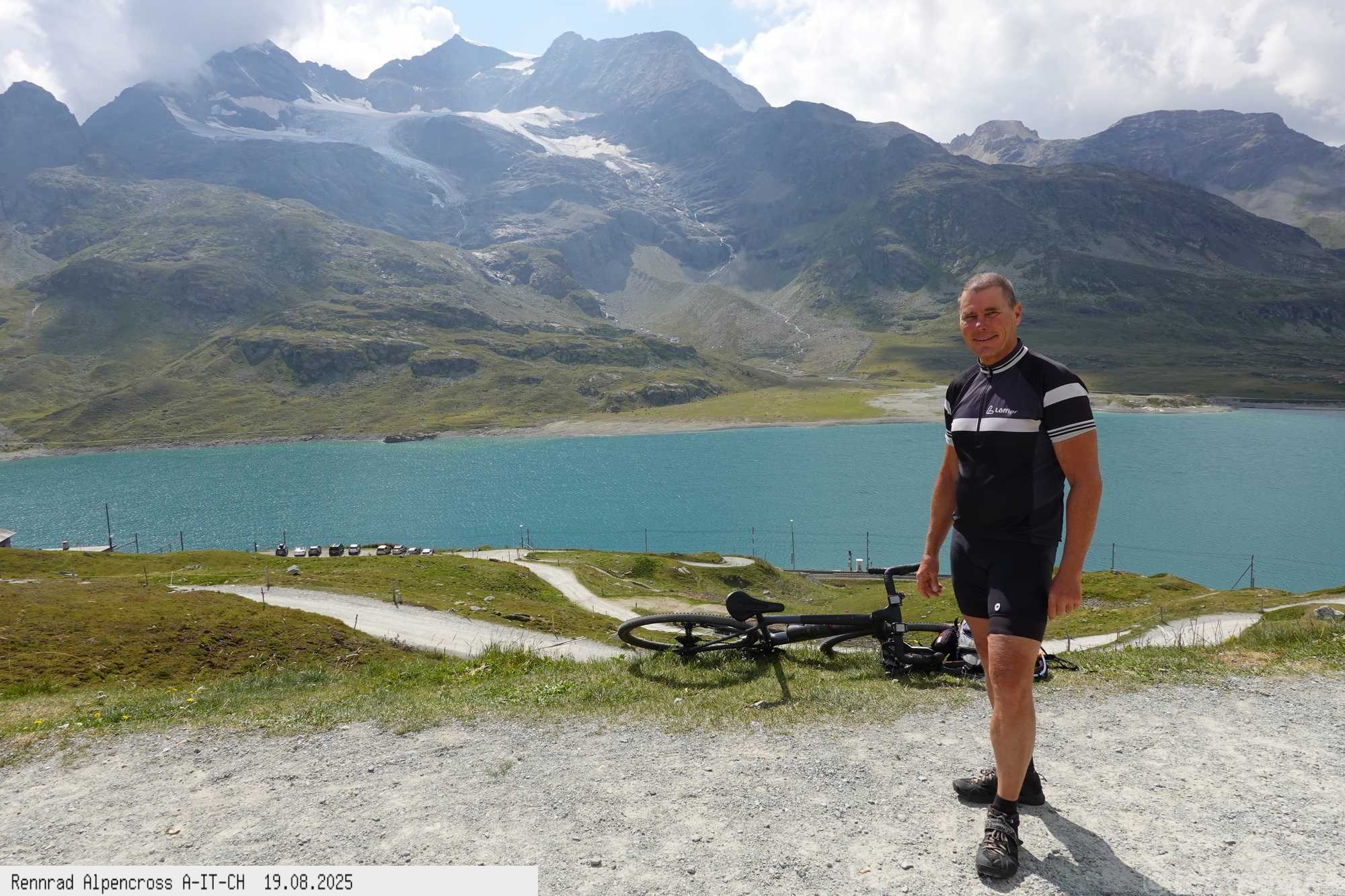 eine halbe Stunde beim Ospizio Bernina mit Blick auf den Lago Bianco und in die Gletscher Welt die Aussicht genossen.