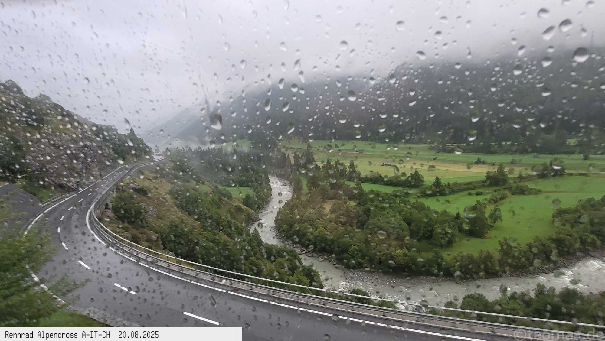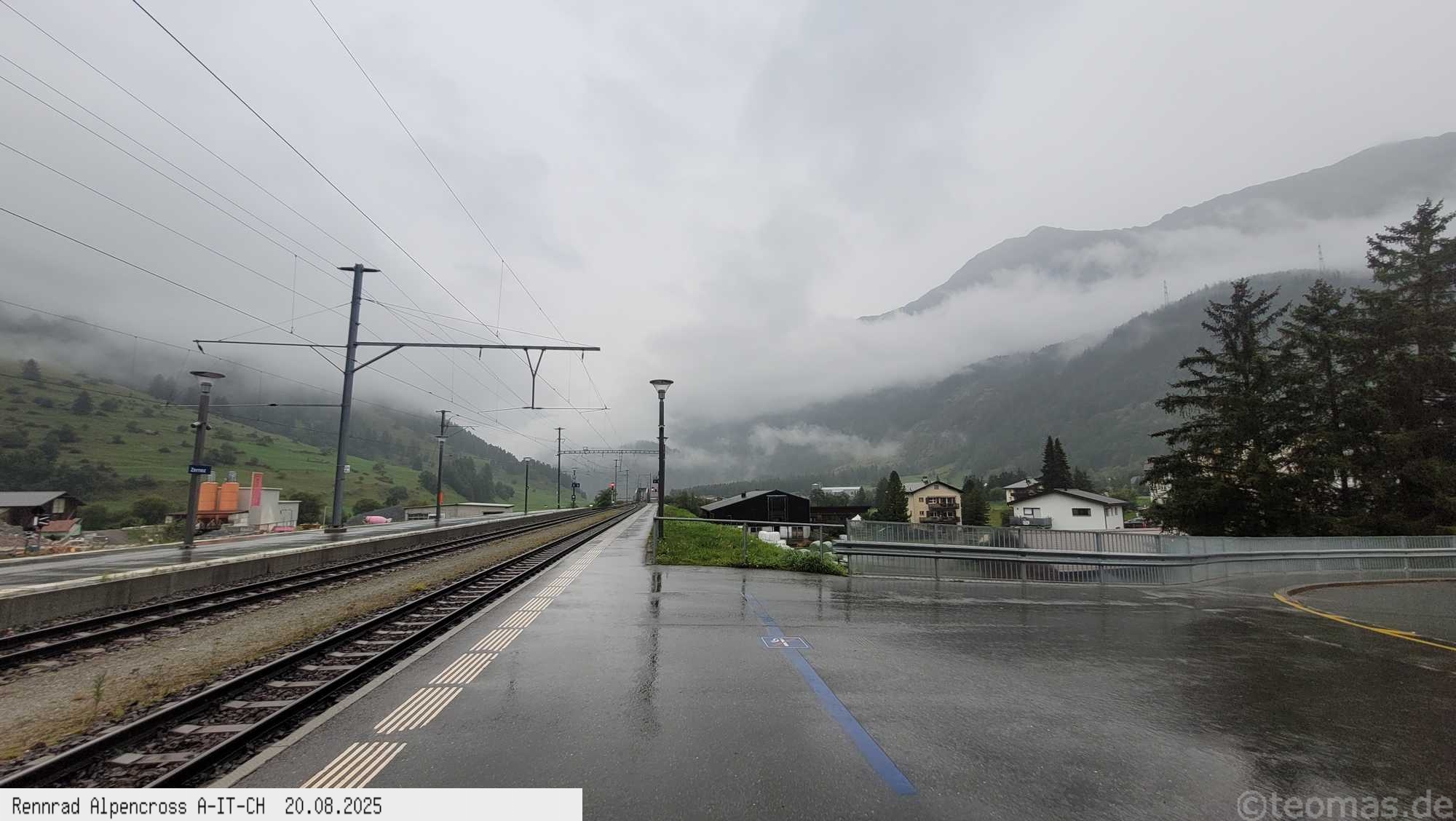 Umsteigen in den Bus auf der österreichischen Seite und Fahrt nach Landeck-Zams Bahnhof. Auf der gesamten Strecke Regen in Strömen.