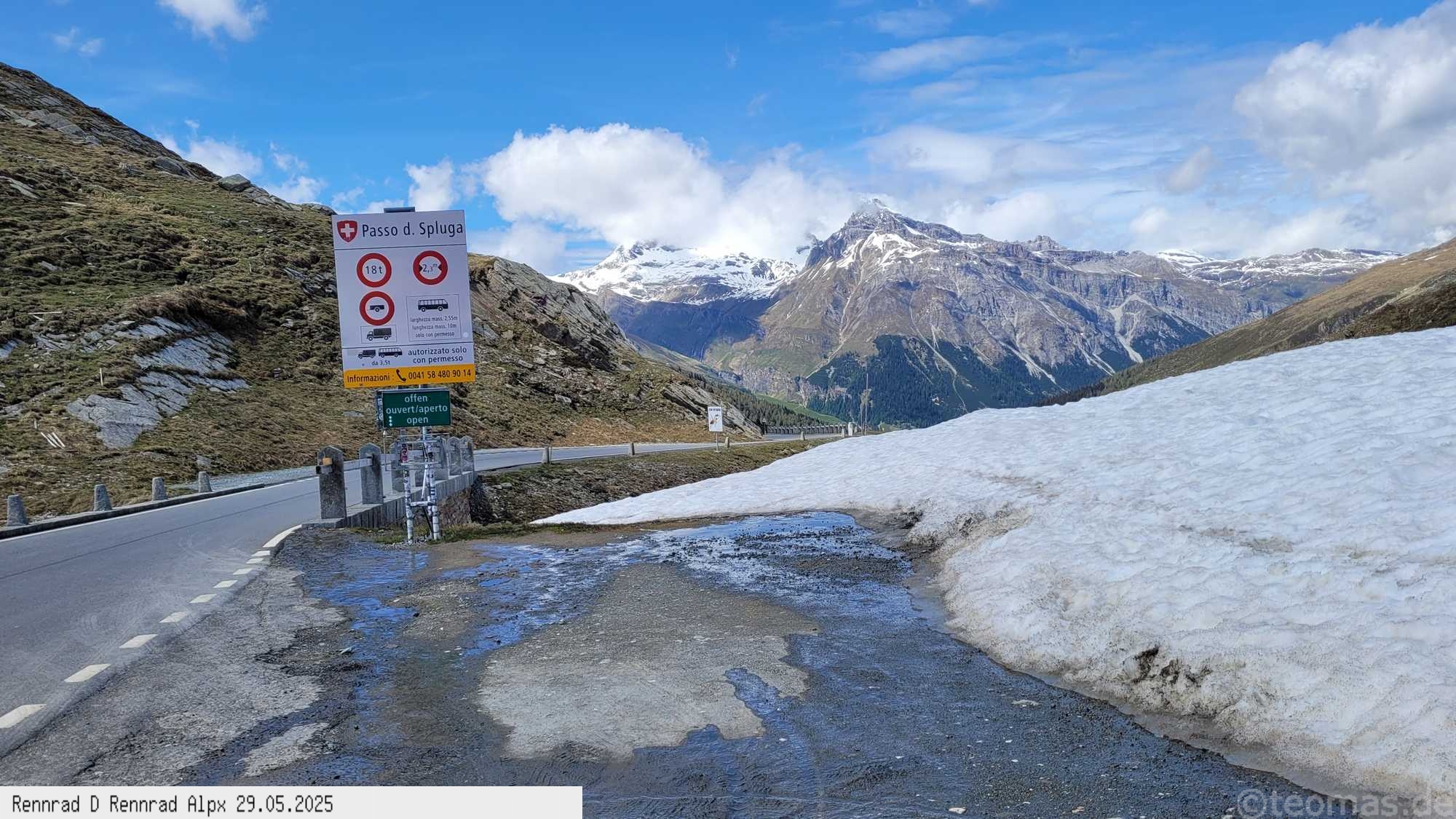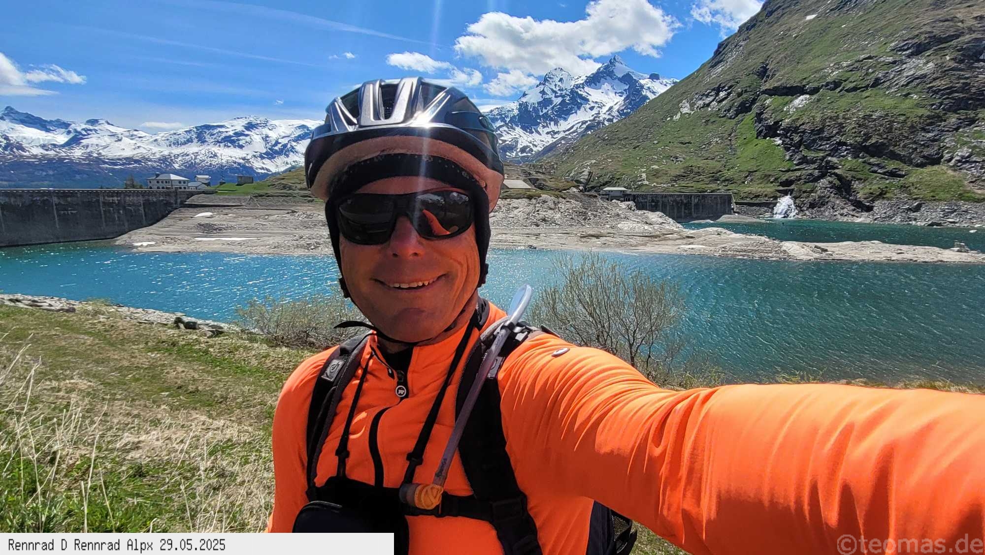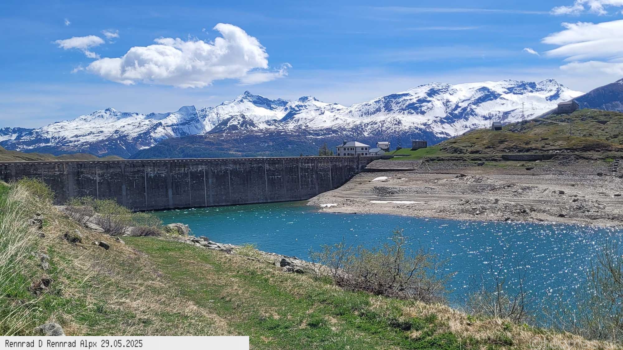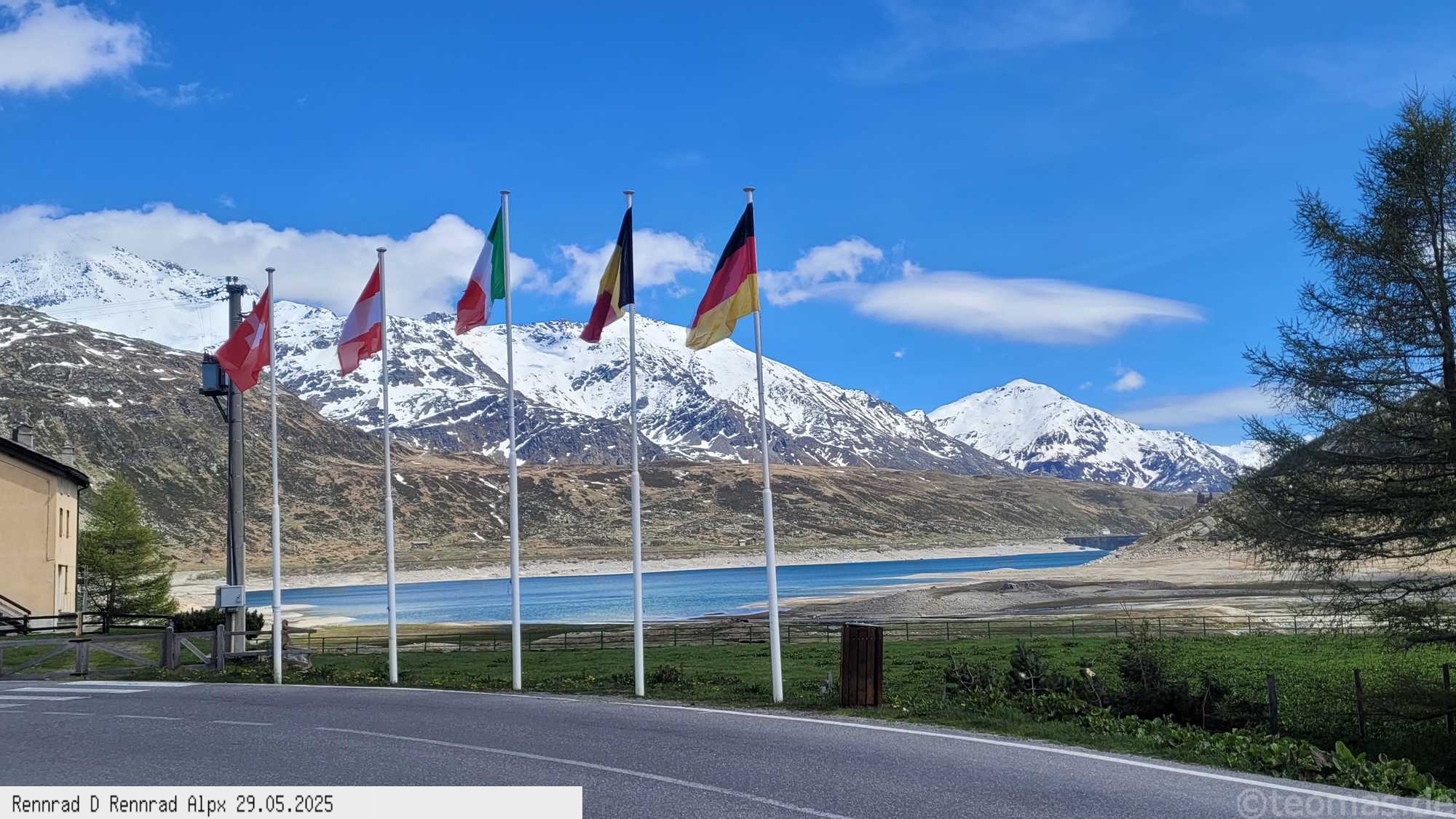 Dort oben phantastische Landschaft bei sonnigen 7°C und starkem Südwind um 15 Uhr. Es folgten 48 Serpentinen vorbei am Monte Spluga Stausee mit Traumblicken