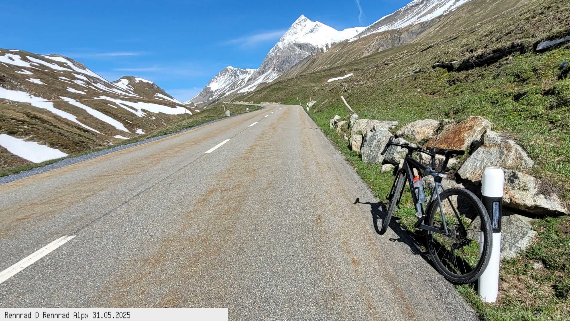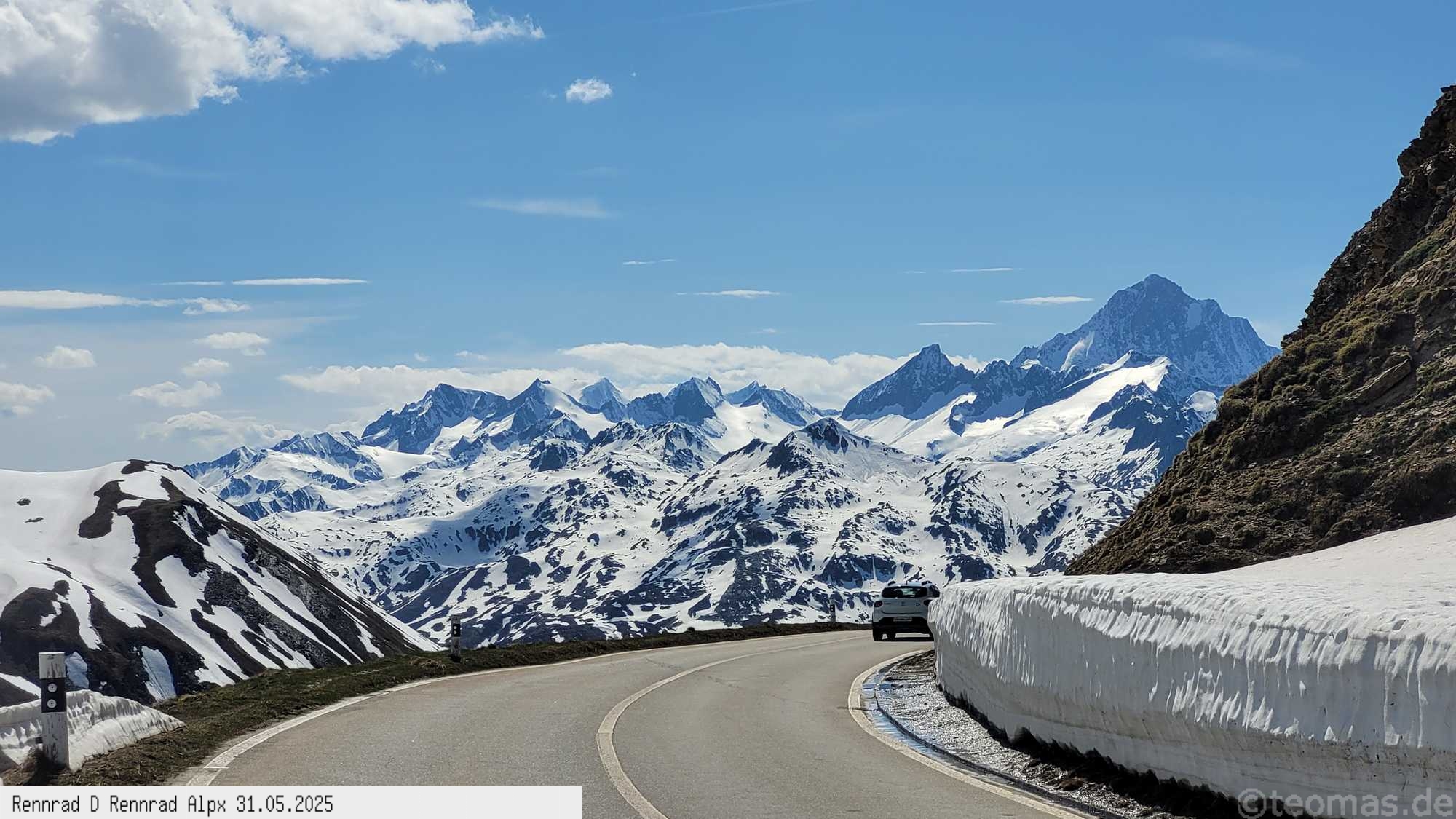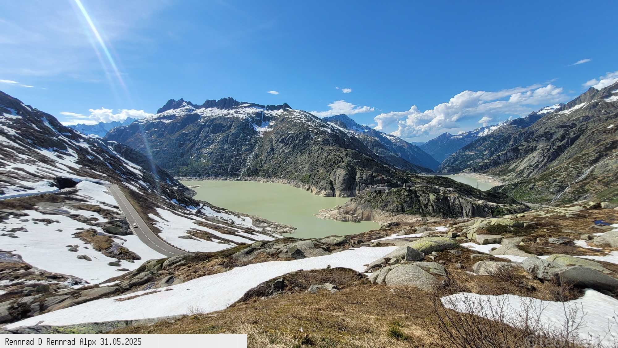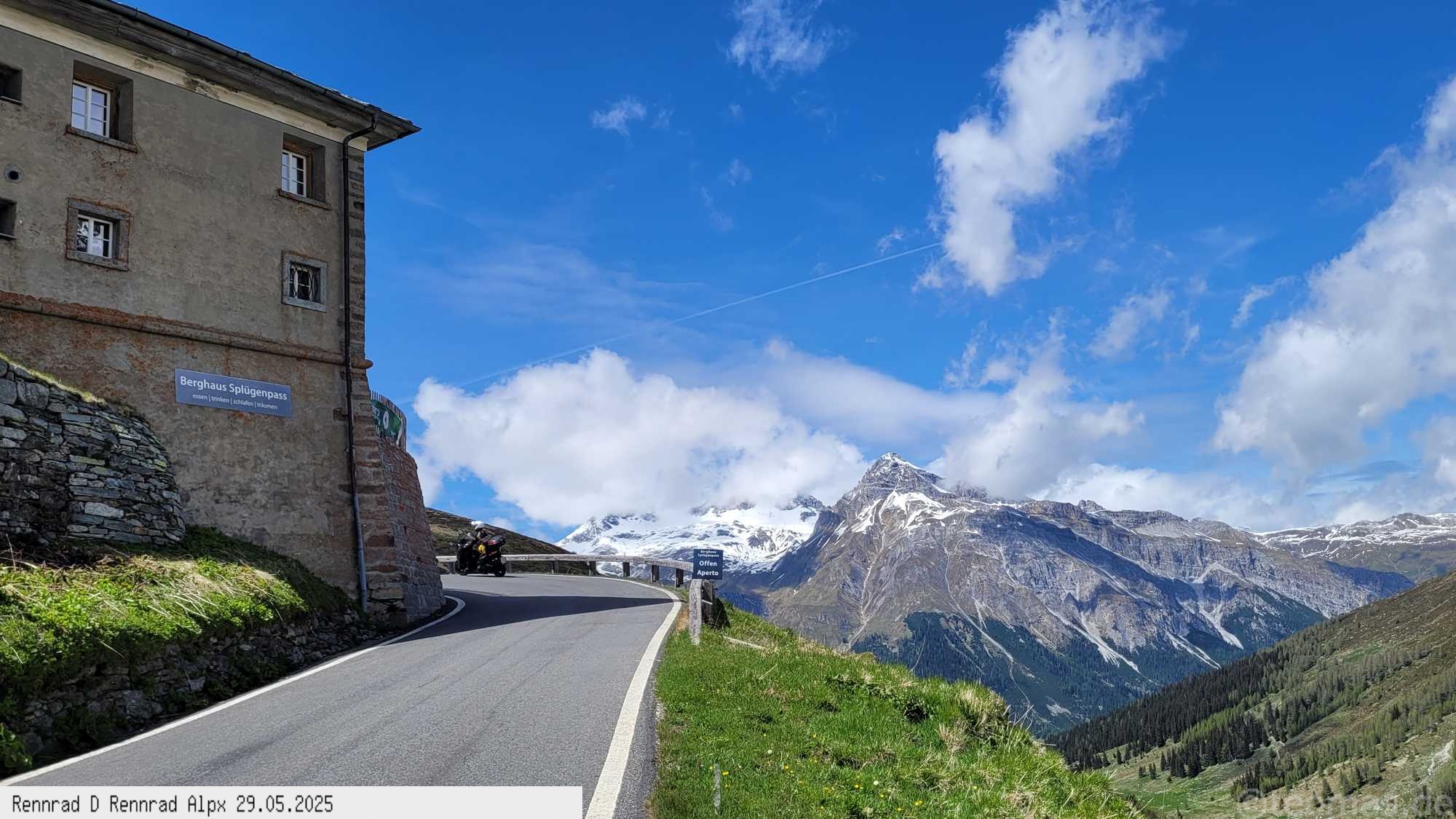 Dort oben phantastische Landschaft bei sonnigen 7°C und starkem Südwind um 15 Uhr. Es folgten 48 Serpentinen vorbei am Monte Spluga Stausee mit Traumblicken