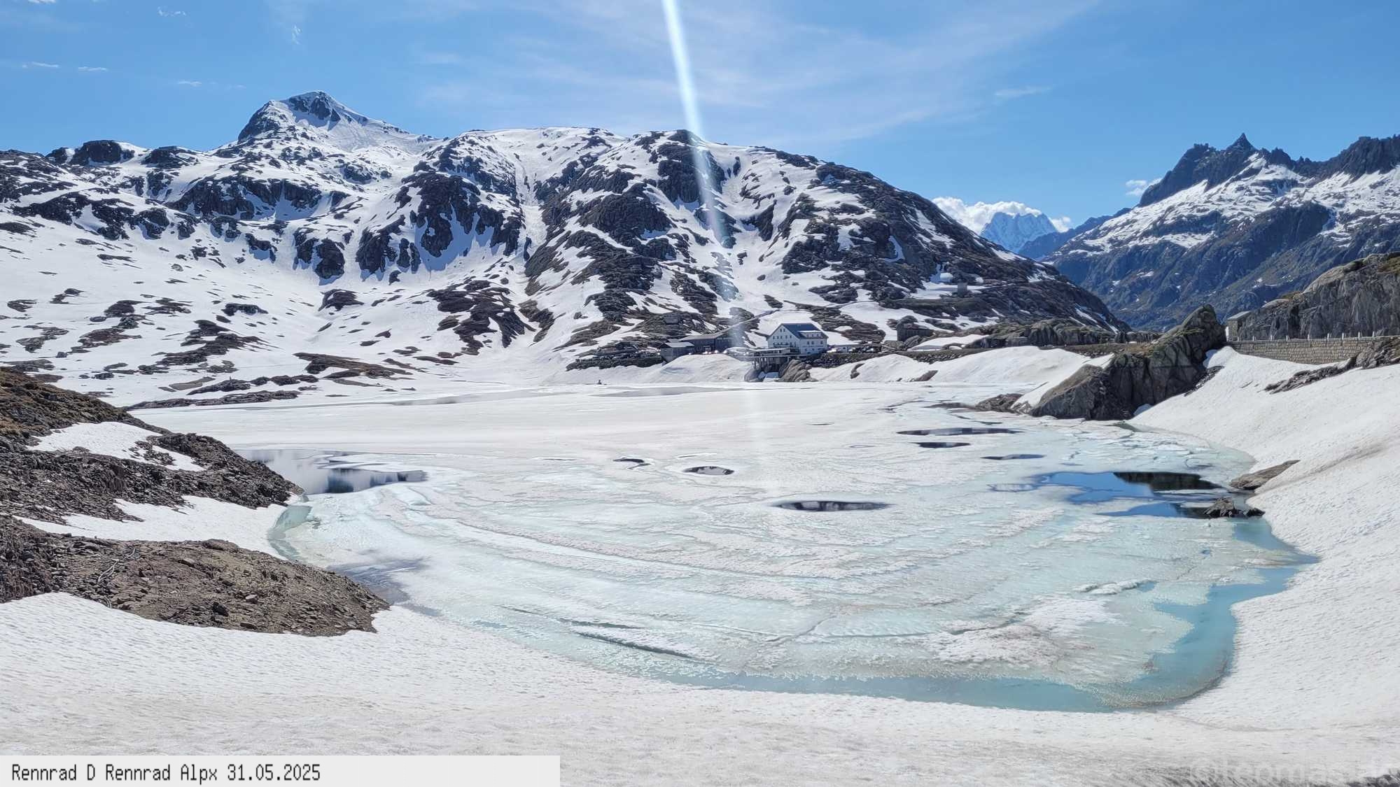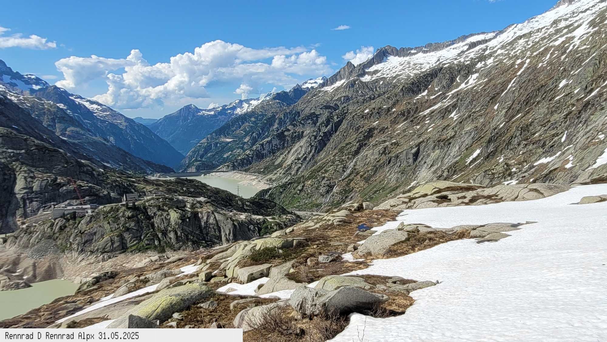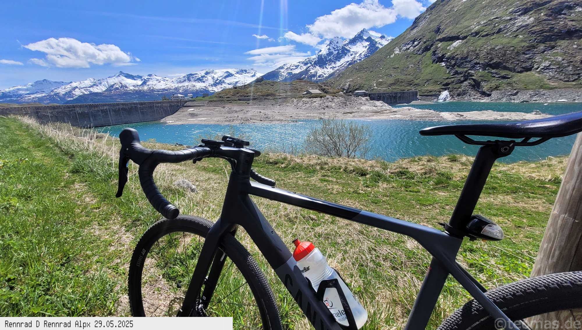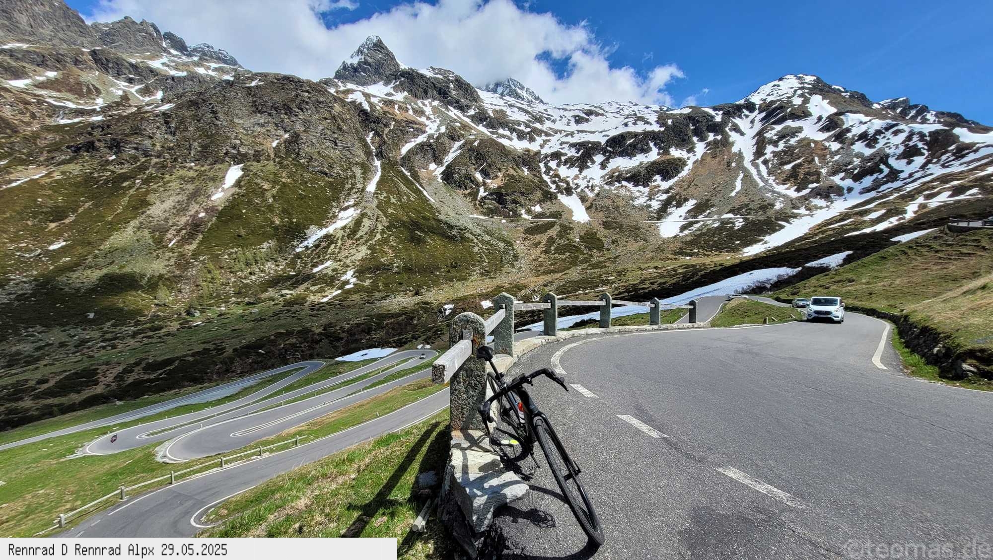 Dort oben phantastische Landschaft bei sonnigen 7°C und starkem Südwind um 15 Uhr. Es folgten 48 Serpentinen vorbei am Monte Spluga Stausee mit Traumblicken