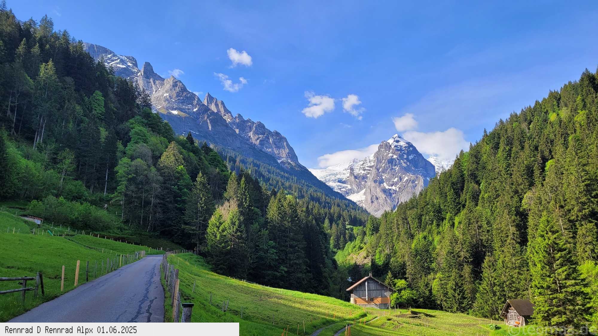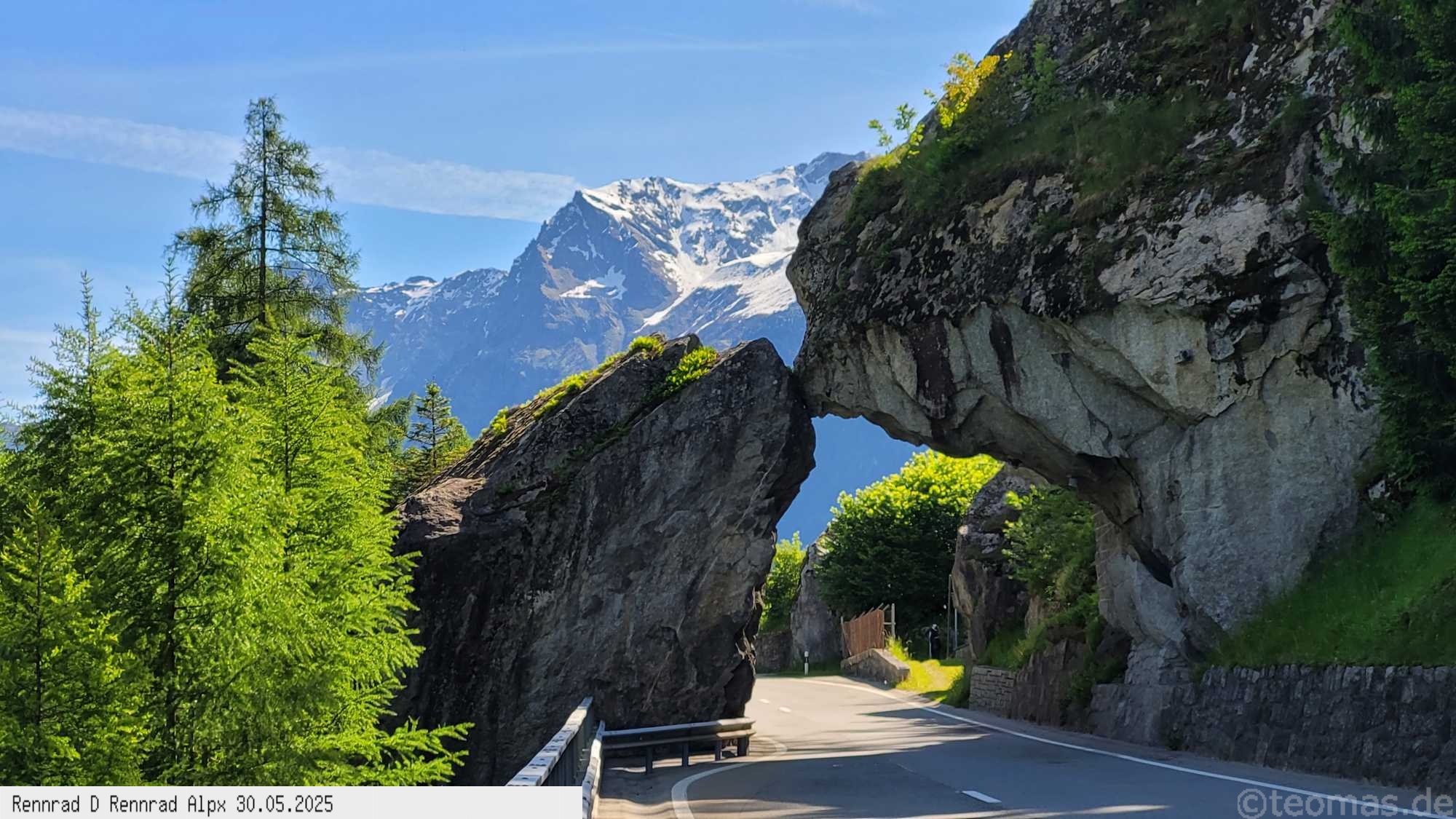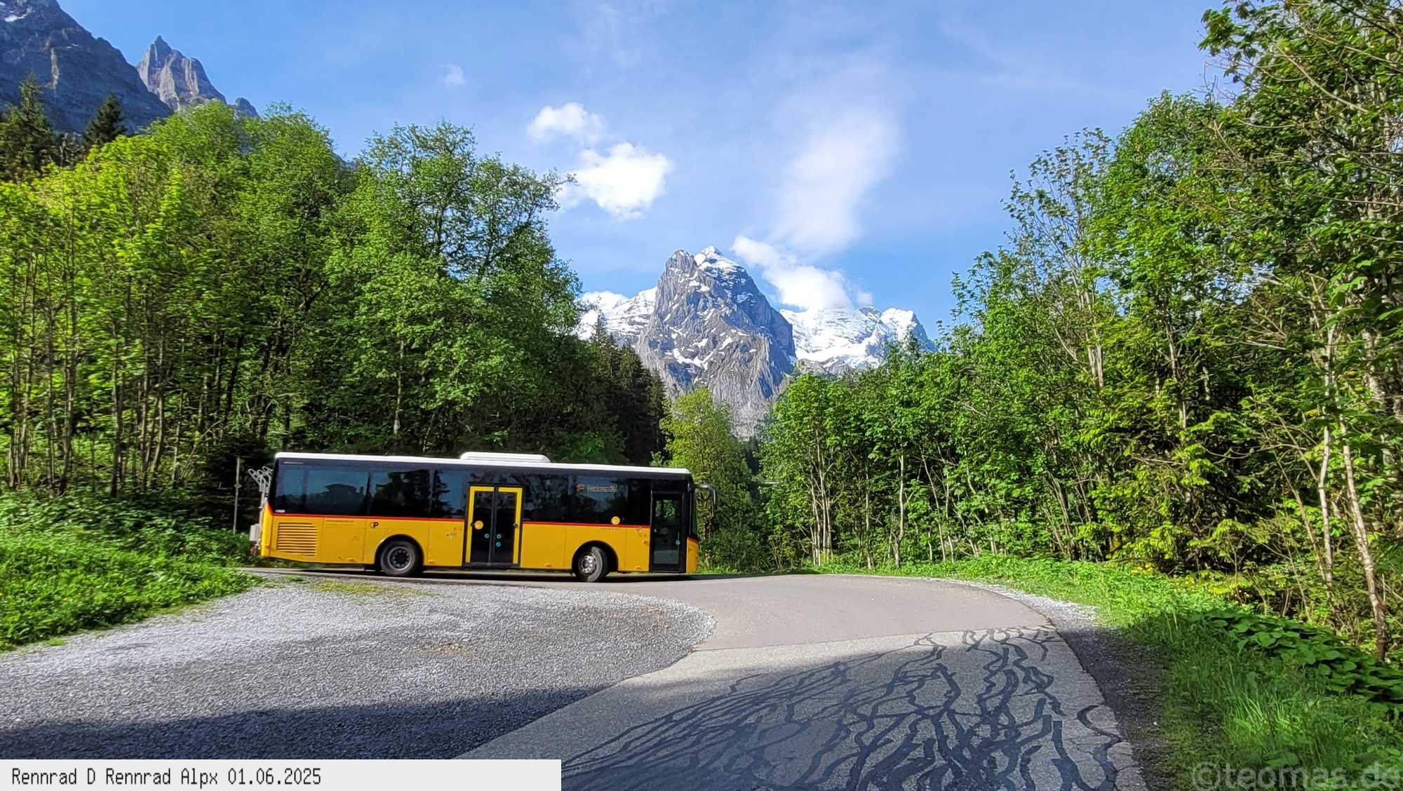 Blicken auf die ersten Gletscherberge. Ab der Alp dürfen nur noch Postautos fahren, somit hat man die schmale Straße meist für sich.