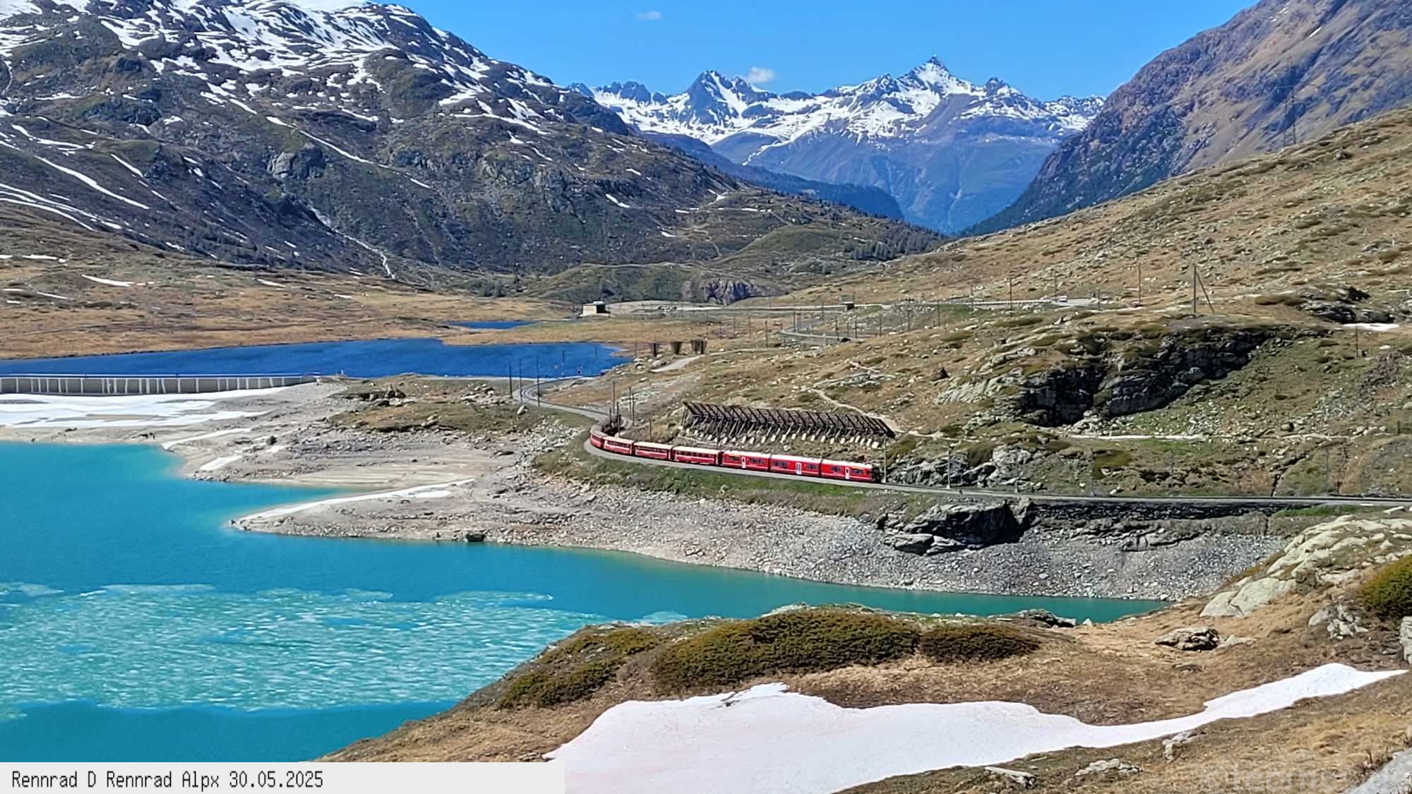 des Bernina Express. Schon um 15 Uhr oben, der Lago Bianco noch teils zugefroren, Traumkulisse in der Sonne bei blauem Himmel und 15°C. Nach ausgiebigem Genuß