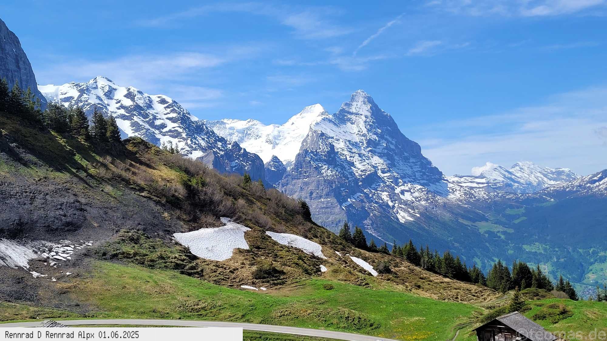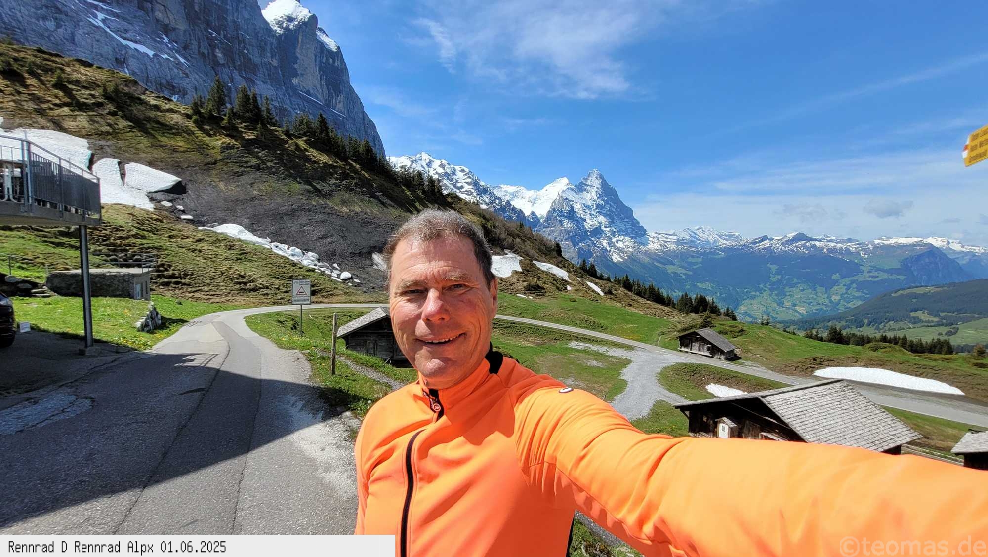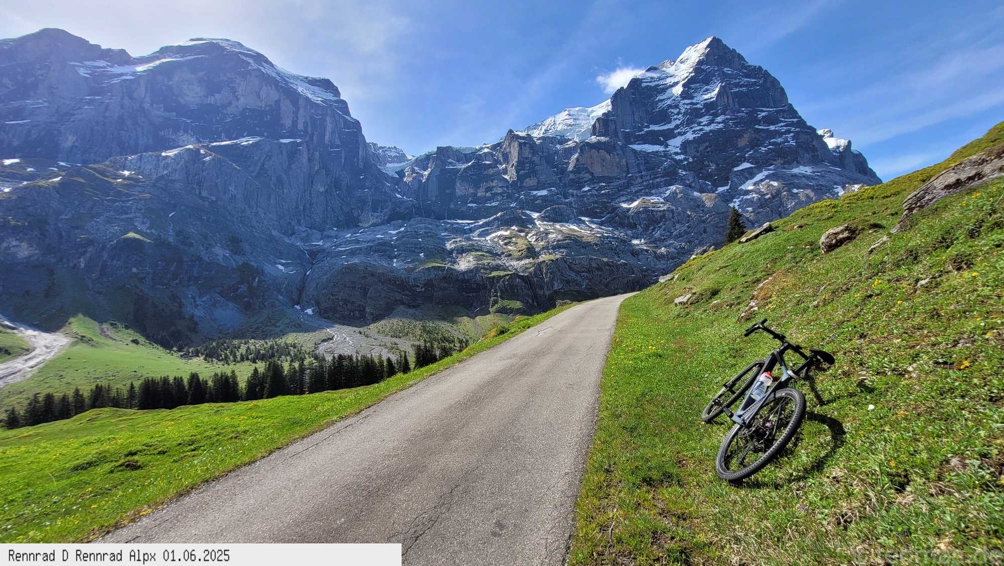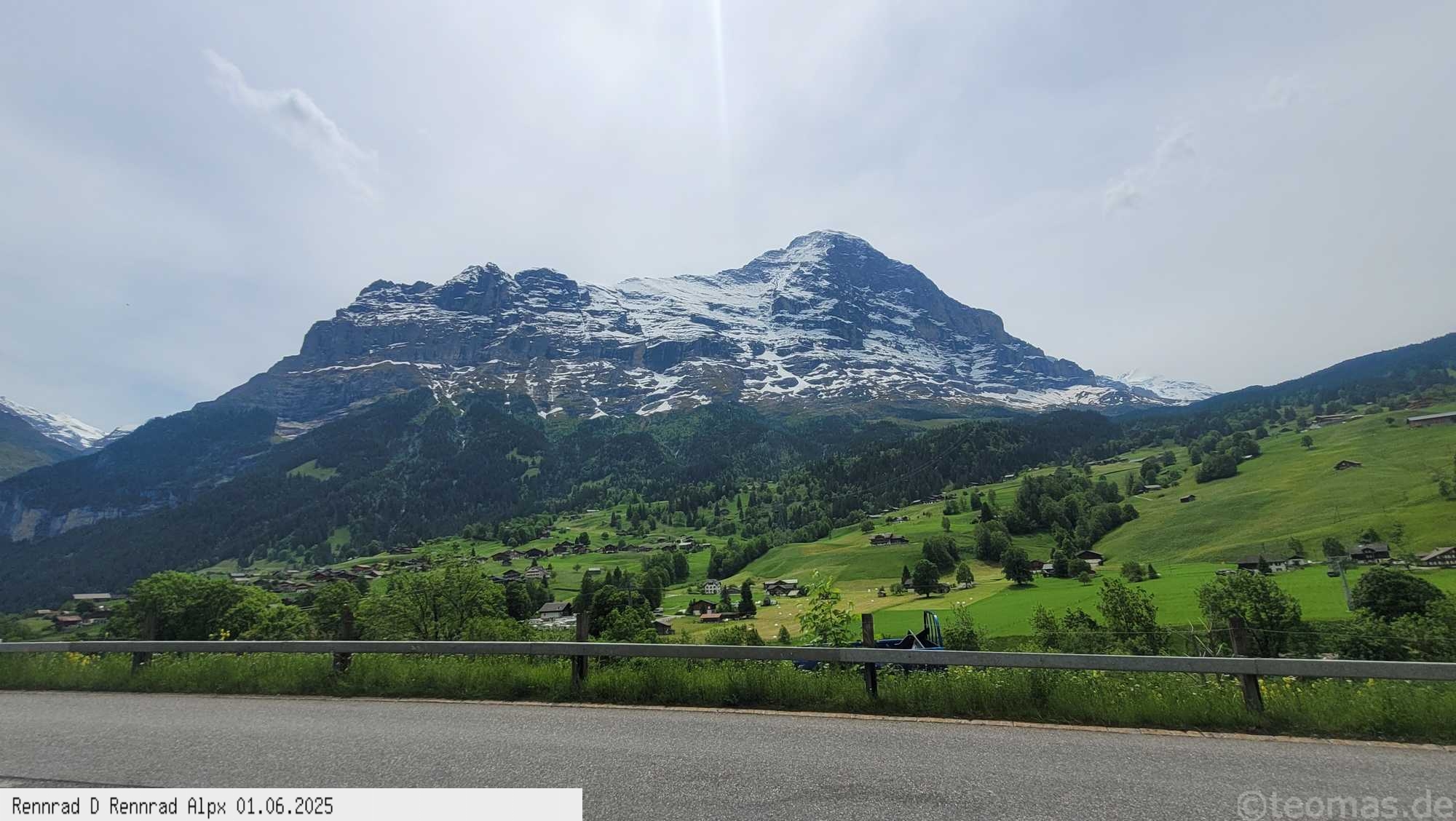 dahinter liegenden Gipfeln der Mönch und Jungfrau. Kurz vor Grindelwald bei der Abfahrt das Rad für einen Fotostopp in einem Feldweg Abzweig