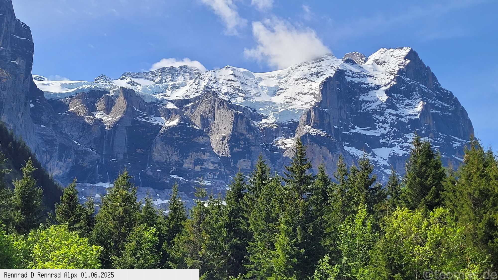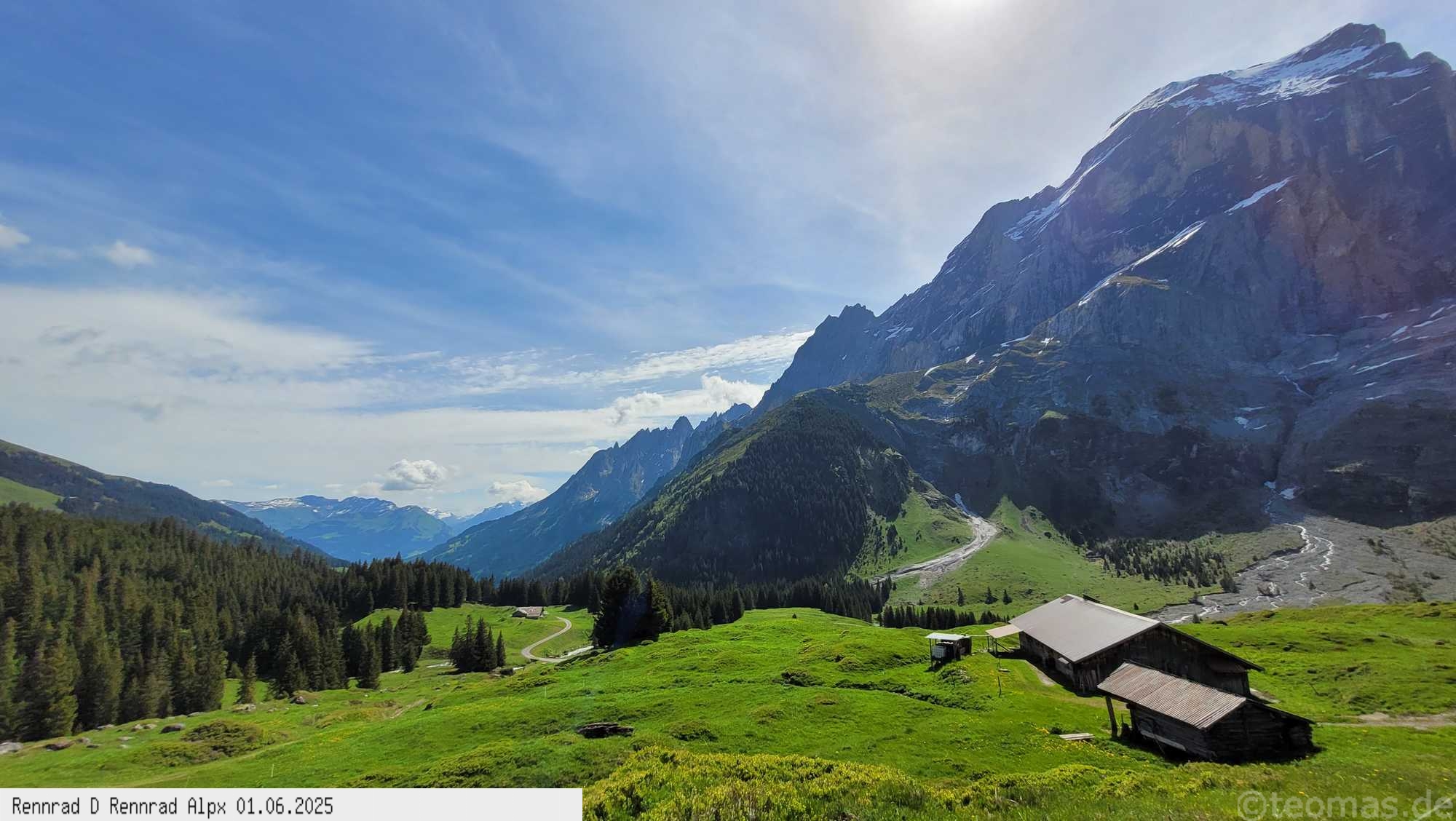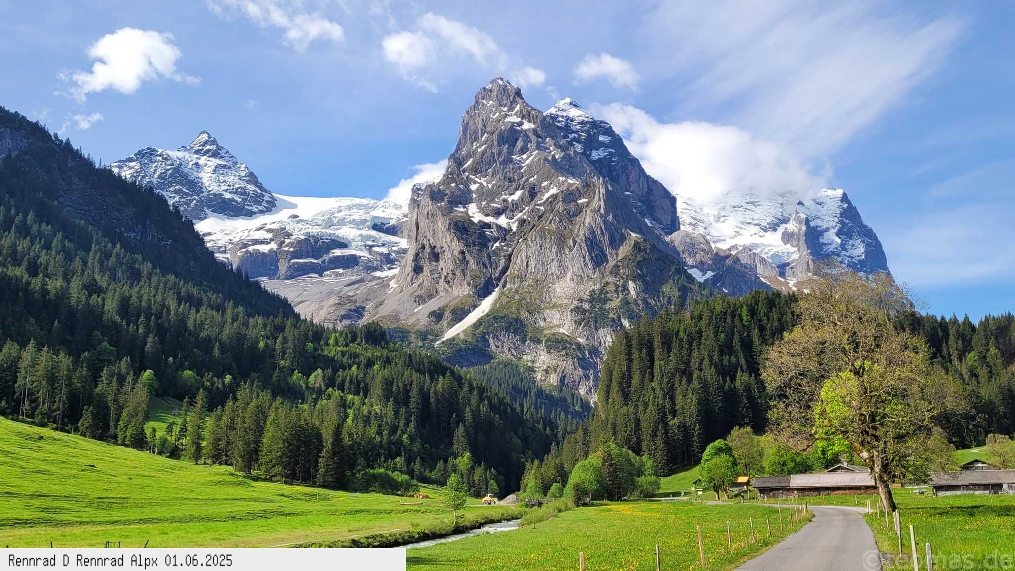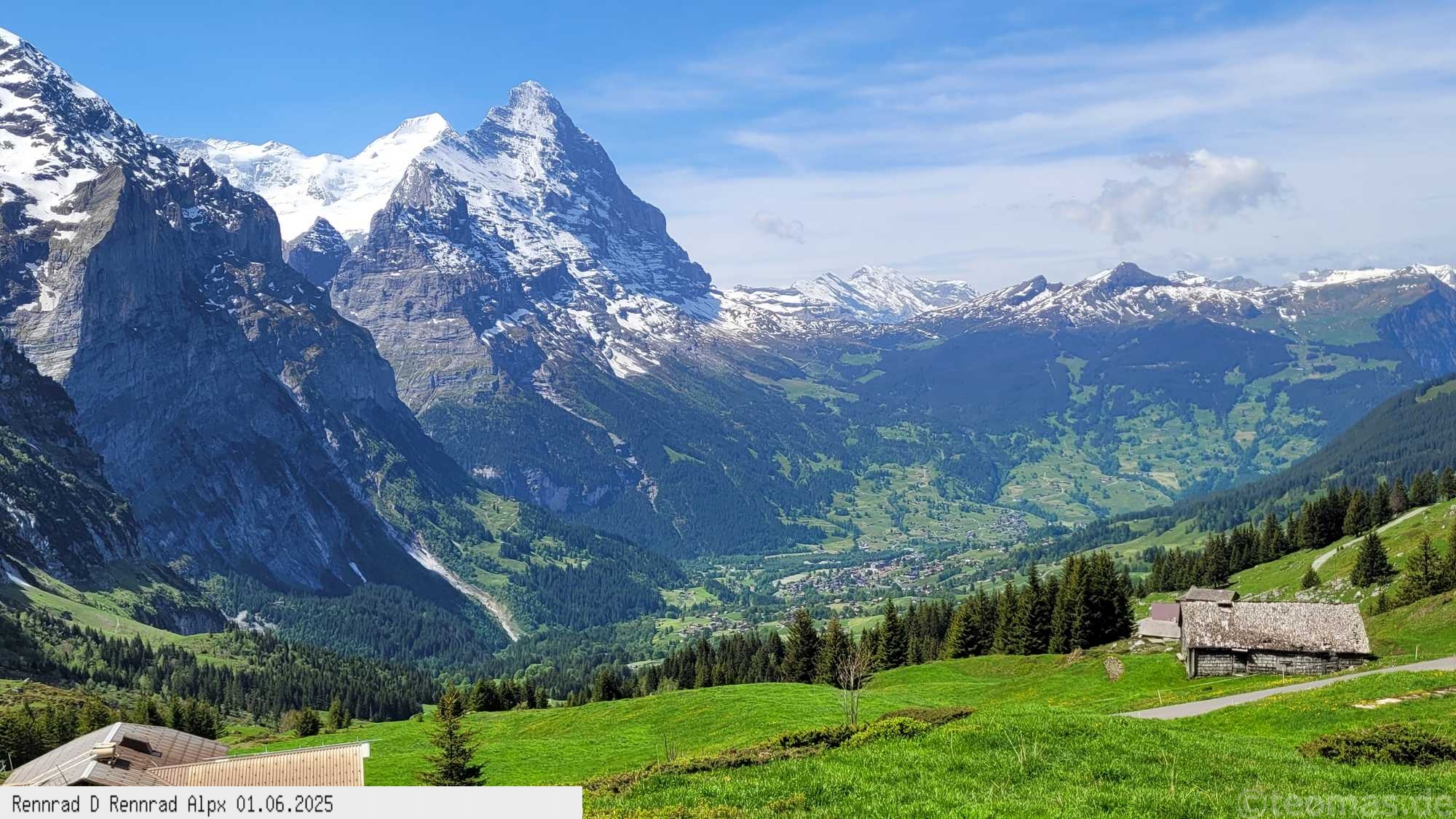 dahinter liegenden Gipfeln der Mönch und Jungfrau. Kurz vor Grindelwald bei der Abfahrt das Rad für einen Fotostopp in einem Feldweg Abzweig