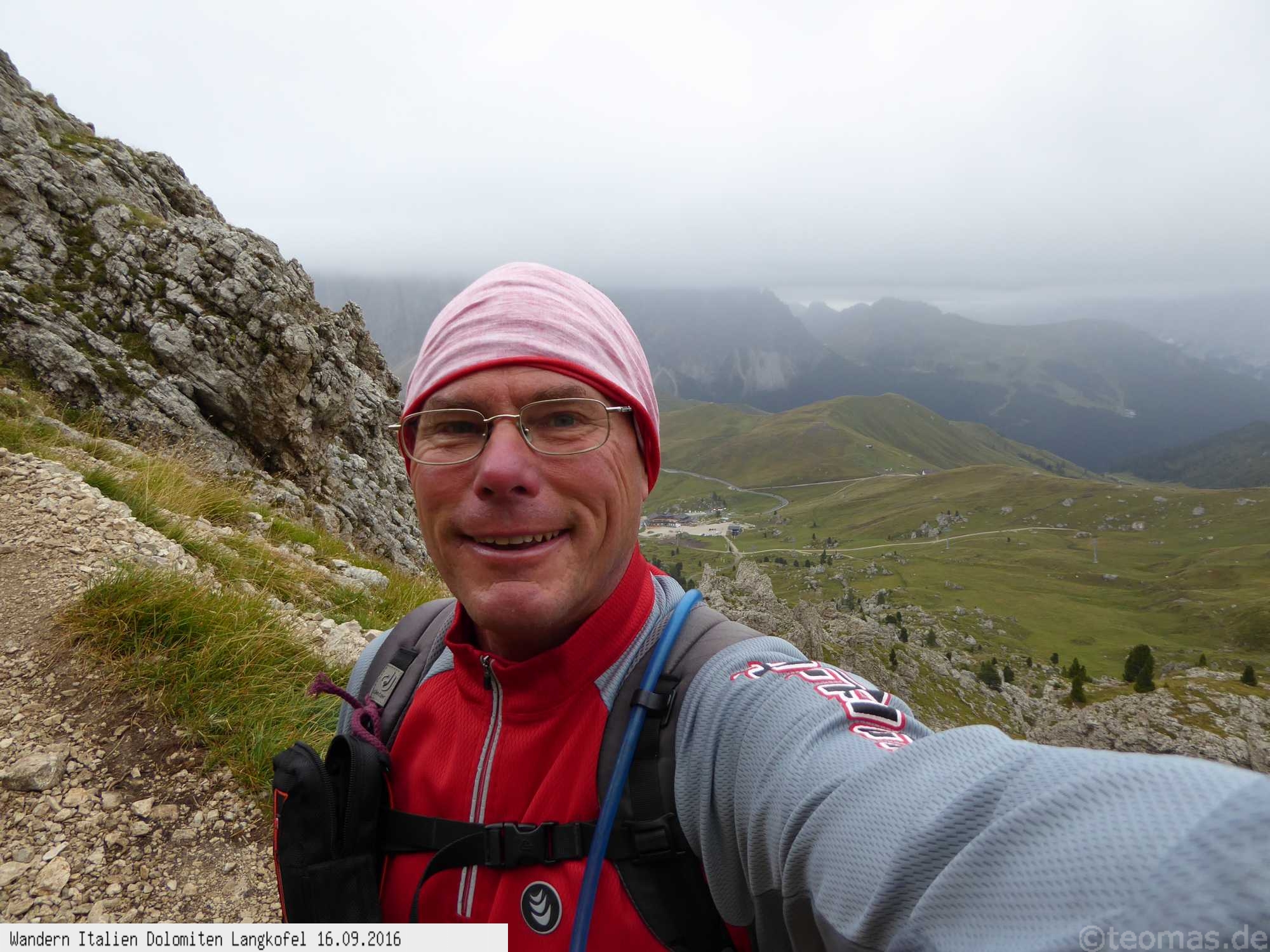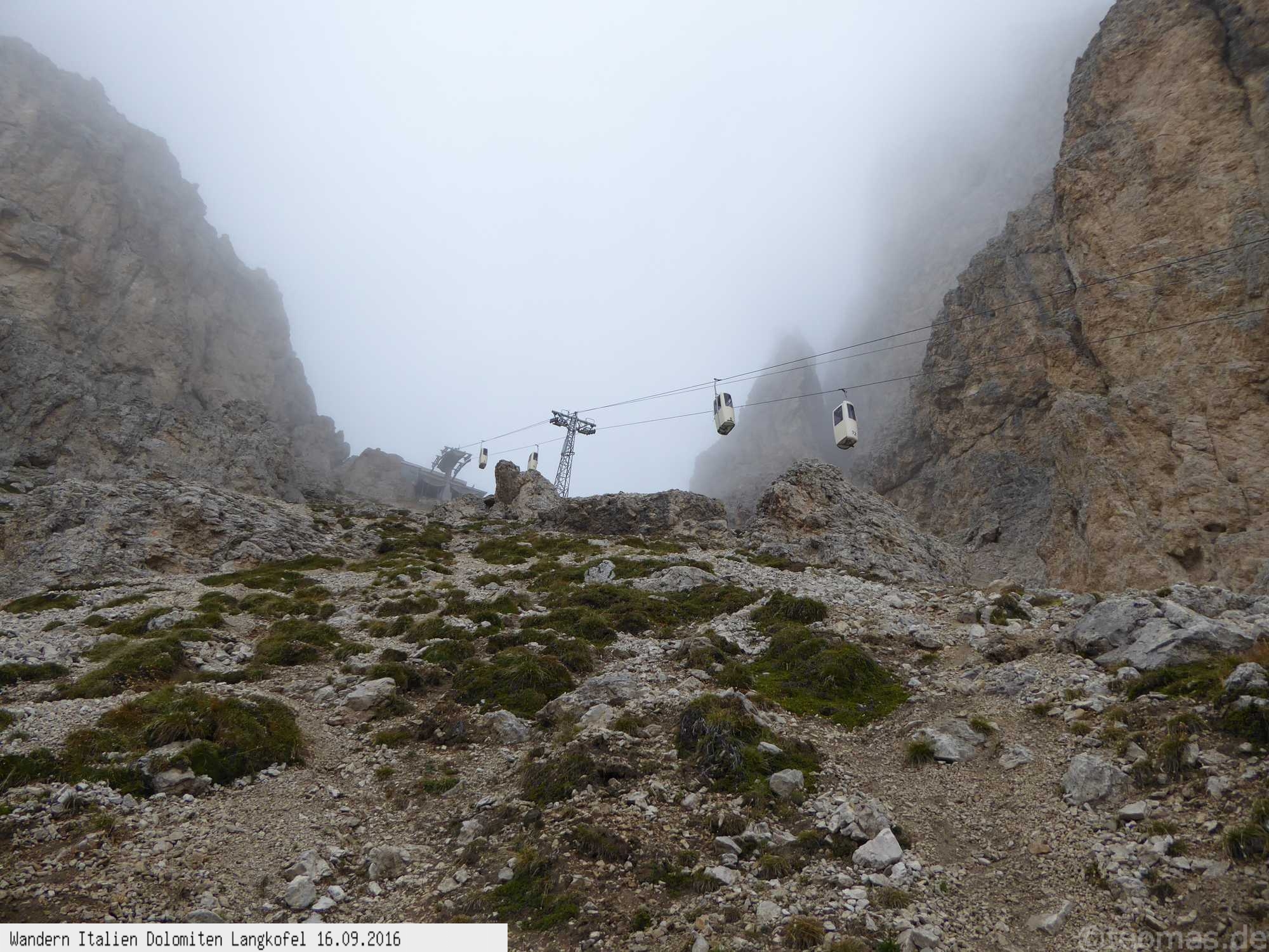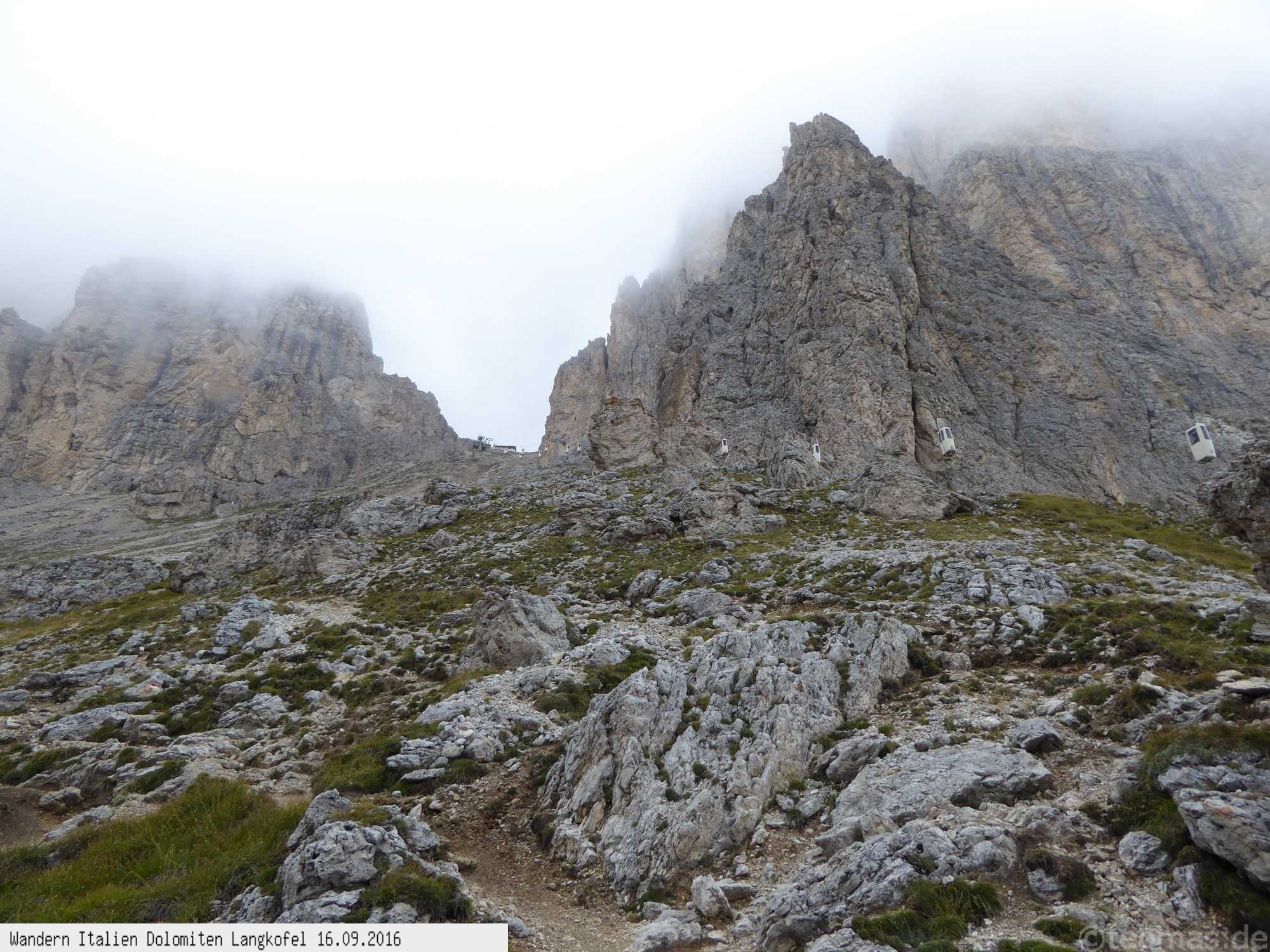 Vom Parkplatz unterhalb des Sella Joch startet die Wanderung zur Langkofelhütte. Mystische Stimmung bei Nebel!
